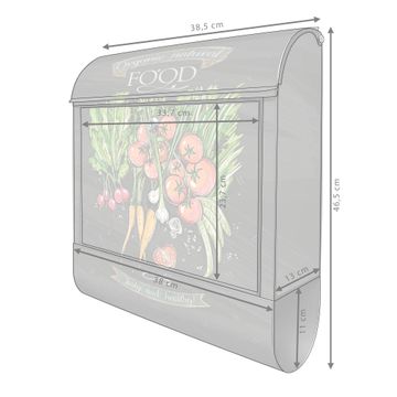DESIGN: Der Postkasten mit Motiv Motiv Gesund Und Lecker hat ein sehr ansprechendes und ausgefallenes Design, damit entlocken Sie Ihren Nachbarn und dem Postboten ein Lächeln. Heben Sie Sich von der tristen grauen Masse ab, ohne auf Funktionalität zu verzichten. DETAILS: Der Postkasten besteht aus pulverbeschichtetem Stahl. Er ist 38x46x12,5cm groß. Das Motiv besteht aus einer wetter- und UV-resistenten Folie, die mit einem Schutzlaminat überzogen ist, sodass der Briefkasten zusätzlich vor Kratzern geschützt ist. Der Briefkasten wird mit Montagematerial, zusätzlich zwei Schlüssel sowie einer Bohrschablone geliefert. NUTZEN: Sie können diesen Briefkasten sowohl als Wandbriefkasten montieren oder einen passenden Ständer kaufen und als Standbriefkasten einbetonieren. Die Größe bietet genügend Platz für Sendungen aller Art, der Einwurf fasst auch größere A4 Sendungen. BANJADO: Ihr Briefkasten wird in Sachsen in einer kleinen Manufaktur von Hand veredelt. Die Motivfolie ist lösungsmittelfrei und schutzlaminiert für einen langen Halt. Wir legen großen Wert auf die Verbindung von Funktionalität und Design. Sie erhalten Handarbeit aus Sachsen.