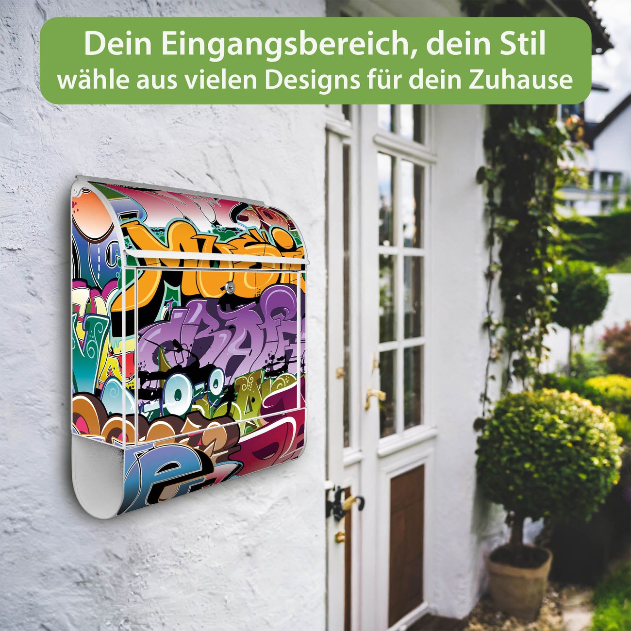 DESIGN: Der Postkasten mit Motiv Motiv Graffiti hat ein sehr ansprechendes und ausgefallenes Design, damit entlocken Sie Ihren Nachbarn und dem Postboten ein Lächeln. Heben Sie Sich von der tristen grauen Masse ab, ohne auf Funktionalität zu verzichten. DETAILS: Der Postkasten besteht aus pulverbeschichtetem Stahl. Er ist 38x46x12,5cm groß. Das Motiv besteht aus einer wetter- und UV-resistenten Folie, die mit einem Schutzlaminat überzogen ist, sodass der Briefkasten zusätzlich vor Kratzern geschützt ist. Der Briefkasten wird mit Montagematerial, zusätzlich zwei Schlüssel sowie einer Bohrschablone geliefert. NUTZEN: Sie können diesen Briefkasten sowohl als Wandbriefkasten montieren oder einen passenden Ständer kaufen und als Standbriefkasten einbetonieren. Die Größe bietet genügend Platz für Sendungen aller Art, der Einwurf fasst auch größere A4 Sendungen. BANJADO: Ihr Briefkasten wird in Sachsen in einer kleinen Manufaktur von Hand veredelt. Die Motivfolie ist lösungsmittelfrei und schutzlaminiert für einen langen Halt. Wir legen großen Wert auf die Verbindung von Funktionalität und Design. Sie erhalten Handarbeit aus Sachsen.