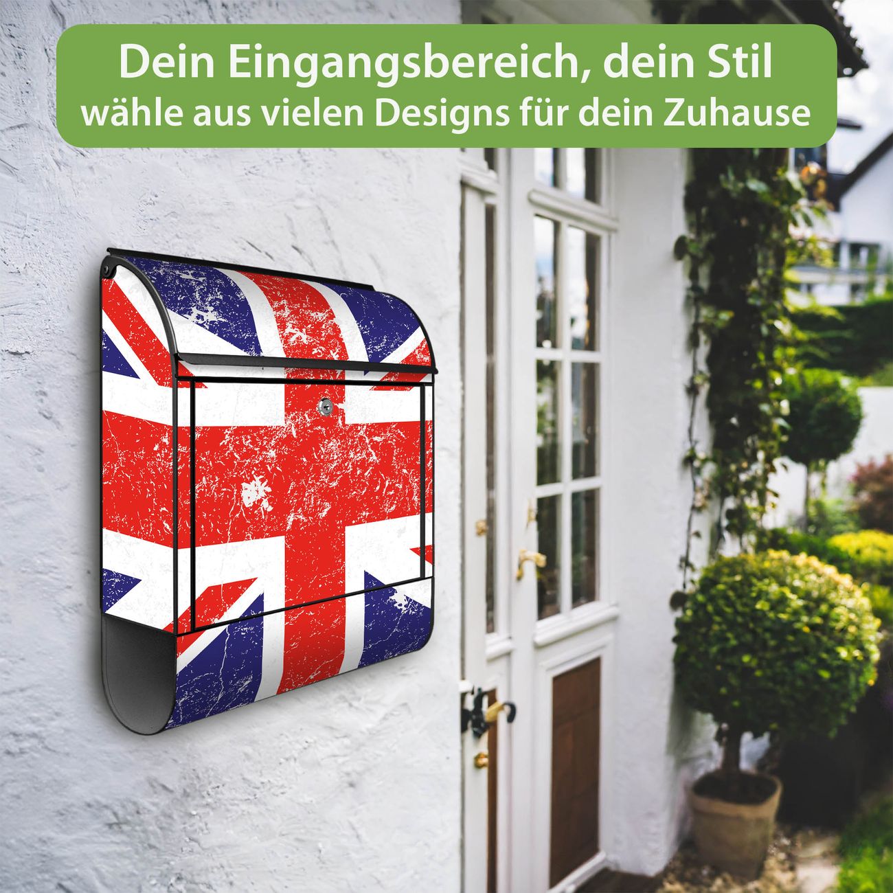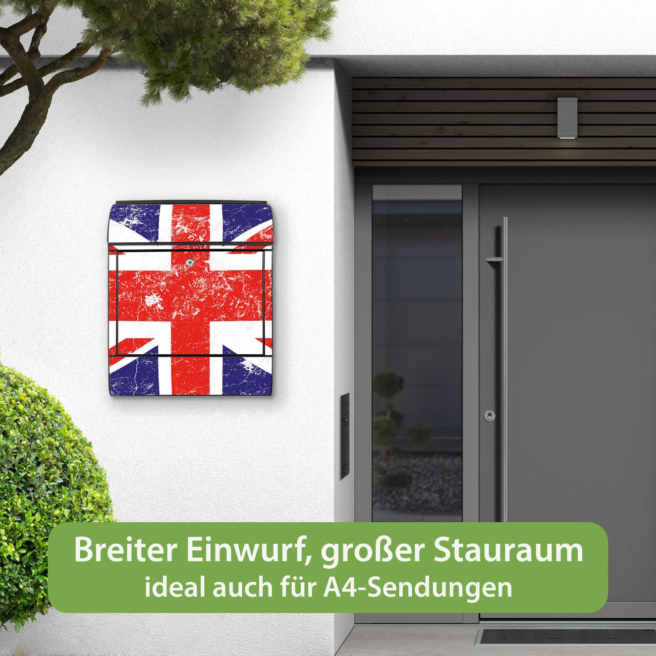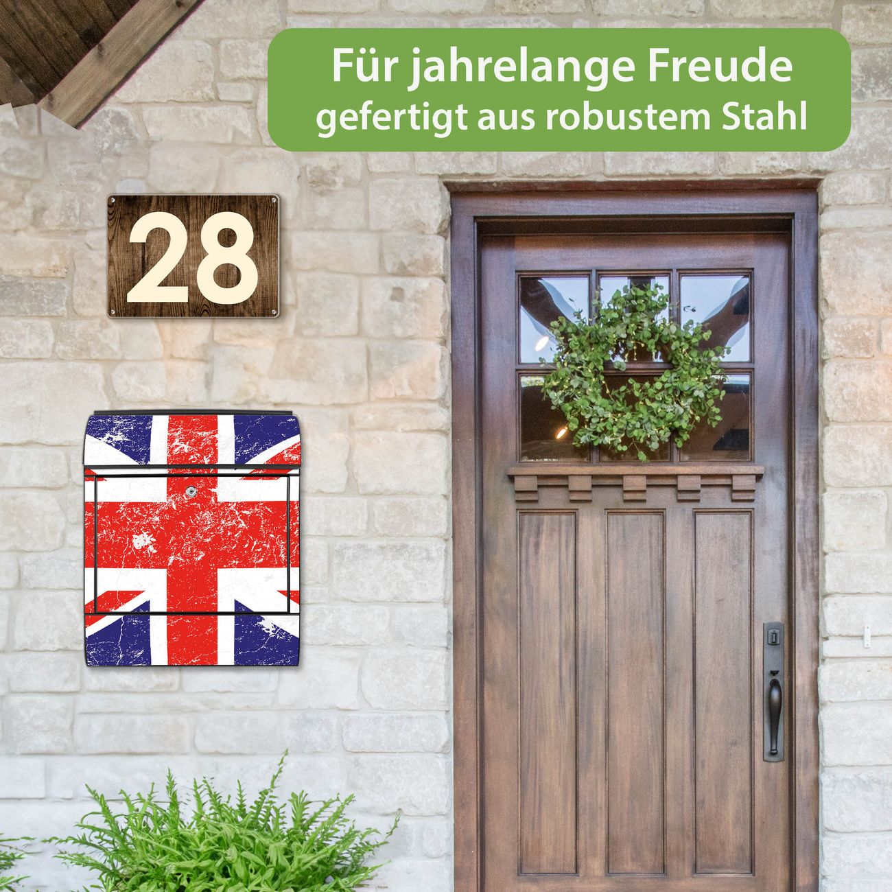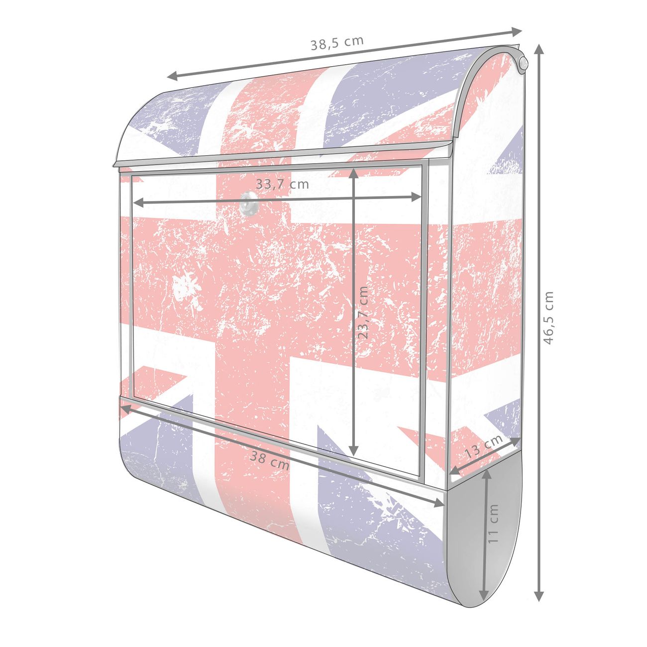 DESIGN: Der Postkasten mit Motiv Motiv Great Britain hat ein sehr ansprechendes und ausgefallenes Design, damit entlocken Sie Ihren Nachbarn und dem Postboten ein Lächeln. Heben Sie Sich von der tristen grauen Masse ab, ohne auf Funktionalität zu verzichten. DETAILS: Der Postkasten besteht aus pulverbeschichtetem Stahl. Er ist 38x46x12,5cm groß. Das Motiv besteht aus einer wetter- und UV-resistenten Folie, die mit einem Schutzlaminat überzogen ist, sodass der Briefkasten zusätzlich vor Kratzern geschützt ist. Der Briefkasten wird mit Montagematerial, zusätzlich zwei Schlüssel sowie einer Bohrschablone geliefert. NUTZEN: Sie können diesen Briefkasten sowohl als Wandbriefkasten montieren oder einen passenden Ständer kaufen und als Standbriefkasten einbetonieren. Die Größe bietet genügend Platz für Sendungen aller Art, der Einwurf fasst auch größere A4 Sendungen. BANJADO: Ihr Briefkasten wird in Sachsen in einer kleinen Manufaktur von Hand veredelt. Die Motivfolie ist lösungsmittelfrei und schutzlaminiert für einen langen Halt. Wir legen großen Wert auf die Verbindung von Funktionalität und Design. Sie erhalten Handarbeit aus Sachsen.