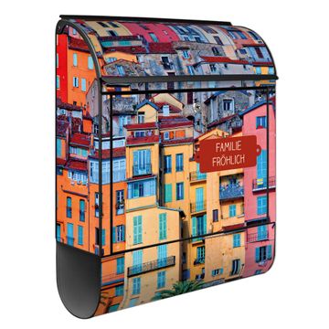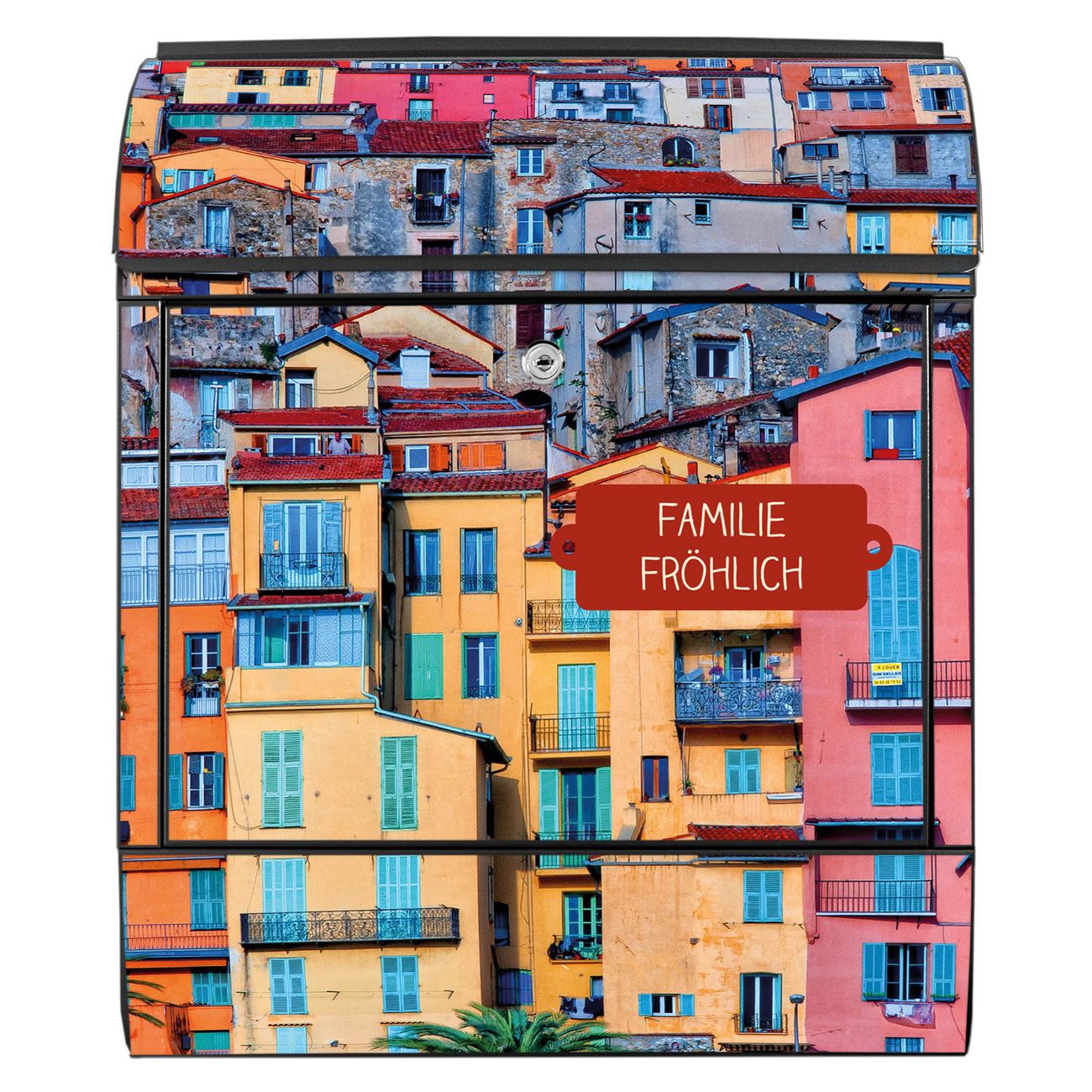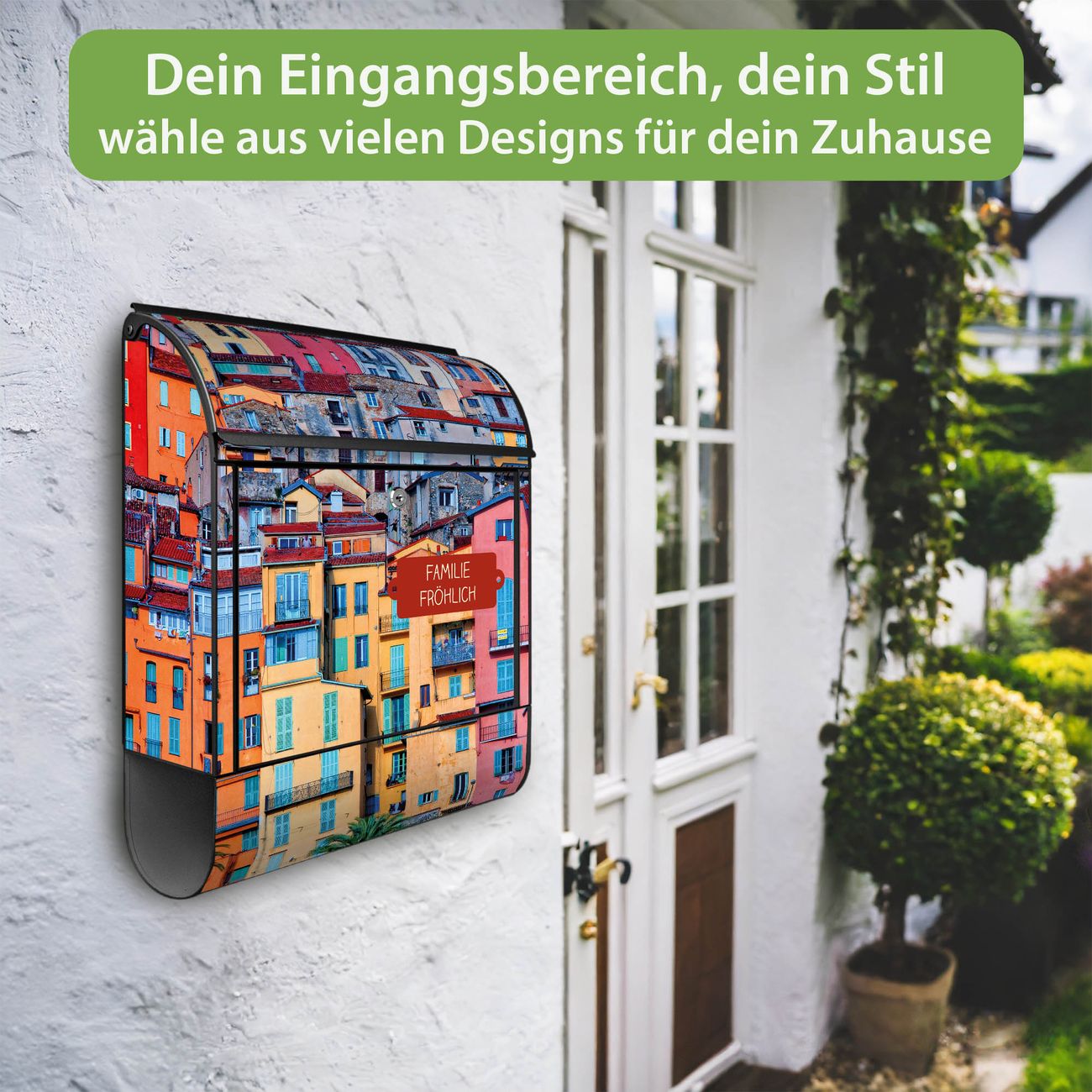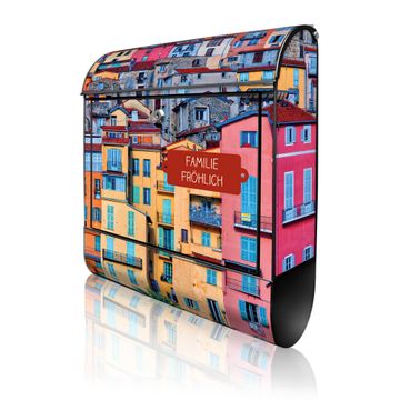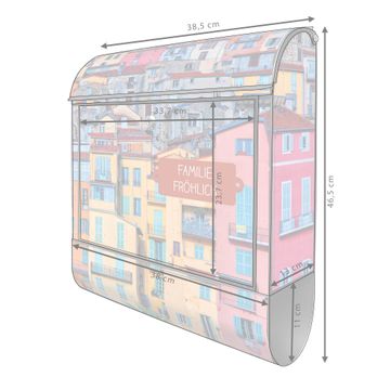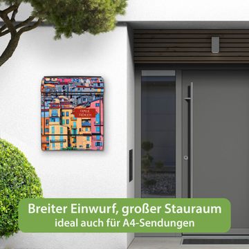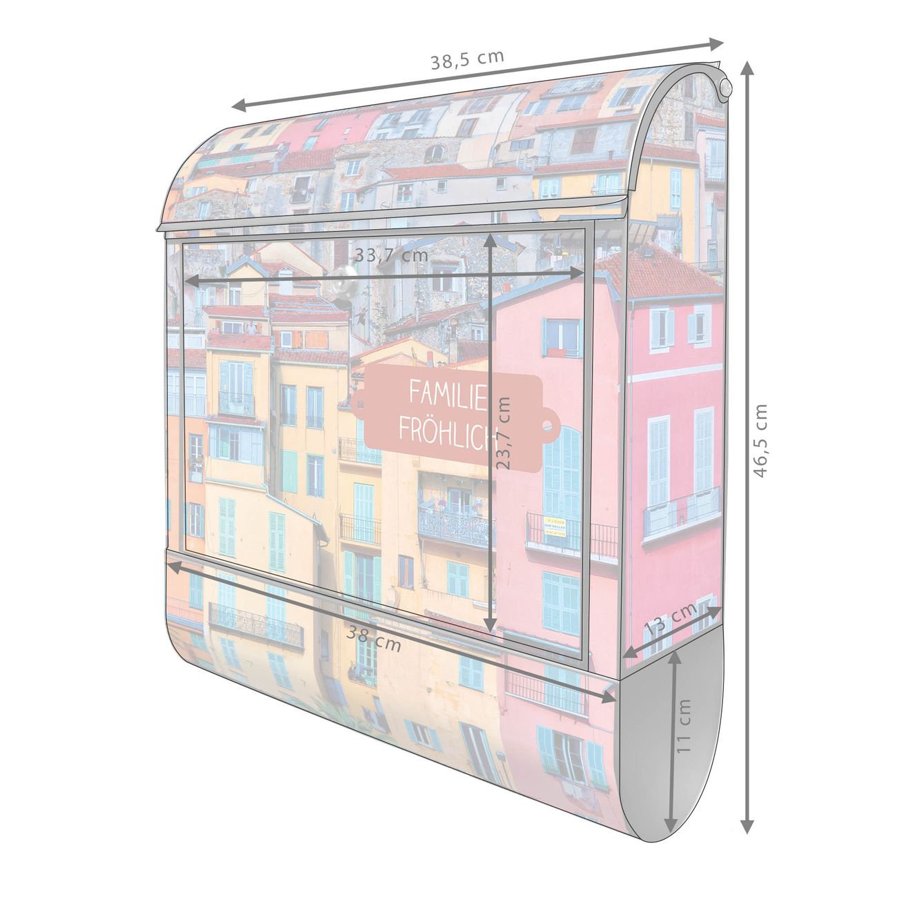 DESIGN: Der Postkasten mit Motiv Motiv Häuserberg hat ein sehr ansprechendes und ausgefallenes Design, damit entlocken Sie Ihren Nachbarn und dem Postboten ein Lächeln. Heben Sie Sich von der tristen grauen Masse ab, ohne auf Funktionalität zu verzichten. DETAILS: Der Postkasten besteht aus pulverbeschichtetem Stahl. Er ist 38x46x12,5cm groß. Das Motiv besteht aus einer wetter- und UV-resistenten Folie, die mit einem Schutzlaminat überzogen ist, sodass der Briefkasten zusätzlich vor Kratzern geschützt ist. Der Briefkasten wird mit Montagematerial, zusätzlich zwei Schlüssel sowie einer Bohrschablone geliefert. NUTZEN: Sie können diesen Briefkasten sowohl als Wandbriefkasten montieren oder einen passenden Ständer kaufen und als Standbriefkasten einbetonieren. Die Größe bietet genügend Platz für Sendungen aller Art, der Einwurf fasst auch größere A4 Sendungen. BANJADO: Ihr Briefkasten wird in Sachsen in einer kleinen Manufaktur von Hand veredelt. Die Motivfolie ist lösungsmittelfrei und schutzlaminiert für einen langen Halt. Wir legen großen Wert auf die Verbindung von Funktionalität und Design. Sie erhalten Handarbeit aus Sachsen.