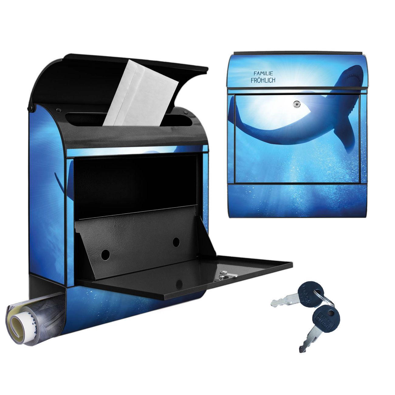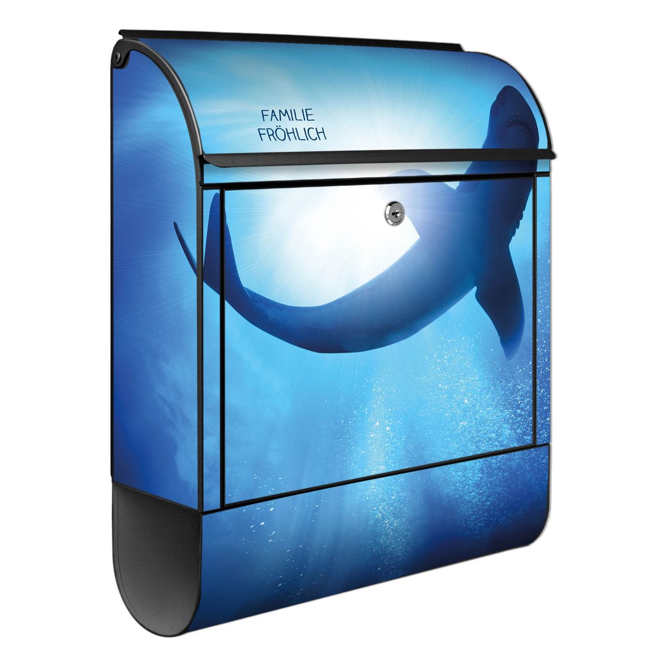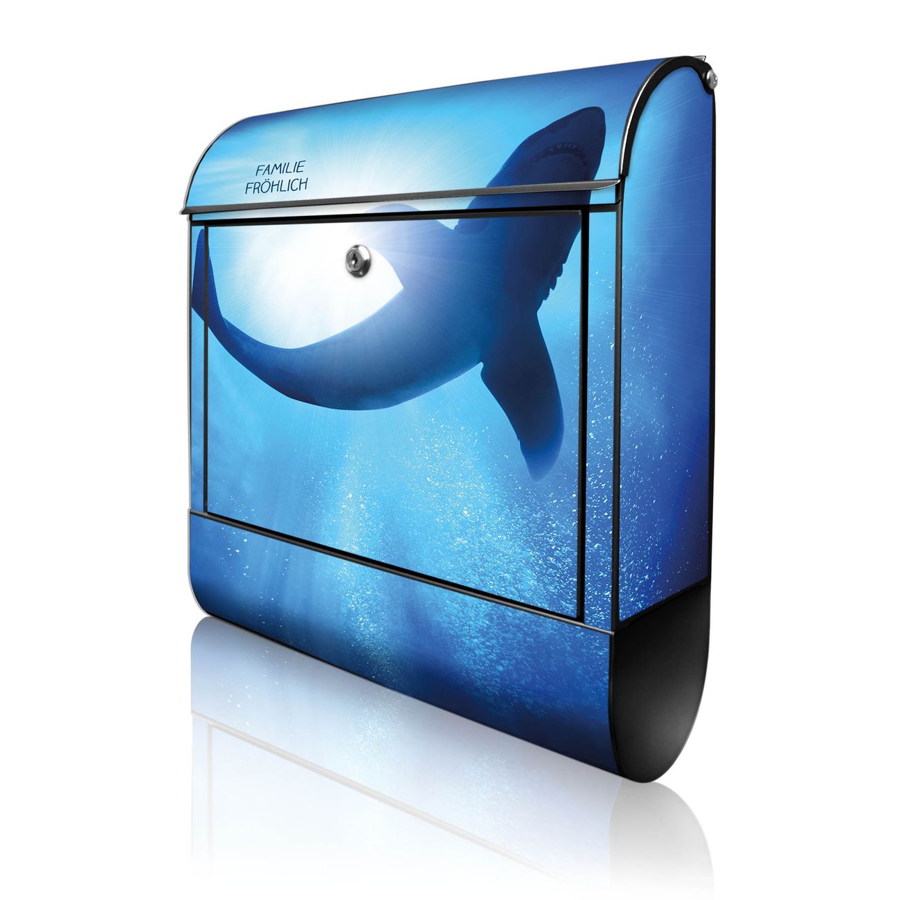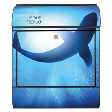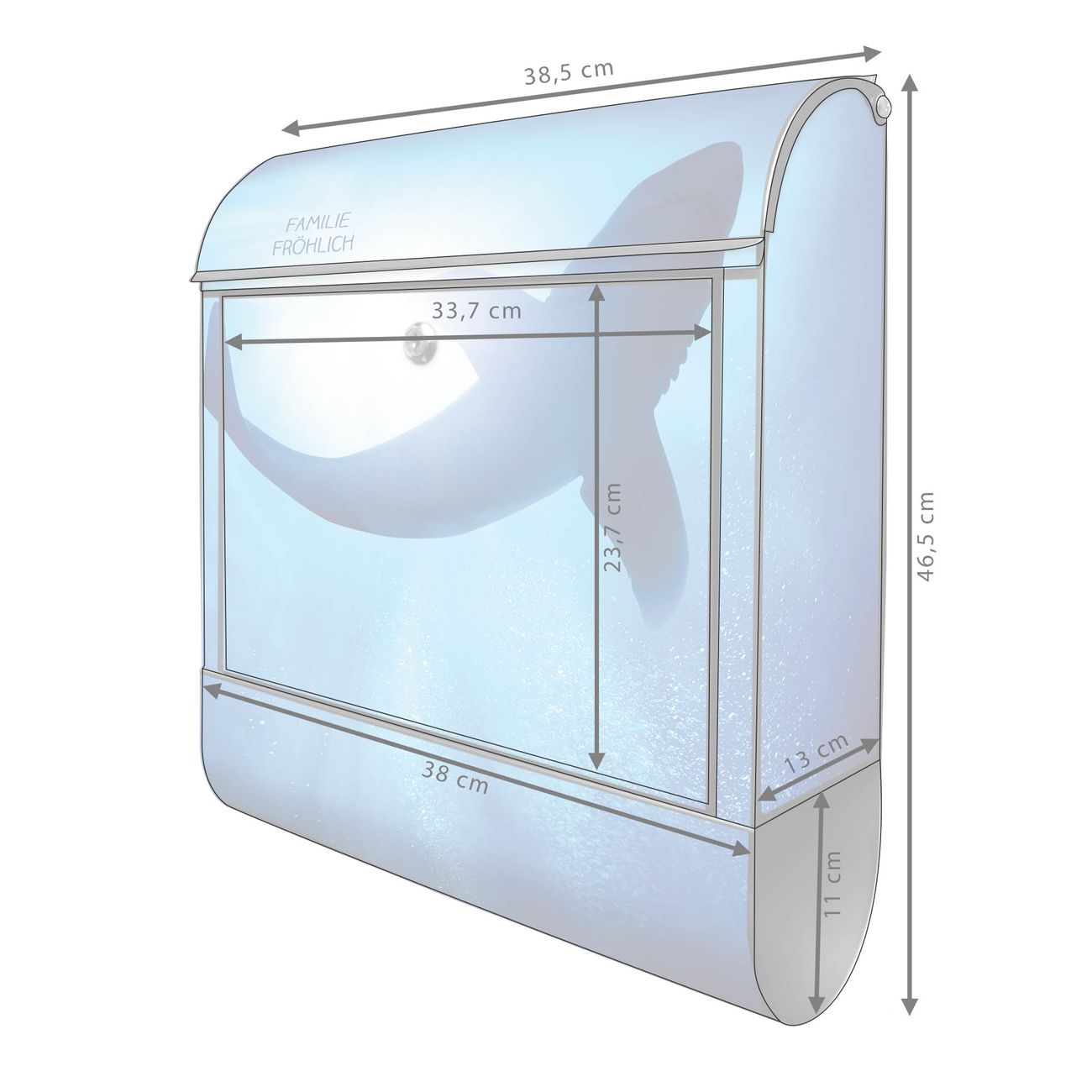 DESIGN: Der Postkasten mit Motiv Motiv Hai hat ein sehr ansprechendes und ausgefallenes Design, damit entlocken Sie Ihren Nachbarn und dem Postboten ein Lächeln. Heben Sie Sich von der tristen grauen Masse ab, ohne auf Funktionalität zu verzichten. DETAILS: Der Postkasten besteht aus pulverbeschichtetem Stahl. Er ist 38x46x12,5cm groß. Das Motiv besteht aus einer wetter- und UV-resistenten Folie, die mit einem Schutzlaminat überzogen ist, sodass der Briefkasten zusätzlich vor Kratzern geschützt ist. Der Briefkasten wird mit Montagematerial, zusätzlich zwei Schlüssel sowie einer Bohrschablone geliefert. NUTZEN: Sie können diesen Briefkasten sowohl als Wandbriefkasten montieren oder einen passenden Ständer kaufen und als Standbriefkasten einbetonieren. Die Größe bietet genügend Platz für Sendungen aller Art, der Einwurf fasst auch größere A4 Sendungen. BANJADO: Ihr Briefkasten wird in Sachsen in einer kleinen Manufaktur von Hand veredelt. Die Motivfolie ist lösungsmittelfrei und schutzlaminiert für einen langen Halt. Wir legen großen Wert auf die Verbindung von Funktionalität und Design. Sie erhalten Handarbeit aus Sachsen.