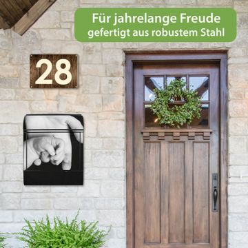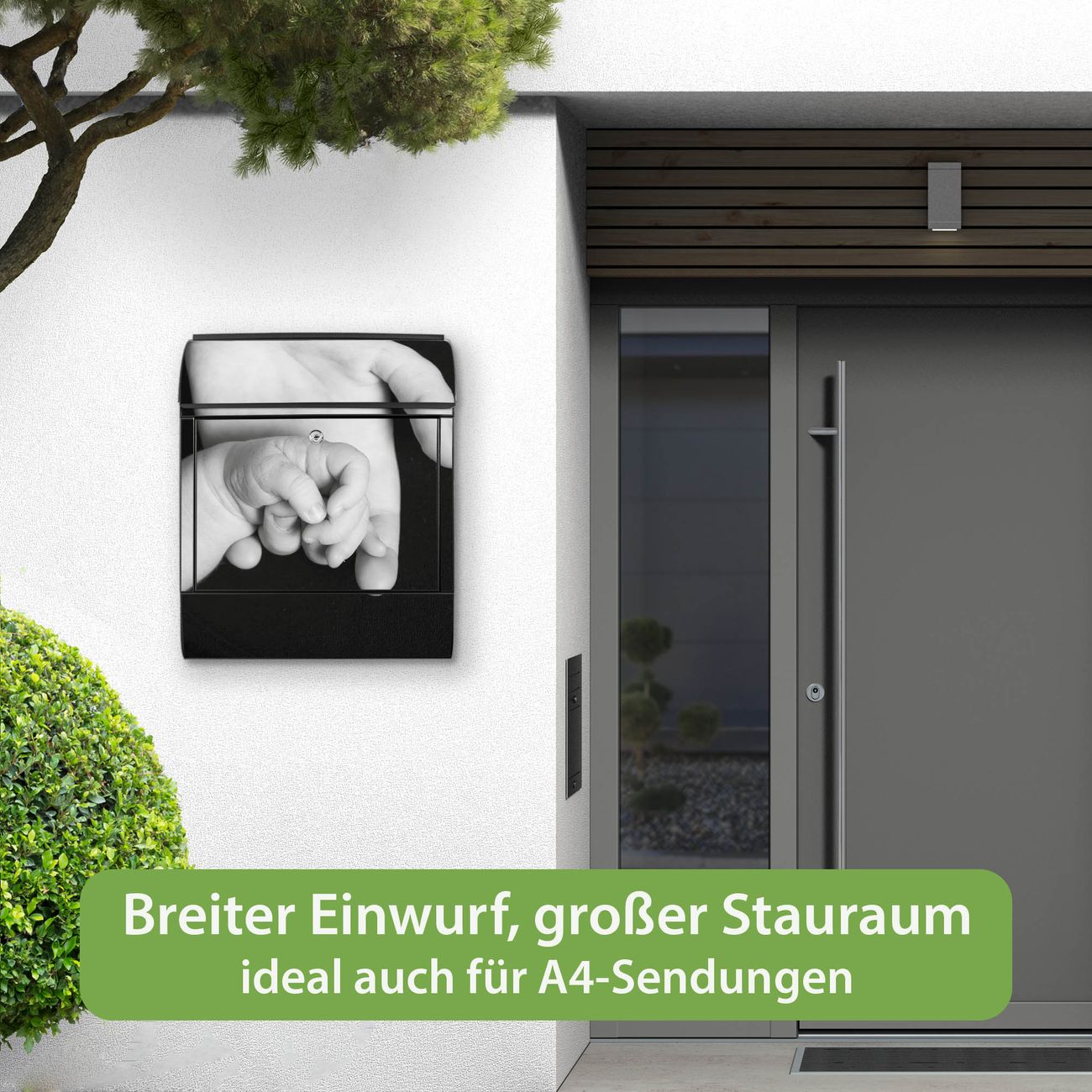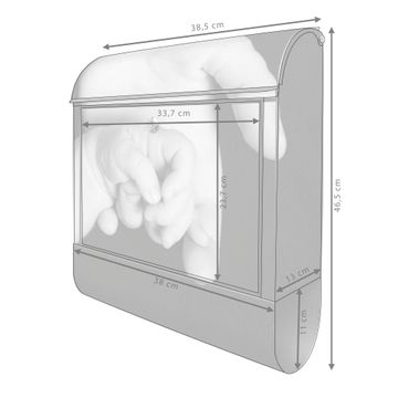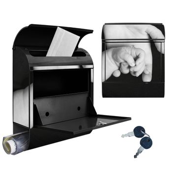 DESIGN: Der Postkasten mit Motiv Motiv Hands hat ein sehr ansprechendes und ausgefallenes Design, damit entlocken Sie Ihren Nachbarn und dem Postboten ein Lächeln. Heben Sie Sich von der tristen grauen Masse ab, ohne auf Funktionalität zu verzichten. DETAILS: Der Postkasten besteht aus pulverbeschichtetem Stahl. Er ist 38x46x12,5cm groß. Das Motiv besteht aus einer wetter- und UV-resistenten Folie, die mit einem Schutzlaminat überzogen ist, sodass der Briefkasten zusätzlich vor Kratzern geschützt ist. Der Briefkasten wird mit Montagematerial, zusätzlich zwei Schlüssel sowie einer Bohrschablone geliefert. NUTZEN: Sie können diesen Briefkasten sowohl als Wandbriefkasten montieren oder einen passenden Ständer kaufen und als Standbriefkasten einbetonieren. Die Größe bietet genügend Platz für Sendungen aller Art, der Einwurf fasst auch größere A4 Sendungen. BANJADO: Ihr Briefkasten wird in Sachsen in einer kleinen Manufaktur von Hand veredelt. Die Motivfolie ist lösungsmittelfrei und schutzlaminiert für einen langen Halt. Wir legen großen Wert auf die Verbindung von Funktionalität und Design. Sie erhalten Handarbeit aus Sachsen.