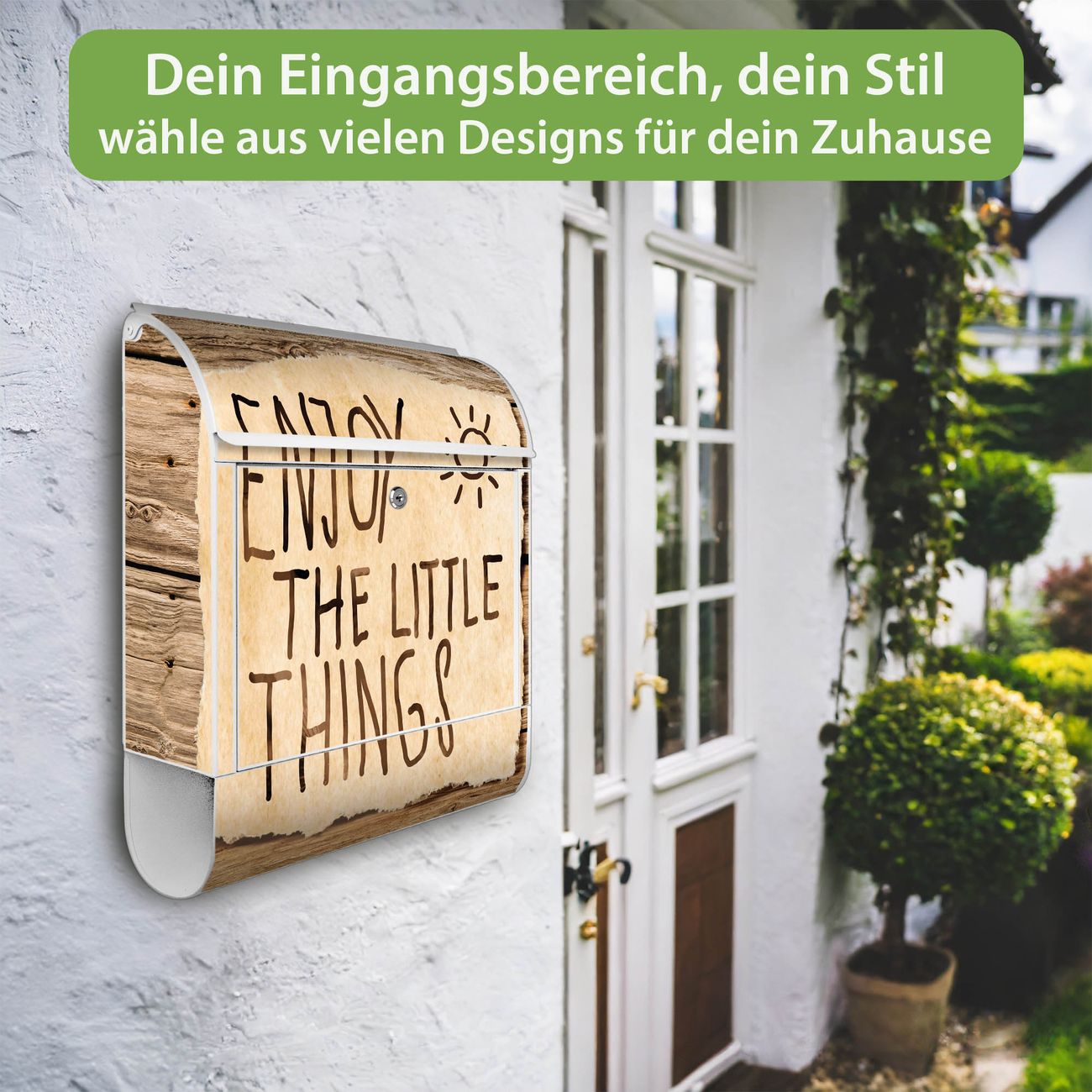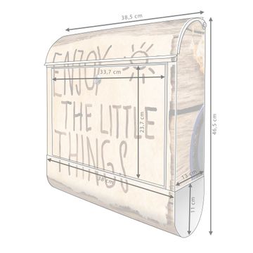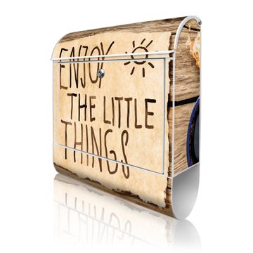 DESIGN: Der Postkasten mit Motiv Motiv Happy Day hat ein sehr ansprechendes und ausgefallenes Design, damit entlocken Sie Ihren Nachbarn und dem Postboten ein Lächeln. Heben Sie Sich von der tristen grauen Masse ab, ohne auf Funktionalität zu verzichten. DETAILS: Der Postkasten besteht aus pulverbeschichtetem Stahl. Er ist 38x46x12,5cm groß. Das Motiv besteht aus einer wetter- und UV-resistenten Folie, die mit einem Schutzlaminat überzogen ist, sodass der Briefkasten zusätzlich vor Kratzern geschützt ist. Der Briefkasten wird mit Montagematerial, zusätzlich zwei Schlüssel sowie einer Bohrschablone geliefert. NUTZEN: Sie können diesen Briefkasten sowohl als Wandbriefkasten montieren oder einen passenden Ständer kaufen und als Standbriefkasten einbetonieren. Die Größe bietet genügend Platz für Sendungen aller Art, der Einwurf fasst auch größere A4 Sendungen. BANJADO: Ihr Briefkasten wird in Sachsen in einer kleinen Manufaktur von Hand veredelt. Die Motivfolie ist lösungsmittelfrei und schutzlaminiert für einen langen Halt. Wir legen großen Wert auf die Verbindung von Funktionalität und Design. Sie erhalten Handarbeit aus Sachsen.