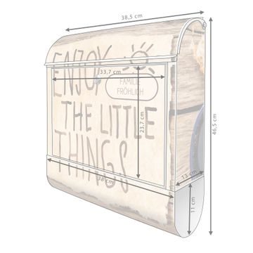 DESIGN: Der Postkasten mit Motiv Motiv Happy Day hat ein sehr ansprechendes und ausgefallenes Design, damit entlocken Sie Ihren Nachbarn und dem Postboten ein Lächeln. Heben Sie Sich von der tristen grauen Masse ab, ohne auf Funktionalität zu verzichten. DETAILS: Der Postkasten besteht aus pulverbeschichtetem Stahl. Er ist 38x46x12,5cm groß. Das Motiv besteht aus einer wetter- und UV-resistenten Folie, die mit einem Schutzlaminat überzogen ist, sodass der Briefkasten zusätzlich vor Kratzern geschützt ist. Der Briefkasten wird mit Montagematerial, zusätzlich zwei Schlüssel sowie einer Bohrschablone geliefert. NUTZEN: Sie können diesen Briefkasten sowohl als Wandbriefkasten montieren oder einen passenden Ständer kaufen und als Standbriefkasten einbetonieren. Die Größe bietet genügend Platz für Sendungen aller Art, der Einwurf fasst auch größere A4 Sendungen. BANJADO: Ihr Briefkasten wird in Sachsen in einer kleinen Manufaktur von Hand veredelt. Die Motivfolie ist lösungsmittelfrei und schutzlaminiert für einen langen Halt. Wir legen großen Wert auf die Verbindung von Funktionalität und Design. Sie erhalten Handarbeit aus Sachsen.