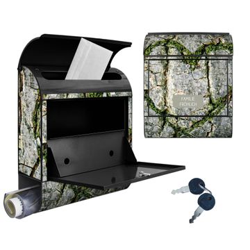 DESIGN: Der Postkasten mit Motiv Motiv Herz Aus Moos hat ein sehr ansprechendes und ausgefallenes Design, damit entlocken Sie Ihren Nachbarn und dem Postboten ein Lächeln. Heben Sie Sich von der tristen grauen Masse ab, ohne auf Funktionalität zu verzichten. DETAILS: Der Postkasten besteht aus pulverbeschichtetem Stahl. Er ist 38x46x12,5cm groß. Das Motiv besteht aus einer wetter- und UV-resistenten Folie, die mit einem Schutzlaminat überzogen ist, sodass der Briefkasten zusätzlich vor Kratzern geschützt ist. Der Briefkasten wird mit Montagematerial, zusätzlich zwei Schlüssel sowie einer Bohrschablone geliefert. NUTZEN: Sie können diesen Briefkasten sowohl als Wandbriefkasten montieren oder einen passenden Ständer kaufen und als Standbriefkasten einbetonieren. Die Größe bietet genügend Platz für Sendungen aller Art, der Einwurf fasst auch größere A4 Sendungen. BANJADO: Ihr Briefkasten wird in Sachsen in einer kleinen Manufaktur von Hand veredelt. Die Motivfolie ist lösungsmittelfrei und schutzlaminiert für einen langen Halt. Wir legen großen Wert auf die Verbindung von Funktionalität und Design. Sie erhalten Handarbeit aus Sachsen.