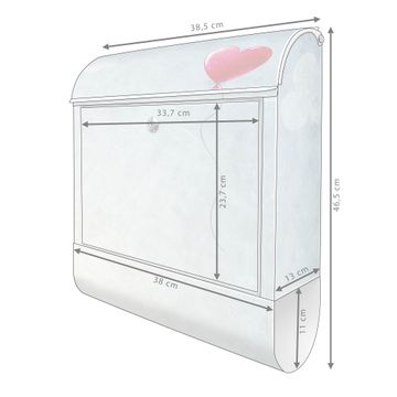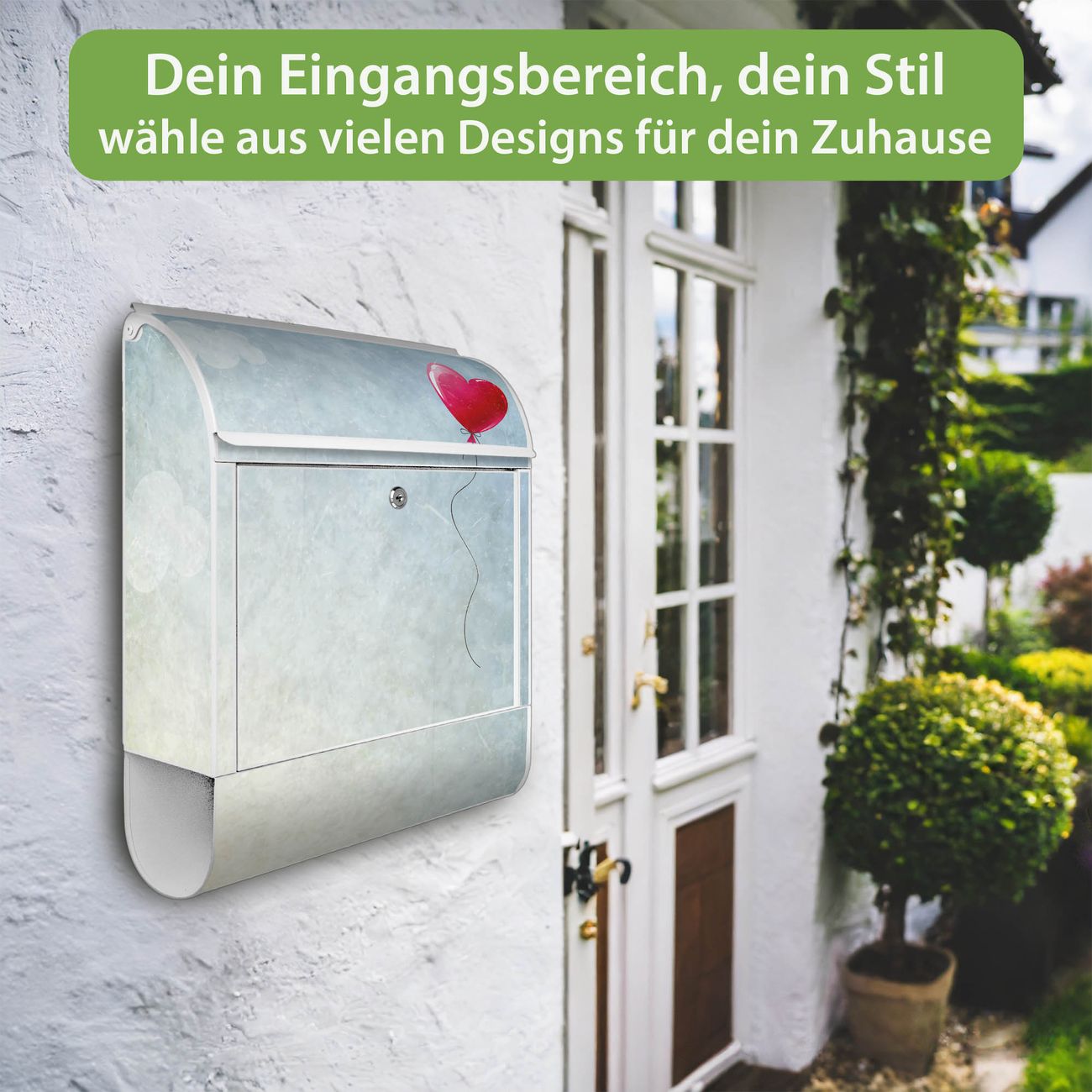 DESIGN: Der Postkasten mit Motiv Motiv Herzballon hat ein sehr ansprechendes und ausgefallenes Design, damit entlocken Sie Ihren Nachbarn und dem Postboten ein Lächeln. Heben Sie Sich von der tristen grauen Masse ab, ohne auf Funktionalität zu verzichten. DETAILS: Der Postkasten besteht aus pulverbeschichtetem Stahl. Er ist 38x46x12,5cm groß. Das Motiv besteht aus einer wetter- und UV-resistenten Folie, die mit einem Schutzlaminat überzogen ist, sodass der Briefkasten zusätzlich vor Kratzern geschützt ist. Der Briefkasten wird mit Montagematerial, zusätzlich zwei Schlüssel sowie einer Bohrschablone geliefert. NUTZEN: Sie können diesen Briefkasten sowohl als Wandbriefkasten montieren oder einen passenden Ständer kaufen und als Standbriefkasten einbetonieren. Die Größe bietet genügend Platz für Sendungen aller Art, der Einwurf fasst auch größere A4 Sendungen. BANJADO: Ihr Briefkasten wird in Sachsen in einer kleinen Manufaktur von Hand veredelt. Die Motivfolie ist lösungsmittelfrei und schutzlaminiert für einen langen Halt. Wir legen großen Wert auf die Verbindung von Funktionalität und Design. Sie erhalten Handarbeit aus Sachsen.