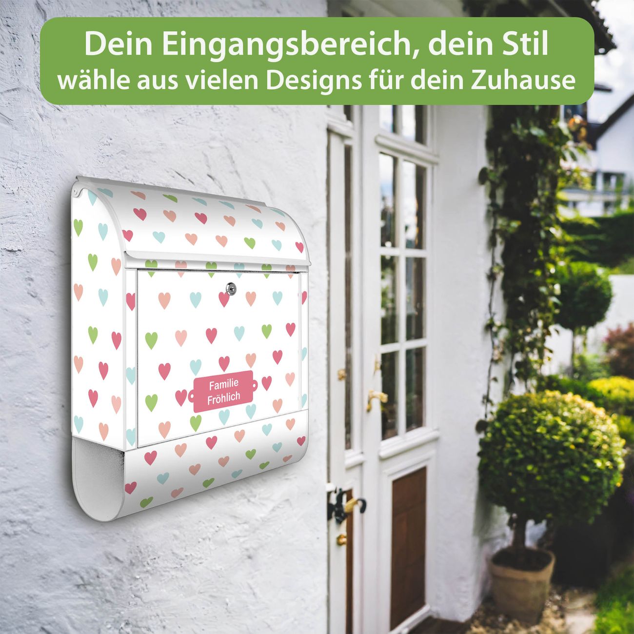 DESIGN: Der Postkasten mit Motiv Motiv Herzen Auf Weiß hat ein sehr ansprechendes und ausgefallenes Design, damit entlocken Sie Ihren Nachbarn und dem Postboten ein Lächeln. Heben Sie Sich von der tristen grauen Masse ab, ohne auf Funktionalität zu verzichten. DETAILS: Der Postkasten besteht aus pulverbeschichtetem Stahl. Er ist 38x46x12,5cm groß. Das Motiv besteht aus einer wetter- und UV-resistenten Folie, die mit einem Schutzlaminat überzogen ist, sodass der Briefkasten zusätzlich vor Kratzern geschützt ist. Der Briefkasten wird mit Montagematerial, zusätzlich zwei Schlüssel sowie einer Bohrschablone geliefert. NUTZEN: Sie können diesen Briefkasten sowohl als Wandbriefkasten montieren oder einen passenden Ständer kaufen und als Standbriefkasten einbetonieren. Die Größe bietet genügend Platz für Sendungen aller Art, der Einwurf fasst auch größere A4 Sendungen. BANJADO: Ihr Briefkasten wird in Sachsen in einer kleinen Manufaktur von Hand veredelt. Die Motivfolie ist lösungsmittelfrei und schutzlaminiert für einen langen Halt. Wir legen großen Wert auf die Verbindung von Funktionalität und Design. Sie erhalten Handarbeit aus Sachsen.