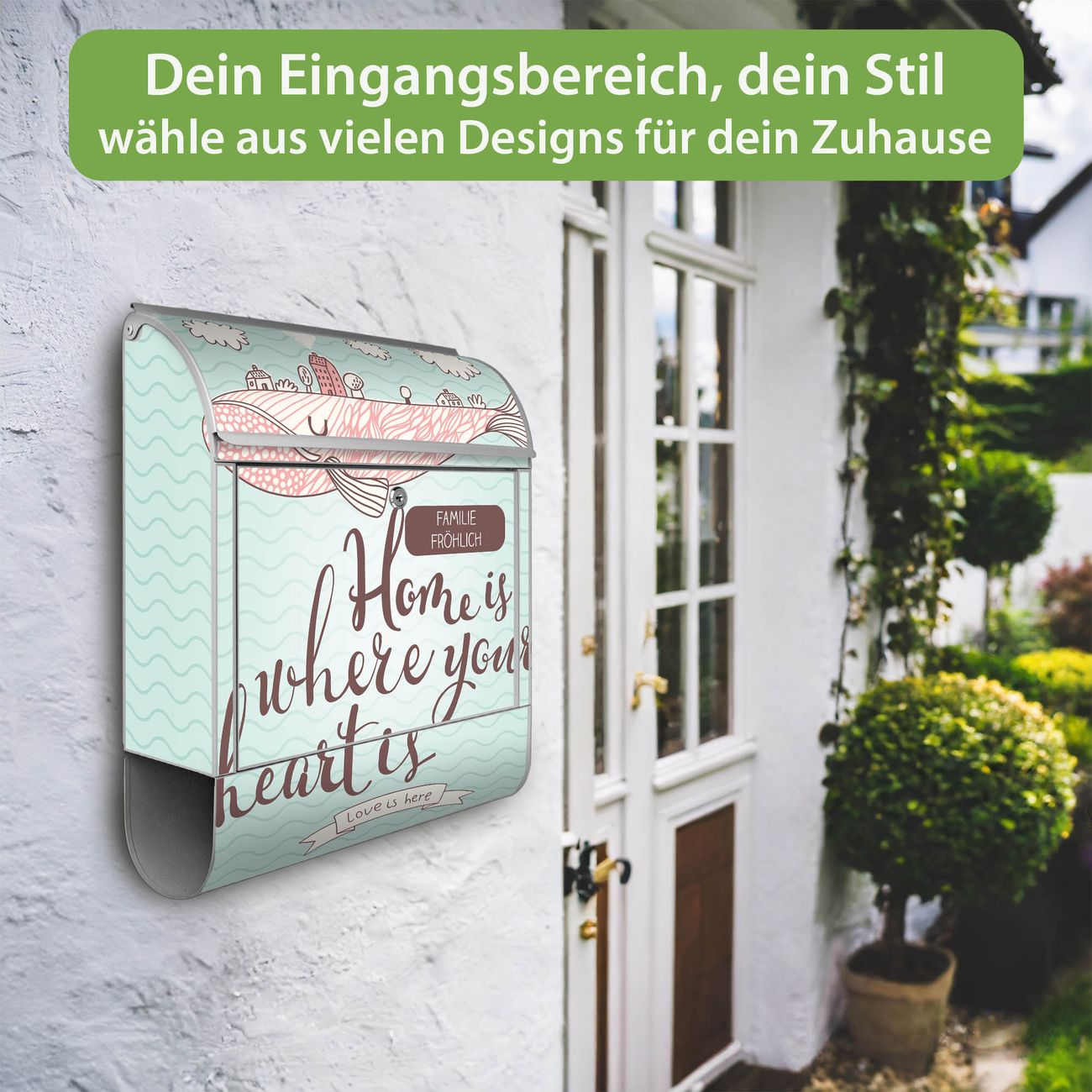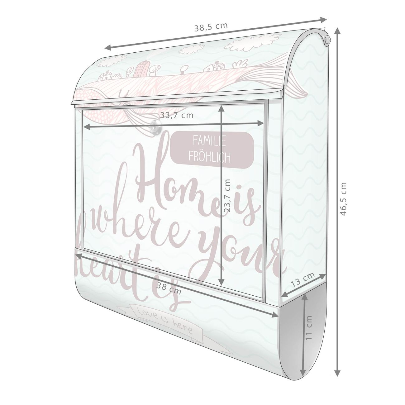 DESIGN: Der Postkasten mit Motiv Motiv Herzensangelegenheit hat ein sehr ansprechendes und ausgefallenes Design, damit entlocken Sie Ihren Nachbarn und dem Postboten ein Lächeln. Heben Sie Sich von der tristen grauen Masse ab, ohne auf Funktionalität zu verzichten. DETAILS: Der Postkasten besteht aus pulverbeschichtetem Stahl. Er ist 38x46x12,5cm groß. Das Motiv besteht aus einer wetter- und UV-resistenten Folie, die mit einem Schutzlaminat überzogen ist, sodass der Briefkasten zusätzlich vor Kratzern geschützt ist. Der Briefkasten wird mit Montagematerial, zusätzlich zwei Schlüssel sowie einer Bohrschablone geliefert. NUTZEN: Sie können diesen Briefkasten sowohl als Wandbriefkasten montieren oder einen passenden Ständer kaufen und als Standbriefkasten einbetonieren. Die Größe bietet genügend Platz für Sendungen aller Art, der Einwurf fasst auch größere A4 Sendungen. BANJADO: Ihr Briefkasten wird in Sachsen in einer kleinen Manufaktur von Hand veredelt. Die Motivfolie ist lösungsmittelfrei und schutzlaminiert für einen langen Halt. Wir legen großen Wert auf die Verbindung von Funktionalität und Design. Sie erhalten Handarbeit aus Sachsen.