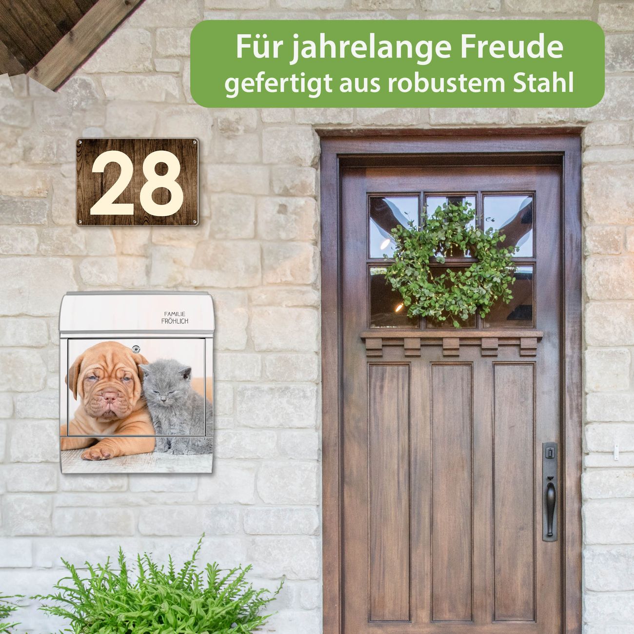 DESIGN: Der Postkasten mit Motiv Motiv Hund und Katze hat ein sehr ansprechendes und ausgefallenes Design, damit entlocken Sie Ihren Nachbarn und dem Postboten ein Lächeln. Heben Sie Sich von der tristen grauen Masse ab, ohne auf Funktionalität zu verzichten. DETAILS: Der Postkasten besteht aus pulverbeschichtetem Stahl. Er ist 38x46x12,5cm groß. Das Motiv besteht aus einer wetter- und UV-resistenten Folie, die mit einem Schutzlaminat überzogen ist, sodass der Briefkasten zusätzlich vor Kratzern geschützt ist. Der Briefkasten wird mit Montagematerial, zusätzlich zwei Schlüssel sowie einer Bohrschablone geliefert. NUTZEN: Sie können diesen Briefkasten sowohl als Wandbriefkasten montieren oder einen passenden Ständer kaufen und als Standbriefkasten einbetonieren. Die Größe bietet genügend Platz für Sendungen aller Art, der Einwurf fasst auch größere A4 Sendungen. BANJADO: Ihr Briefkasten wird in Sachsen in einer kleinen Manufaktur von Hand veredelt. Die Motivfolie ist lösungsmittelfrei und schutzlaminiert für einen langen Halt. Wir legen großen Wert auf die Verbindung von Funktionalität und Design. Sie erhalten Handarbeit aus Sachsen.