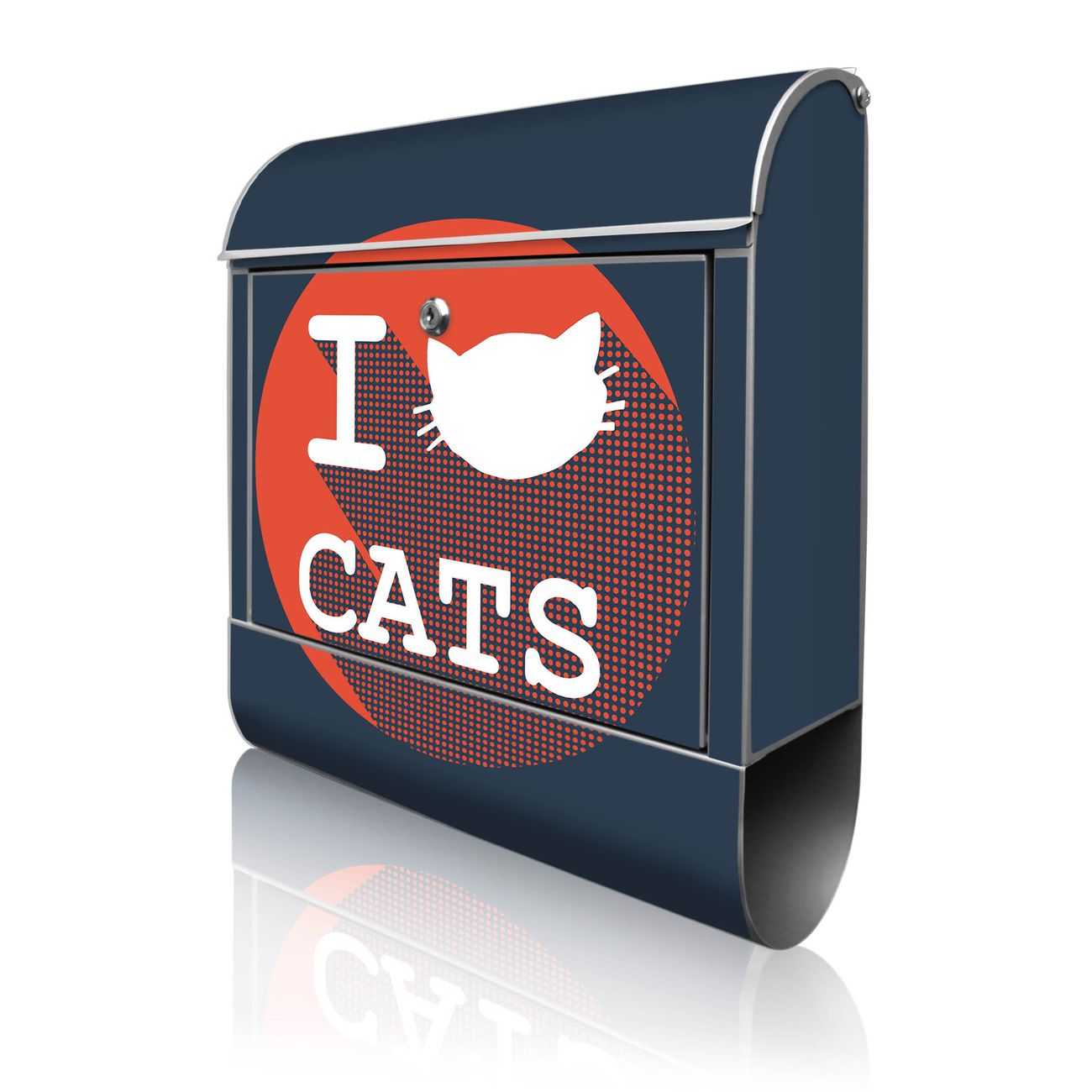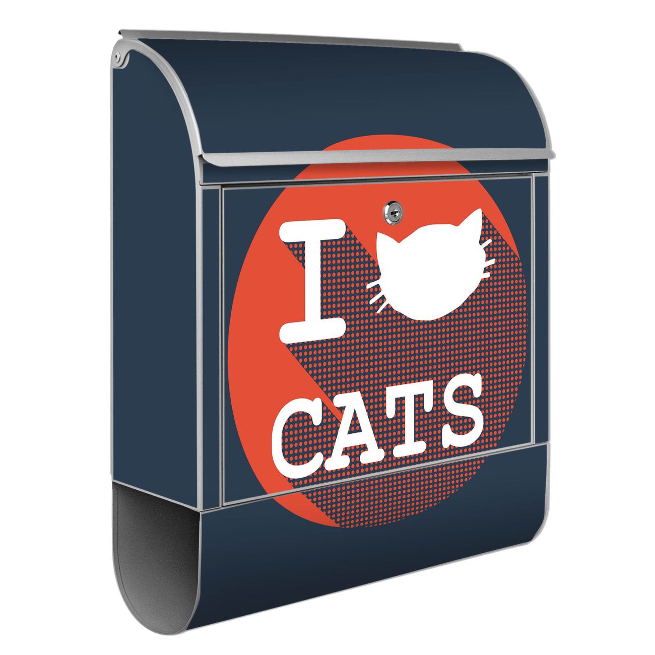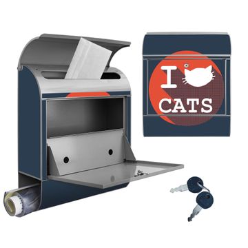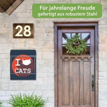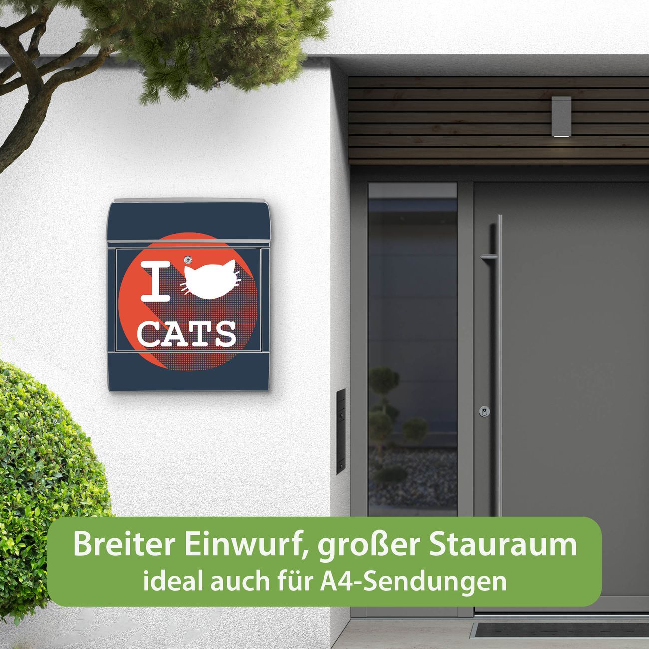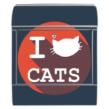 DESIGN: Der Postkasten mit Motiv Motiv I Love Cats hat ein sehr ansprechendes und ausgefallenes Design, damit entlocken Sie Ihren Nachbarn und dem Postboten ein Lächeln. Heben Sie Sich von der tristen grauen Masse ab, ohne auf Funktionalität zu verzichten. DETAILS: Der Postkasten besteht aus pulverbeschichtetem Stahl. Er ist 38x46x12,5cm groß. Das Motiv besteht aus einer wetter- und UV-resistenten Folie, die mit einem Schutzlaminat überzogen ist, sodass der Briefkasten zusätzlich vor Kratzern geschützt ist. Der Briefkasten wird mit Montagematerial, zusätzlich zwei Schlüssel sowie einer Bohrschablone geliefert. NUTZEN: Sie können diesen Briefkasten sowohl als Wandbriefkasten montieren oder einen passenden Ständer kaufen und als Standbriefkasten einbetonieren. Die Größe bietet genügend Platz für Sendungen aller Art, der Einwurf fasst auch größere A4 Sendungen. BANJADO: Ihr Briefkasten wird in Sachsen in einer kleinen Manufaktur von Hand veredelt. Die Motivfolie ist lösungsmittelfrei und schutzlaminiert für einen langen Halt. Wir legen großen Wert auf die Verbindung von Funktionalität und Design. Sie erhalten Handarbeit aus Sachsen.