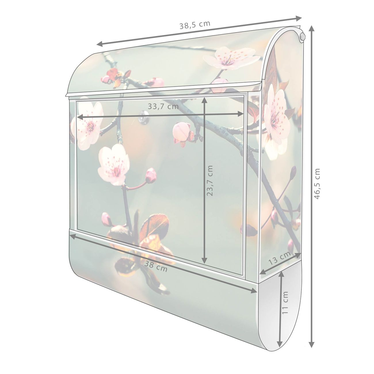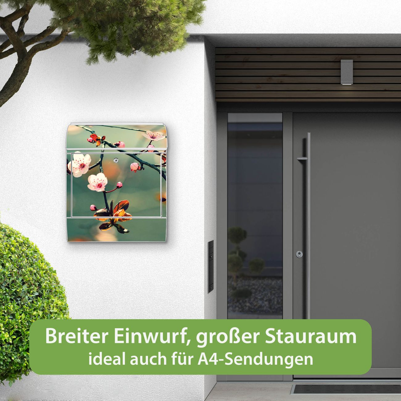 DESIGN: Der Postkasten mit Motiv Motiv Japankirsche hat ein sehr ansprechendes und ausgefallenes Design, damit entlocken Sie Ihren Nachbarn und dem Postboten ein Lächeln. Heben Sie Sich von der tristen grauen Masse ab, ohne auf Funktionalität zu verzichten. DETAILS: Der Postkasten besteht aus pulverbeschichtetem Stahl. Er ist 38x46x12,5cm groß. Das Motiv besteht aus einer wetter- und UV-resistenten Folie, die mit einem Schutzlaminat überzogen ist, sodass der Briefkasten zusätzlich vor Kratzern geschützt ist. Der Briefkasten wird mit Montagematerial, zusätzlich zwei Schlüssel sowie einer Bohrschablone geliefert. NUTZEN: Sie können diesen Briefkasten sowohl als Wandbriefkasten montieren oder einen passenden Ständer kaufen und als Standbriefkasten einbetonieren. Die Größe bietet genügend Platz für Sendungen aller Art, der Einwurf fasst auch größere A4 Sendungen. BANJADO: Ihr Briefkasten wird in Sachsen in einer kleinen Manufaktur von Hand veredelt. Die Motivfolie ist lösungsmittelfrei und schutzlaminiert für einen langen Halt. Wir legen großen Wert auf die Verbindung von Funktionalität und Design. Sie erhalten Handarbeit aus Sachsen.