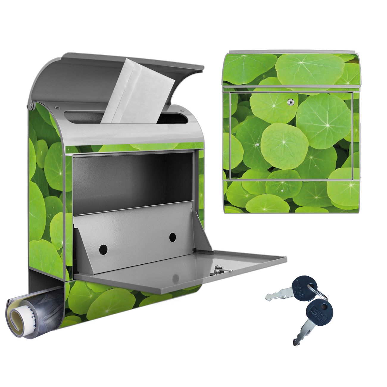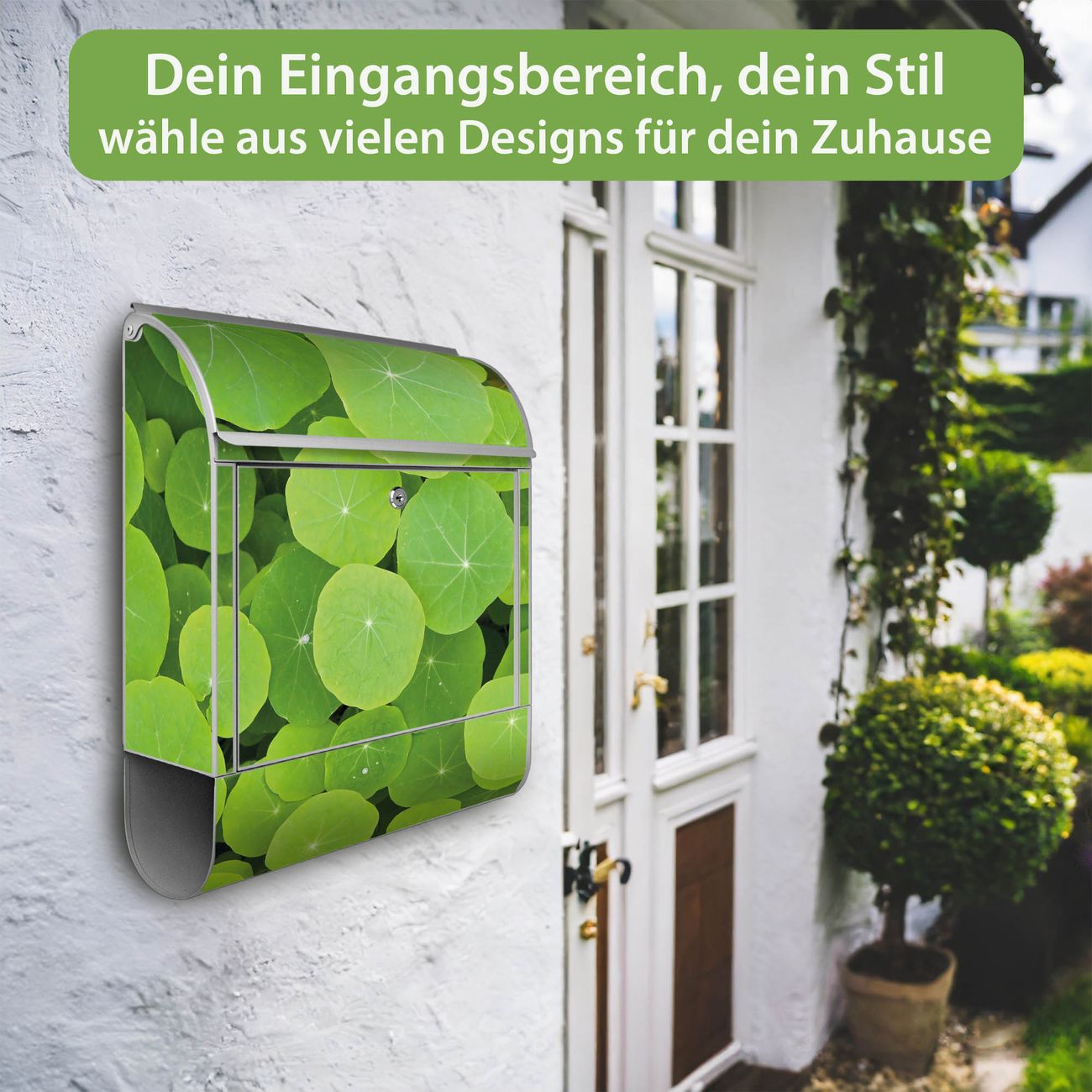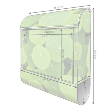 DESIGN: Der Postkasten mit Motiv Motiv Kapuzinerkresse hat ein sehr ansprechendes und ausgefallenes Design, damit entlocken Sie Ihren Nachbarn und dem Postboten ein Lächeln. Heben Sie Sich von der tristen grauen Masse ab, ohne auf Funktionalität zu verzichten. DETAILS: Der Postkasten besteht aus pulverbeschichtetem Stahl. Er ist 38x46x12,5cm groß. Das Motiv besteht aus einer wetter- und UV-resistenten Folie, die mit einem Schutzlaminat überzogen ist, sodass der Briefkasten zusätzlich vor Kratzern geschützt ist. Der Briefkasten wird mit Montagematerial, zusätzlich zwei Schlüssel sowie einer Bohrschablone geliefert. NUTZEN: Sie können diesen Briefkasten sowohl als Wandbriefkasten montieren oder einen passenden Ständer kaufen und als Standbriefkasten einbetonieren. Die Größe bietet genügend Platz für Sendungen aller Art, der Einwurf fasst auch größere A4 Sendungen. BANJADO: Ihr Briefkasten wird in Sachsen in einer kleinen Manufaktur von Hand veredelt. Die Motivfolie ist lösungsmittelfrei und schutzlaminiert für einen langen Halt. Wir legen großen Wert auf die Verbindung von Funktionalität und Design. Sie erhalten Handarbeit aus Sachsen.