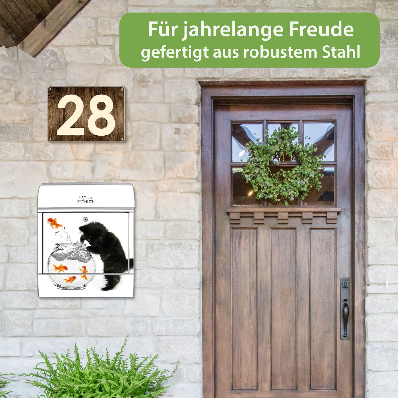 DESIGN: Der Postkasten mit Motiv Motiv Katze Und Fisch hat ein sehr ansprechendes und ausgefallenes Design, damit entlocken Sie Ihren Nachbarn und dem Postboten ein Lächeln. Heben Sie Sich von der tristen grauen Masse ab, ohne auf Funktionalität zu verzichten. DETAILS: Der Postkasten besteht aus pulverbeschichtetem Stahl. Er ist 38x46x12,5cm groß. Das Motiv besteht aus einer wetter- und UV-resistenten Folie, die mit einem Schutzlaminat überzogen ist, sodass der Briefkasten zusätzlich vor Kratzern geschützt ist. Der Briefkasten wird mit Montagematerial, zusätzlich zwei Schlüssel sowie einer Bohrschablone geliefert. NUTZEN: Sie können diesen Briefkasten sowohl als Wandbriefkasten montieren oder einen passenden Ständer kaufen und als Standbriefkasten einbetonieren. Die Größe bietet genügend Platz für Sendungen aller Art, der Einwurf fasst auch größere A4 Sendungen. BANJADO: Ihr Briefkasten wird in Sachsen in einer kleinen Manufaktur von Hand veredelt. Die Motivfolie ist lösungsmittelfrei und schutzlaminiert für einen langen Halt. Wir legen großen Wert auf die Verbindung von Funktionalität und Design. Sie erhalten Handarbeit aus Sachsen.