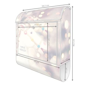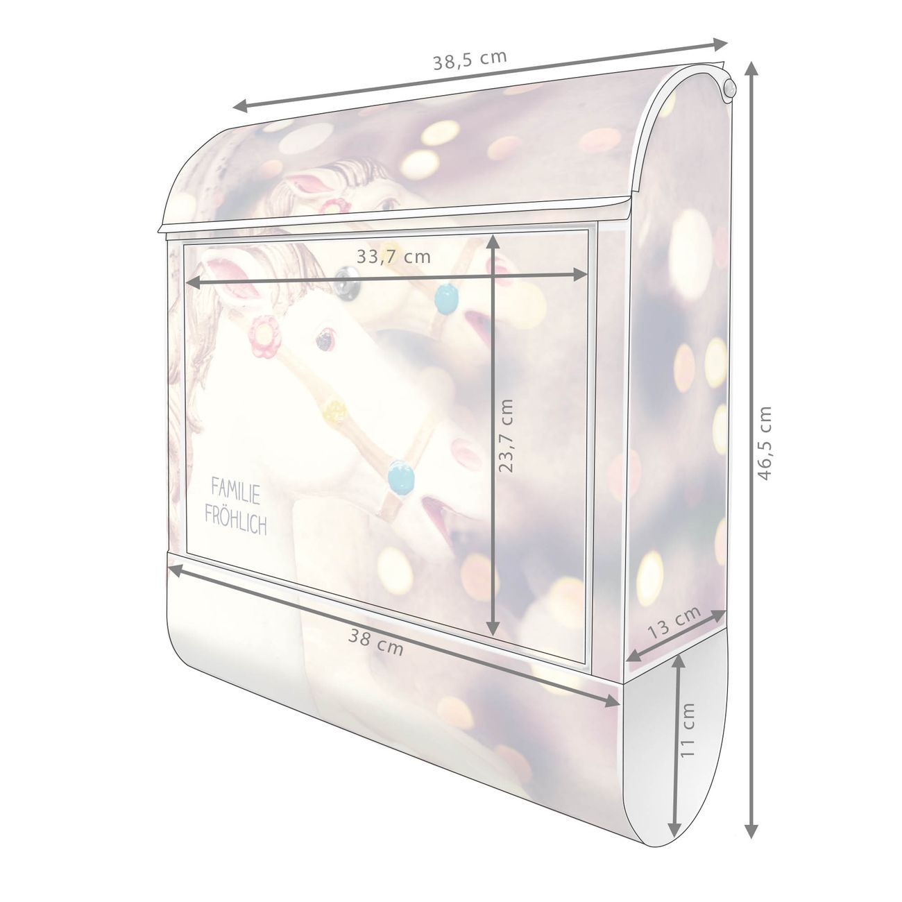 DESIGN: Der Postkasten mit Motiv Motiv Kinderkarussell hat ein sehr ansprechendes und ausgefallenes Design, damit entlocken Sie Ihren Nachbarn und dem Postboten ein Lächeln. Heben Sie Sich von der tristen grauen Masse ab, ohne auf Funktionalität zu verzichten. DETAILS: Der Postkasten besteht aus pulverbeschichtetem Stahl. Er ist 38x46x12,5cm groß. Das Motiv besteht aus einer wetter- und UV-resistenten Folie, die mit einem Schutzlaminat überzogen ist, sodass der Briefkasten zusätzlich vor Kratzern geschützt ist. Der Briefkasten wird mit Montagematerial, zusätzlich zwei Schlüssel sowie einer Bohrschablone geliefert. NUTZEN: Sie können diesen Briefkasten sowohl als Wandbriefkasten montieren oder einen passenden Ständer kaufen und als Standbriefkasten einbetonieren. Die Größe bietet genügend Platz für Sendungen aller Art, der Einwurf fasst auch größere A4 Sendungen. BANJADO: Ihr Briefkasten wird in Sachsen in einer kleinen Manufaktur von Hand veredelt. Die Motivfolie ist lösungsmittelfrei und schutzlaminiert für einen langen Halt. Wir legen großen Wert auf die Verbindung von Funktionalität und Design. Sie erhalten Handarbeit aus Sachsen.
