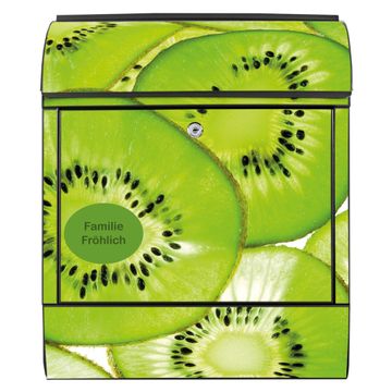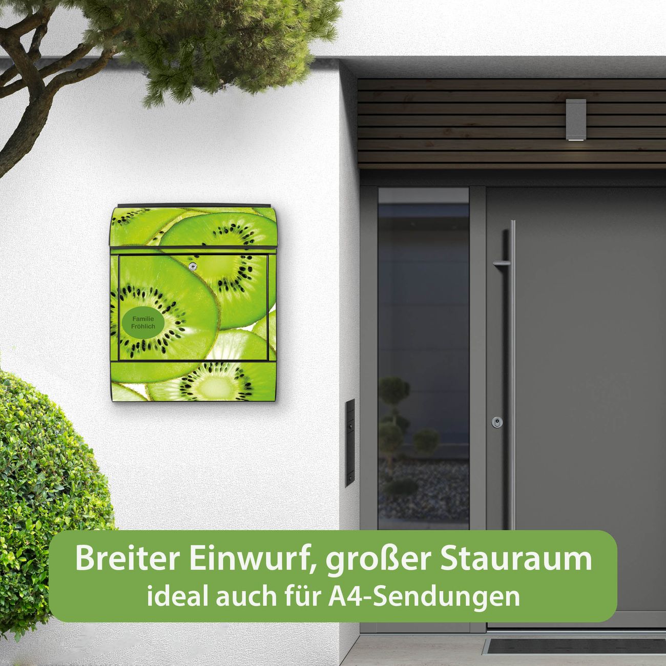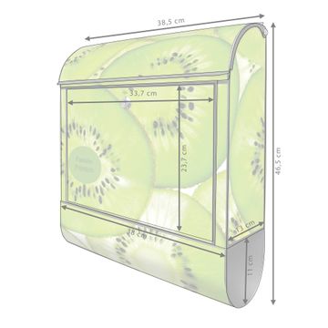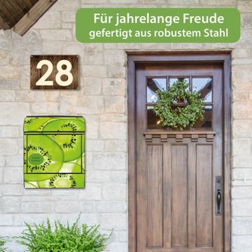 DESIGN: Der Postkasten mit Motiv Motiv Kiwi hat ein sehr ansprechendes und ausgefallenes Design, damit entlocken Sie Ihren Nachbarn und dem Postboten ein Lächeln. Heben Sie Sich von der tristen grauen Masse ab, ohne auf Funktionalität zu verzichten. DETAILS: Der Postkasten besteht aus pulverbeschichtetem Stahl. Er ist 38x46x12,5cm groß. Das Motiv besteht aus einer wetter- und UV-resistenten Folie, die mit einem Schutzlaminat überzogen ist, sodass der Briefkasten zusätzlich vor Kratzern geschützt ist. Der Briefkasten wird mit Montagematerial, zusätzlich zwei Schlüssel sowie einer Bohrschablone geliefert. NUTZEN: Sie können diesen Briefkasten sowohl als Wandbriefkasten montieren oder einen passenden Ständer kaufen und als Standbriefkasten einbetonieren. Die Größe bietet genügend Platz für Sendungen aller Art, der Einwurf fasst auch größere A4 Sendungen. BANJADO: Ihr Briefkasten wird in Sachsen in einer kleinen Manufaktur von Hand veredelt. Die Motivfolie ist lösungsmittelfrei und schutzlaminiert für einen langen Halt. Wir legen großen Wert auf die Verbindung von Funktionalität und Design. Sie erhalten Handarbeit aus Sachsen.