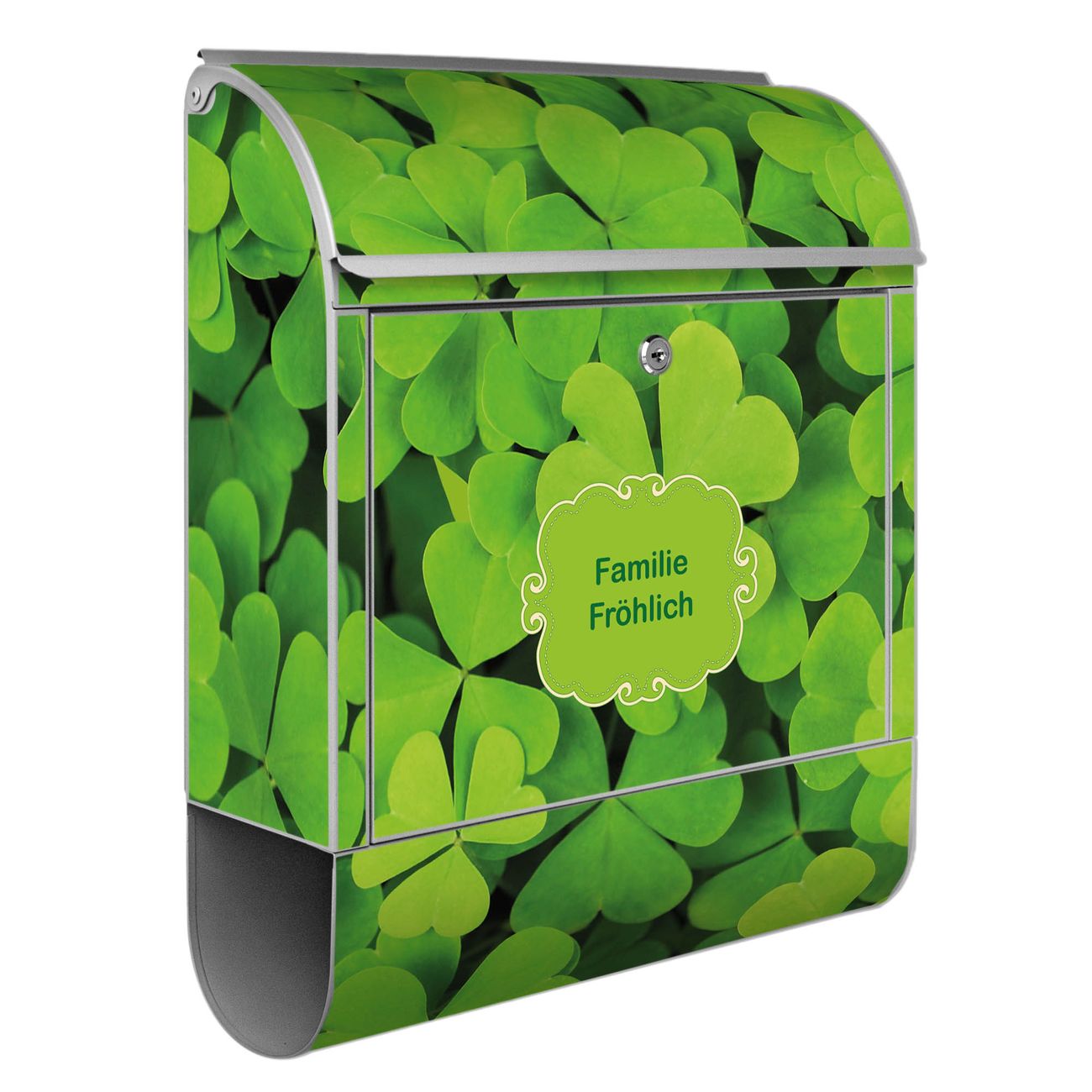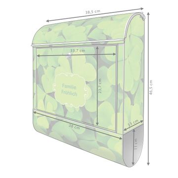 DESIGN: Der Postkasten mit Motiv Motiv Klee hat ein sehr ansprechendes und ausgefallenes Design, damit entlocken Sie Ihren Nachbarn und dem Postboten ein Lächeln. Heben Sie Sich von der tristen grauen Masse ab, ohne auf Funktionalität zu verzichten. DETAILS: Der Postkasten besteht aus pulverbeschichtetem Stahl. Er ist 38x46x12,5cm groß. Das Motiv besteht aus einer wetter- und UV-resistenten Folie, die mit einem Schutzlaminat überzogen ist, sodass der Briefkasten zusätzlich vor Kratzern geschützt ist. Der Briefkasten wird mit Montagematerial, zusätzlich zwei Schlüssel sowie einer Bohrschablone geliefert. NUTZEN: Sie können diesen Briefkasten sowohl als Wandbriefkasten montieren oder einen passenden Ständer kaufen und als Standbriefkasten einbetonieren. Die Größe bietet genügend Platz für Sendungen aller Art, der Einwurf fasst auch größere A4 Sendungen. BANJADO: Ihr Briefkasten wird in Sachsen in einer kleinen Manufaktur von Hand veredelt. Die Motivfolie ist lösungsmittelfrei und schutzlaminiert für einen langen Halt. Wir legen großen Wert auf die Verbindung von Funktionalität und Design. Sie erhalten Handarbeit aus Sachsen.