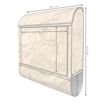 DESIGN: Der Postkasten mit Motiv Motiv Knüllpapier hat ein sehr ansprechendes und ausgefallenes Design, damit entlocken Sie Ihren Nachbarn und dem Postboten ein Lächeln. Heben Sie Sich von der tristen grauen Masse ab, ohne auf Funktionalität zu verzichten. DETAILS: Der Postkasten besteht aus pulverbeschichtetem Stahl. Er ist 38x46x12,5cm groß. Das Motiv besteht aus einer wetter- und UV-resistenten Folie, die mit einem Schutzlaminat überzogen ist, sodass der Briefkasten zusätzlich vor Kratzern geschützt ist. Der Briefkasten wird mit Montagematerial, zusätzlich zwei Schlüssel sowie einer Bohrschablone geliefert. NUTZEN: Sie können diesen Briefkasten sowohl als Wandbriefkasten montieren oder einen passenden Ständer kaufen und als Standbriefkasten einbetonieren. Die Größe bietet genügend Platz für Sendungen aller Art, der Einwurf fasst auch größere A4 Sendungen. BANJADO: Ihr Briefkasten wird in Sachsen in einer kleinen Manufaktur von Hand veredelt. Die Motivfolie ist lösungsmittelfrei und schutzlaminiert für einen langen Halt. Wir legen großen Wert auf die Verbindung von Funktionalität und Design. Sie erhalten Handarbeit aus Sachsen.