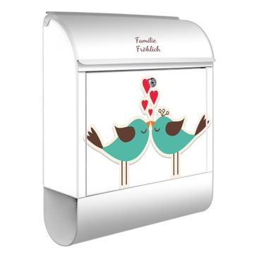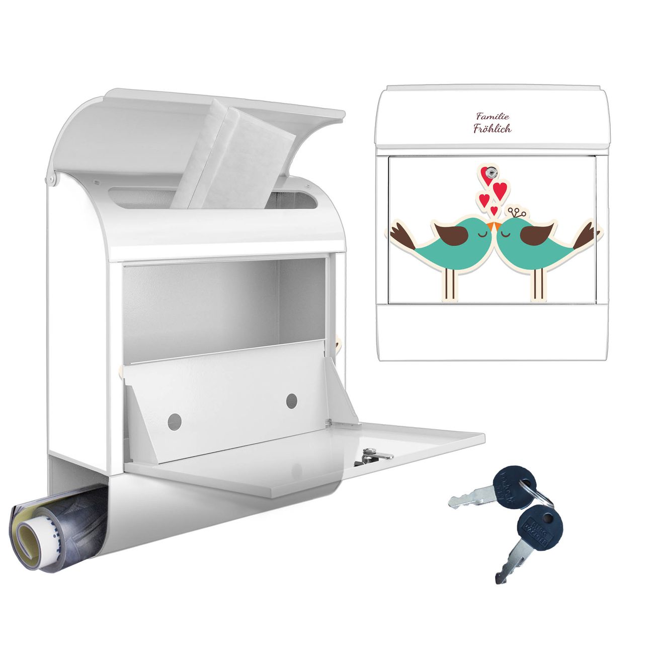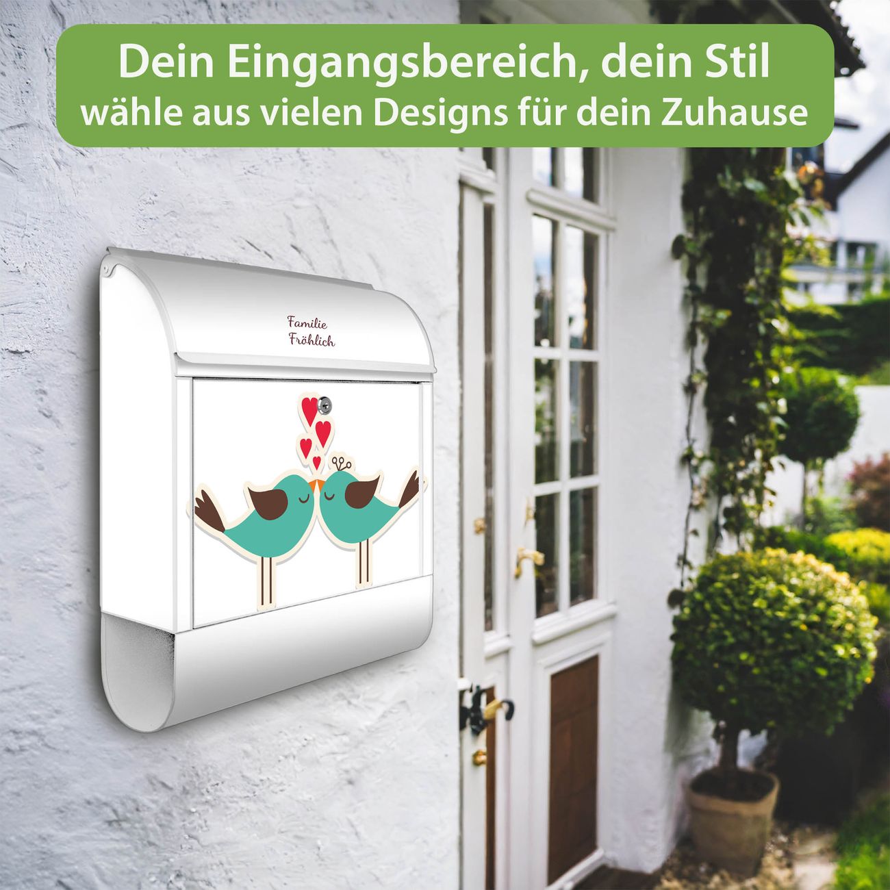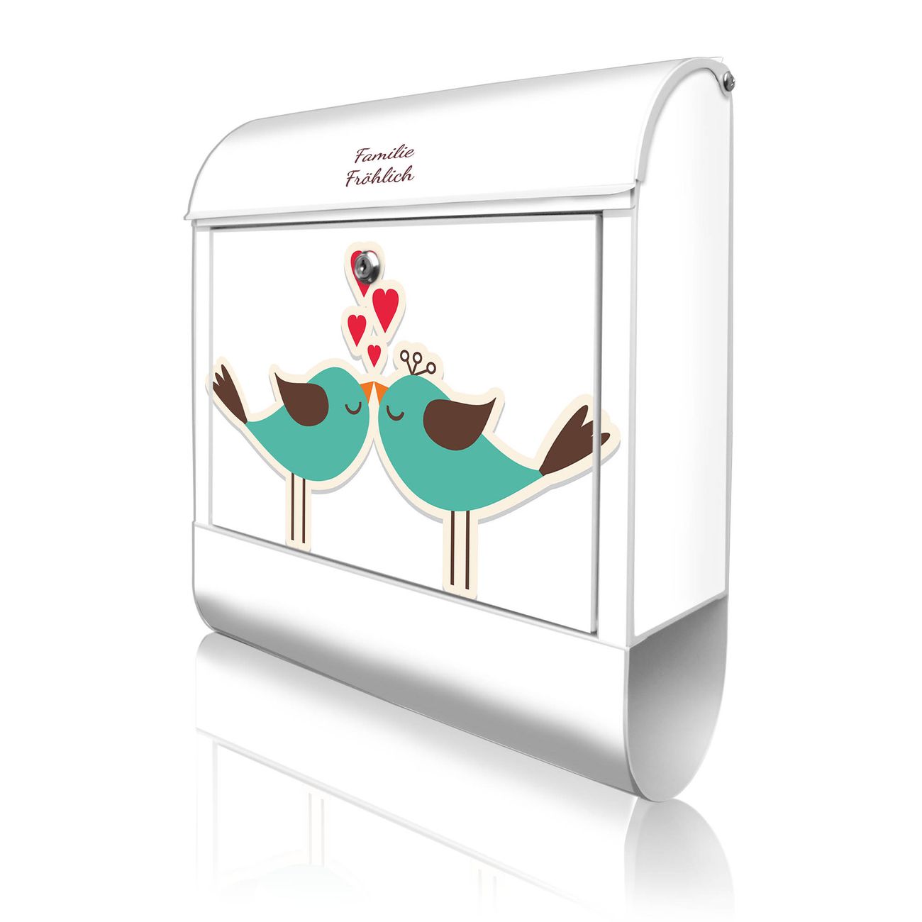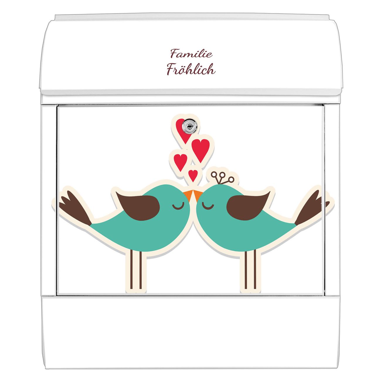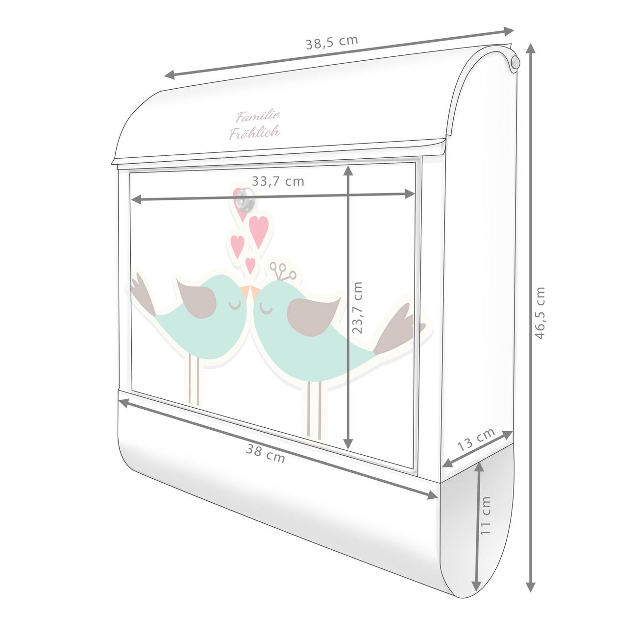 DESIGN: Der Postkasten mit Motiv Motiv Küsschen hat ein sehr ansprechendes und ausgefallenes Design, damit entlocken Sie Ihren Nachbarn und dem Postboten ein Lächeln. Heben Sie Sich von der tristen grauen Masse ab, ohne auf Funktionalität zu verzichten. DETAILS: Der Postkasten besteht aus pulverbeschichtetem Stahl. Er ist 38x46x12,5cm groß. Das Motiv besteht aus einer wetter- und UV-resistenten Folie, die mit einem Schutzlaminat überzogen ist, sodass der Briefkasten zusätzlich vor Kratzern geschützt ist. Der Briefkasten wird mit Montagematerial, zusätzlich zwei Schlüssel sowie einer Bohrschablone geliefert. NUTZEN: Sie können diesen Briefkasten sowohl als Wandbriefkasten montieren oder einen passenden Ständer kaufen und als Standbriefkasten einbetonieren. Die Größe bietet genügend Platz für Sendungen aller Art, der Einwurf fasst auch größere A4 Sendungen. BANJADO: Ihr Briefkasten wird in Sachsen in einer kleinen Manufaktur von Hand veredelt. Die Motivfolie ist lösungsmittelfrei und schutzlaminiert für einen langen Halt. Wir legen großen Wert auf die Verbindung von Funktionalität und Design. Sie erhalten Handarbeit aus Sachsen.