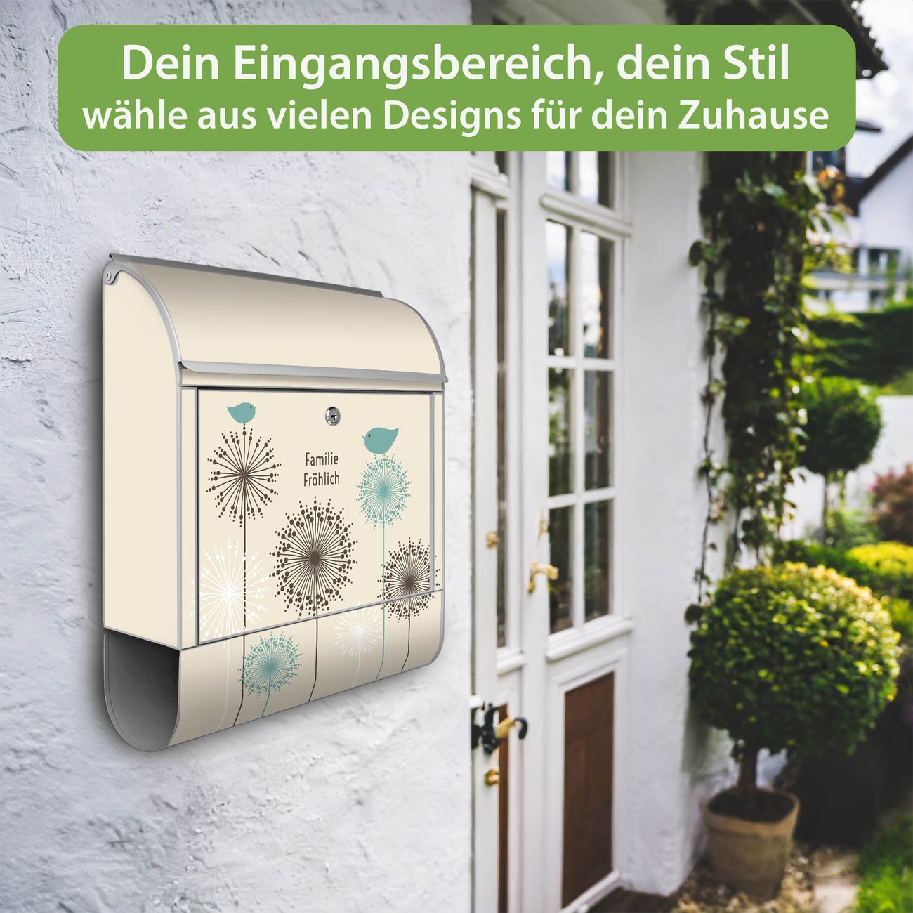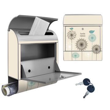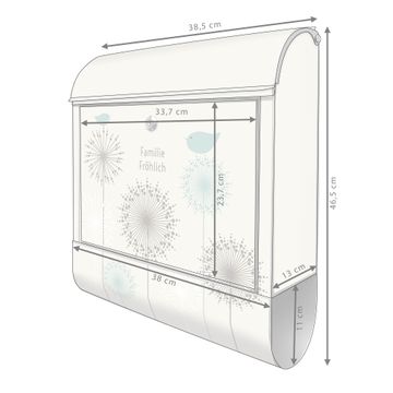 DESIGN: Der Postkasten mit Motiv Motiv Kugelfontänen hat ein sehr ansprechendes und ausgefallenes Design, damit entlocken Sie Ihren Nachbarn und dem Postboten ein Lächeln. Heben Sie Sich von der tristen grauen Masse ab, ohne auf Funktionalität zu verzichten. DETAILS: Der Postkasten besteht aus pulverbeschichtetem Stahl. Er ist 38x46x12,5cm groß. Das Motiv besteht aus einer wetter- und UV-resistenten Folie, die mit einem Schutzlaminat überzogen ist, sodass der Briefkasten zusätzlich vor Kratzern geschützt ist. Der Briefkasten wird mit Montagematerial, zusätzlich zwei Schlüssel sowie einer Bohrschablone geliefert. NUTZEN: Sie können diesen Briefkasten sowohl als Wandbriefkasten montieren oder einen passenden Ständer kaufen und als Standbriefkasten einbetonieren. Die Größe bietet genügend Platz für Sendungen aller Art, der Einwurf fasst auch größere A4 Sendungen. BANJADO: Ihr Briefkasten wird in Sachsen in einer kleinen Manufaktur von Hand veredelt. Die Motivfolie ist lösungsmittelfrei und schutzlaminiert für einen langen Halt. Wir legen großen Wert auf die Verbindung von Funktionalität und Design. Sie erhalten Handarbeit aus Sachsen.