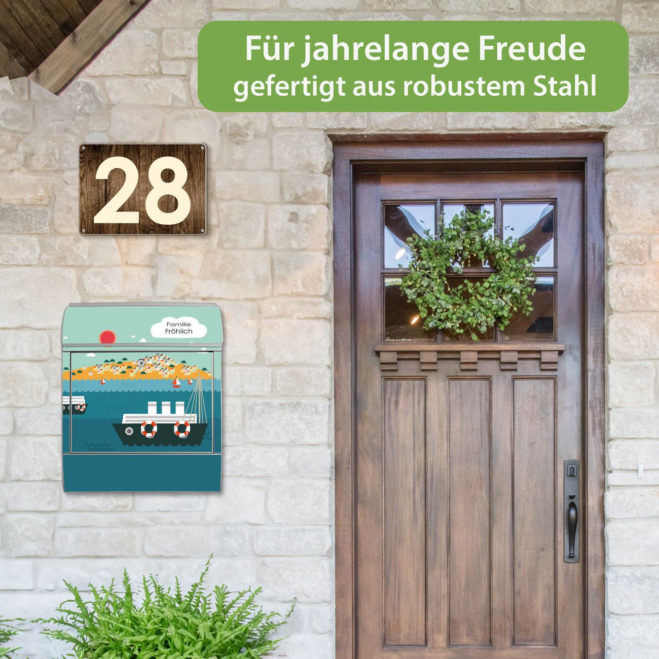 DESIGN: Der Postkasten mit Motiv Motiv Land in Sicht hat ein sehr ansprechendes und ausgefallenes Design, damit entlocken Sie Ihren Nachbarn und dem Postboten ein Lächeln. Heben Sie Sich von der tristen grauen Masse ab, ohne auf Funktionalität zu verzichten. DETAILS: Der Postkasten besteht aus pulverbeschichtetem Stahl. Er ist 38x46x12,5cm groß. Das Motiv besteht aus einer wetter- und UV-resistenten Folie, die mit einem Schutzlaminat überzogen ist, sodass der Briefkasten zusätzlich vor Kratzern geschützt ist. Der Briefkasten wird mit Montagematerial, zusätzlich zwei Schlüssel sowie einer Bohrschablone geliefert. NUTZEN: Sie können diesen Briefkasten sowohl als Wandbriefkasten montieren oder einen passenden Ständer kaufen und als Standbriefkasten einbetonieren. Die Größe bietet genügend Platz für Sendungen aller Art, der Einwurf fasst auch größere A4 Sendungen. BANJADO: Ihr Briefkasten wird in Sachsen in einer kleinen Manufaktur von Hand veredelt. Die Motivfolie ist lösungsmittelfrei und schutzlaminiert für einen langen Halt. Wir legen großen Wert auf die Verbindung von Funktionalität und Design. Sie erhalten Handarbeit aus Sachsen.