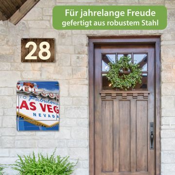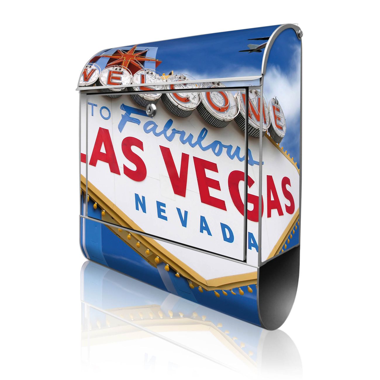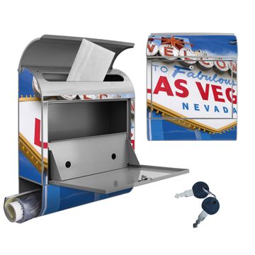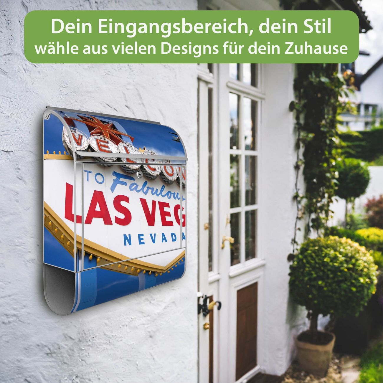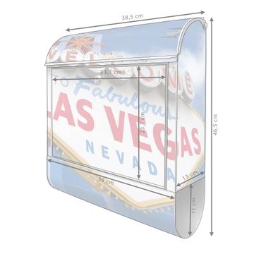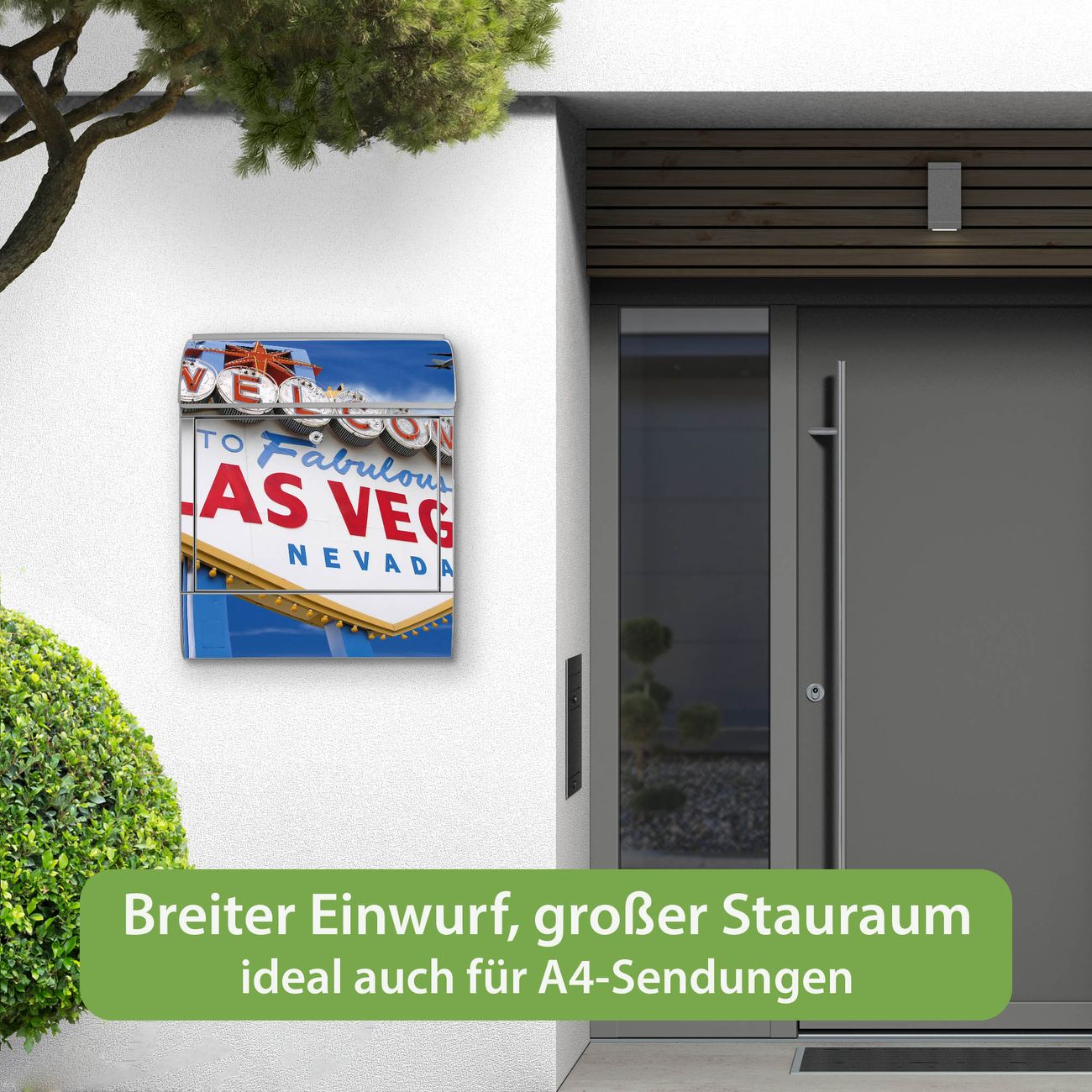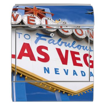 DESIGN: Der Postkasten mit Motiv Motiv Las Vegas hat ein sehr ansprechendes und ausgefallenes Design, damit entlocken Sie Ihren Nachbarn und dem Postboten ein Lächeln. Heben Sie Sich von der tristen grauen Masse ab, ohne auf Funktionalität zu verzichten. DETAILS: Der Postkasten besteht aus pulverbeschichtetem Stahl. Er ist 38x46x12,5cm groß. Das Motiv besteht aus einer wetter- und UV-resistenten Folie, die mit einem Schutzlaminat überzogen ist, sodass der Briefkasten zusätzlich vor Kratzern geschützt ist. Der Briefkasten wird mit Montagematerial, zusätzlich zwei Schlüssel sowie einer Bohrschablone geliefert. NUTZEN: Sie können diesen Briefkasten sowohl als Wandbriefkasten montieren oder einen passenden Ständer kaufen und als Standbriefkasten einbetonieren. Die Größe bietet genügend Platz für Sendungen aller Art, der Einwurf fasst auch größere A4 Sendungen. BANJADO: Ihr Briefkasten wird in Sachsen in einer kleinen Manufaktur von Hand veredelt. Die Motivfolie ist lösungsmittelfrei und schutzlaminiert für einen langen Halt. Wir legen großen Wert auf die Verbindung von Funktionalität und Design. Sie erhalten Handarbeit aus Sachsen.