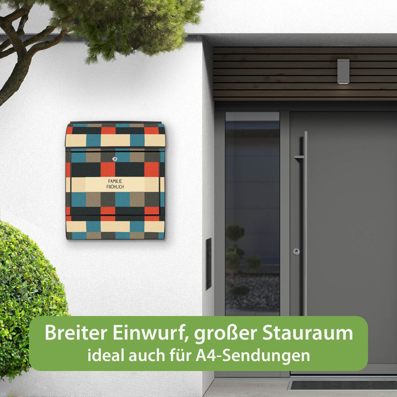 DESIGN: Der Postkasten mit Motiv Motiv Lausanne hat ein sehr ansprechendes und ausgefallenes Design, damit entlocken Sie Ihren Nachbarn und dem Postboten ein Lächeln. Heben Sie Sich von der tristen grauen Masse ab, ohne auf Funktionalität zu verzichten. DETAILS: Der Postkasten besteht aus pulverbeschichtetem Stahl. Er ist 38x46x12,5cm groß. Das Motiv besteht aus einer wetter- und UV-resistenten Folie, die mit einem Schutzlaminat überzogen ist, sodass der Briefkasten zusätzlich vor Kratzern geschützt ist. Der Briefkasten wird mit Montagematerial, zusätzlich zwei Schlüssel sowie einer Bohrschablone geliefert. NUTZEN: Sie können diesen Briefkasten sowohl als Wandbriefkasten montieren oder einen passenden Ständer kaufen und als Standbriefkasten einbetonieren. Die Größe bietet genügend Platz für Sendungen aller Art, der Einwurf fasst auch größere A4 Sendungen. BANJADO: Ihr Briefkasten wird in Sachsen in einer kleinen Manufaktur von Hand veredelt. Die Motivfolie ist lösungsmittelfrei und schutzlaminiert für einen langen Halt. Wir legen großen Wert auf die Verbindung von Funktionalität und Design. Sie erhalten Handarbeit aus Sachsen.