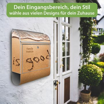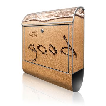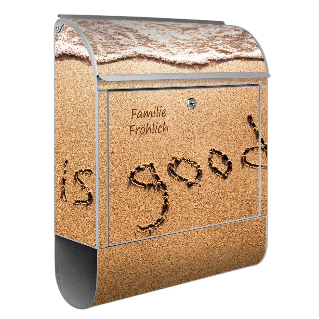 DESIGN: Der Postkasten mit Motiv Motiv Life Is Good hat ein sehr ansprechendes und ausgefallenes Design, damit entlocken Sie Ihren Nachbarn und dem Postboten ein Lächeln. Heben Sie Sich von der tristen grauen Masse ab, ohne auf Funktionalität zu verzichten. DETAILS: Der Postkasten besteht aus pulverbeschichtetem Stahl. Er ist 38x46x12,5cm groß. Das Motiv besteht aus einer wetter- und UV-resistenten Folie, die mit einem Schutzlaminat überzogen ist, sodass der Briefkasten zusätzlich vor Kratzern geschützt ist. Der Briefkasten wird mit Montagematerial, zusätzlich zwei Schlüssel sowie einer Bohrschablone geliefert. NUTZEN: Sie können diesen Briefkasten sowohl als Wandbriefkasten montieren oder einen passenden Ständer kaufen und als Standbriefkasten einbetonieren. Die Größe bietet genügend Platz für Sendungen aller Art, der Einwurf fasst auch größere A4 Sendungen. BANJADO: Ihr Briefkasten wird in Sachsen in einer kleinen Manufaktur von Hand veredelt. Die Motivfolie ist lösungsmittelfrei und schutzlaminiert für einen langen Halt. Wir legen großen Wert auf die Verbindung von Funktionalität und Design. Sie erhalten Handarbeit aus Sachsen.