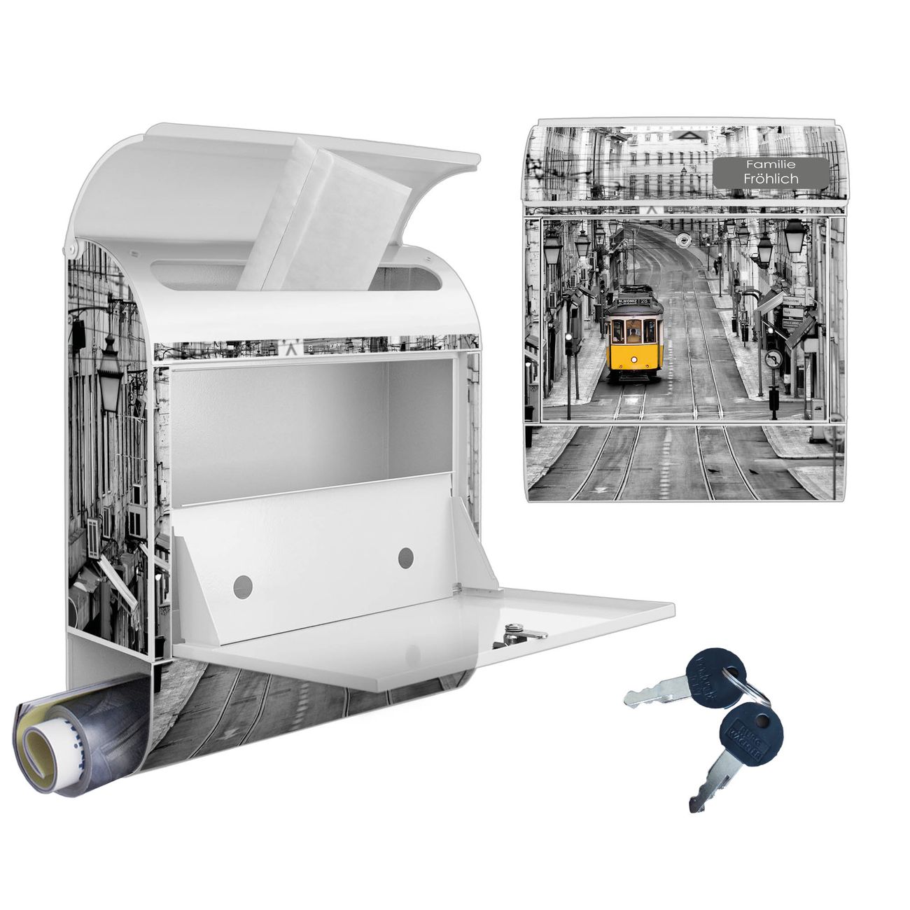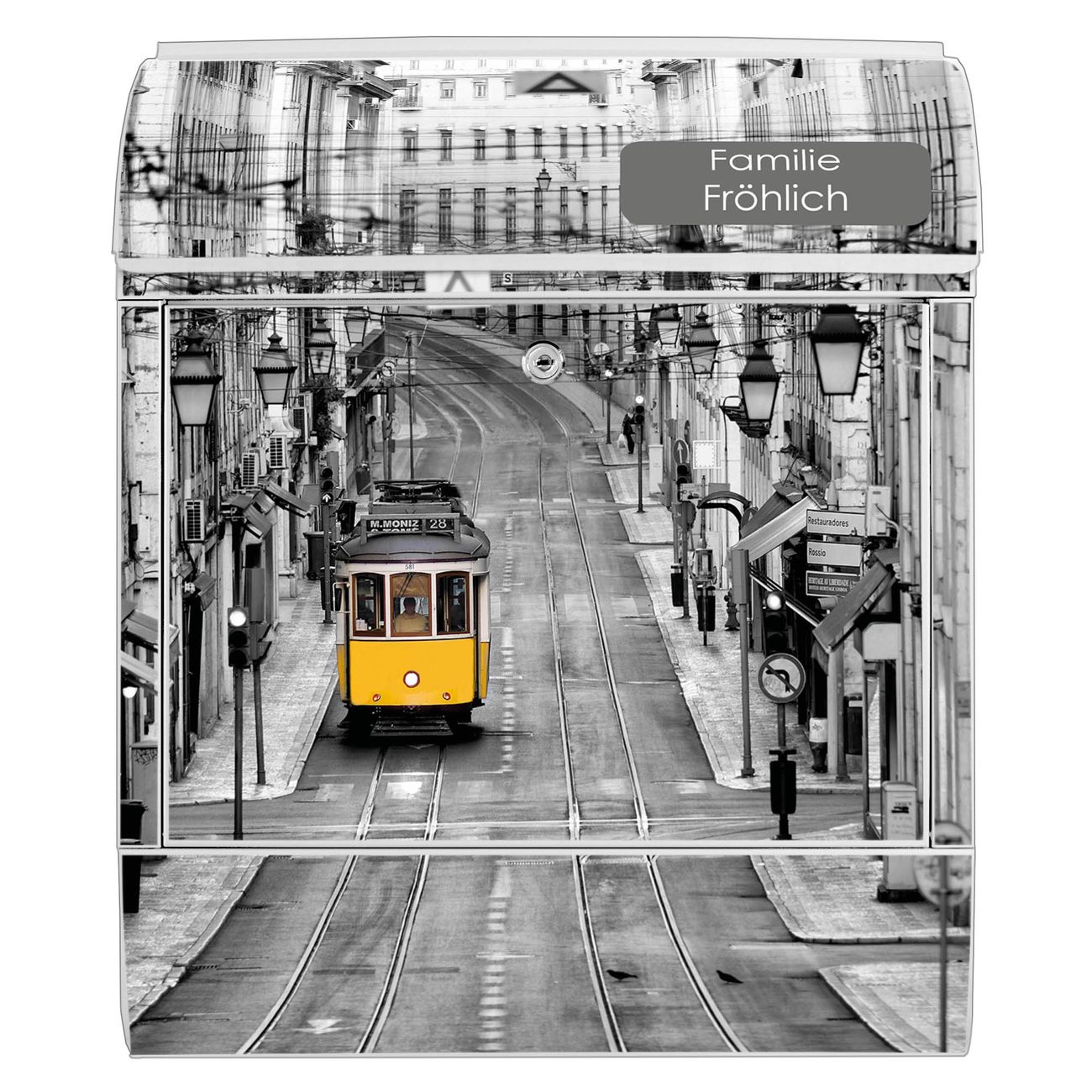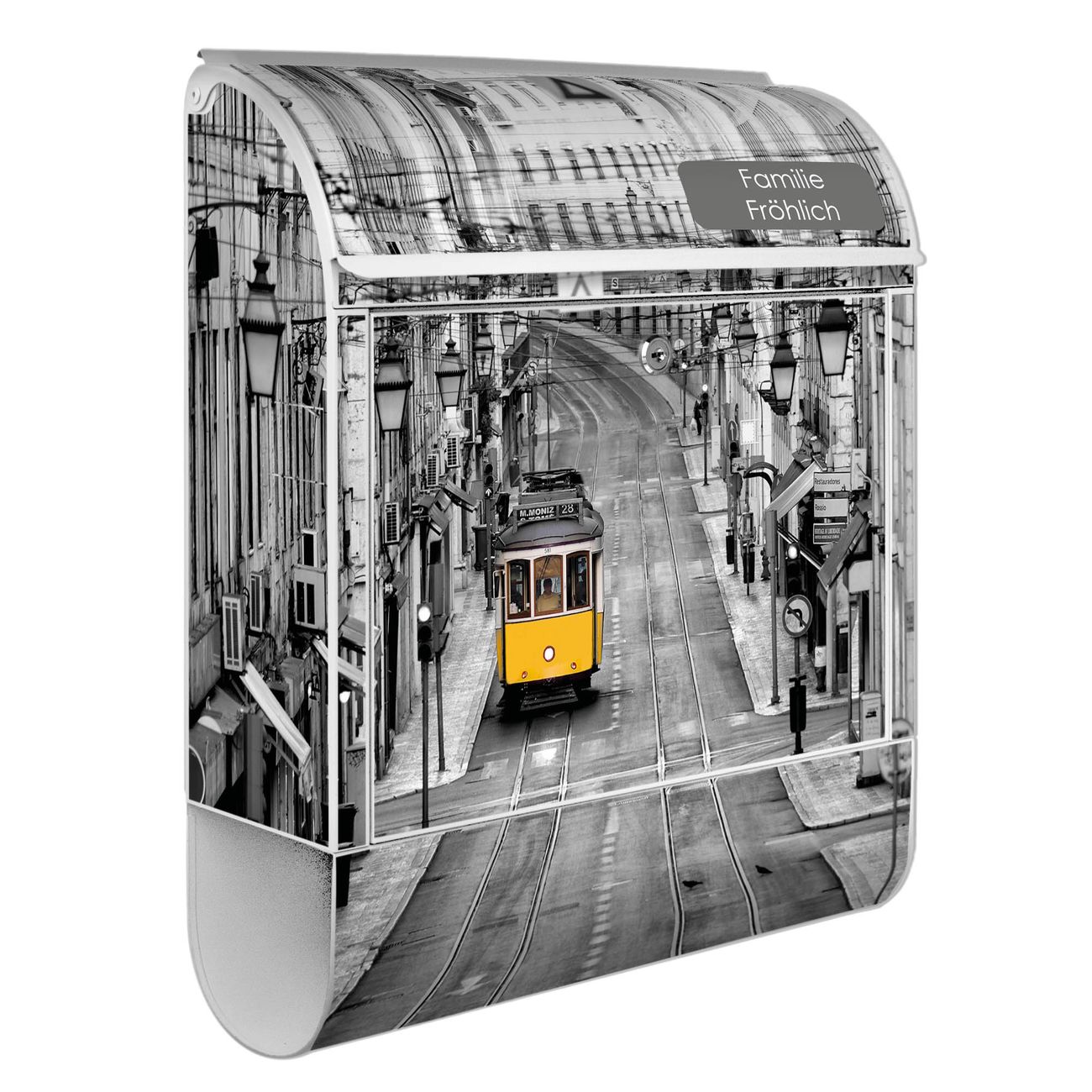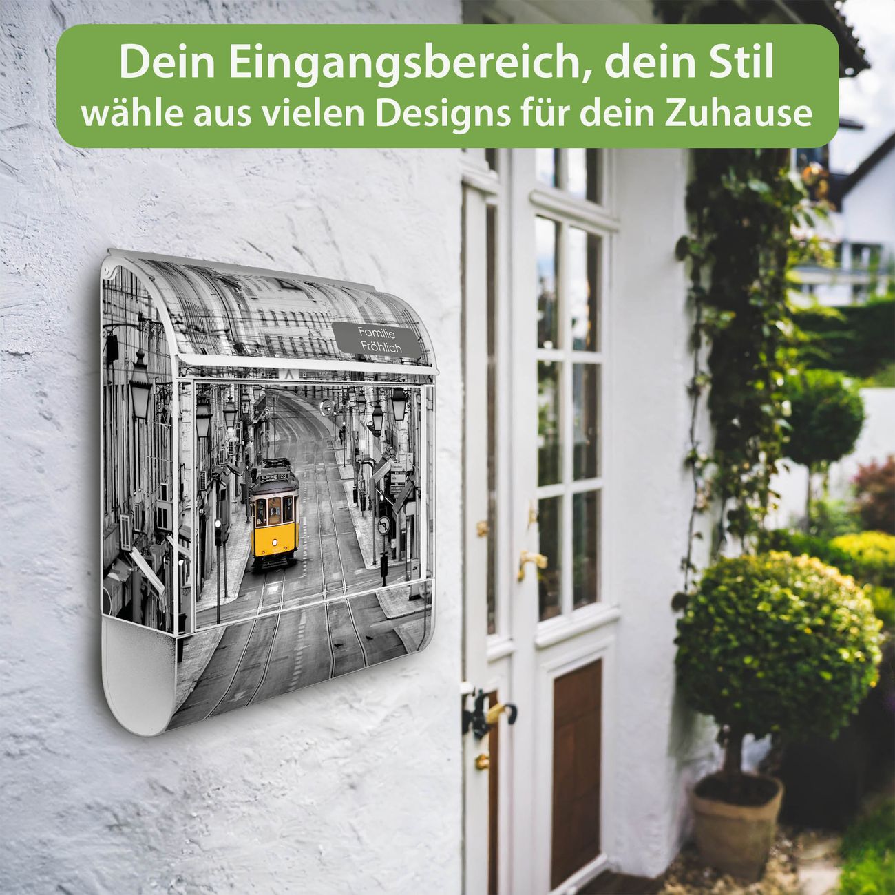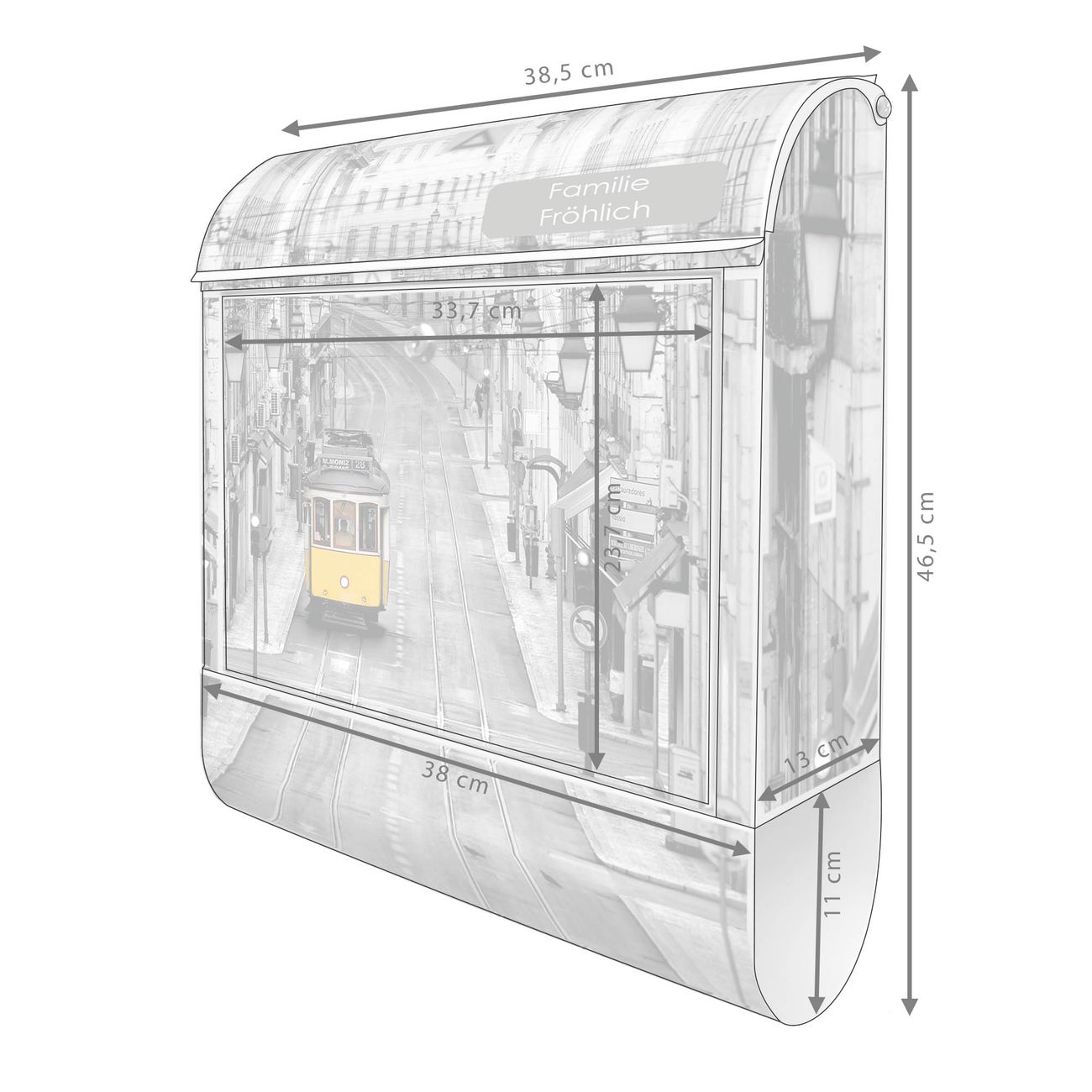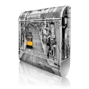 DESIGN: Der Postkasten mit Motiv Motiv Lissabon hat ein sehr ansprechendes und ausgefallenes Design, damit entlocken Sie Ihren Nachbarn und dem Postboten ein Lächeln. Heben Sie Sich von der tristen grauen Masse ab, ohne auf Funktionalität zu verzichten. DETAILS: Der Postkasten besteht aus pulverbeschichtetem Stahl. Er ist 38x46x12,5cm groß. Das Motiv besteht aus einer wetter- und UV-resistenten Folie, die mit einem Schutzlaminat überzogen ist, sodass der Briefkasten zusätzlich vor Kratzern geschützt ist. Der Briefkasten wird mit Montagematerial, zusätzlich zwei Schlüssel sowie einer Bohrschablone geliefert. NUTZEN: Sie können diesen Briefkasten sowohl als Wandbriefkasten montieren oder einen passenden Ständer kaufen und als Standbriefkasten einbetonieren. Die Größe bietet genügend Platz für Sendungen aller Art, der Einwurf fasst auch größere A4 Sendungen. BANJADO: Ihr Briefkasten wird in Sachsen in einer kleinen Manufaktur von Hand veredelt. Die Motivfolie ist lösungsmittelfrei und schutzlaminiert für einen langen Halt. Wir legen großen Wert auf die Verbindung von Funktionalität und Design. Sie erhalten Handarbeit aus Sachsen.