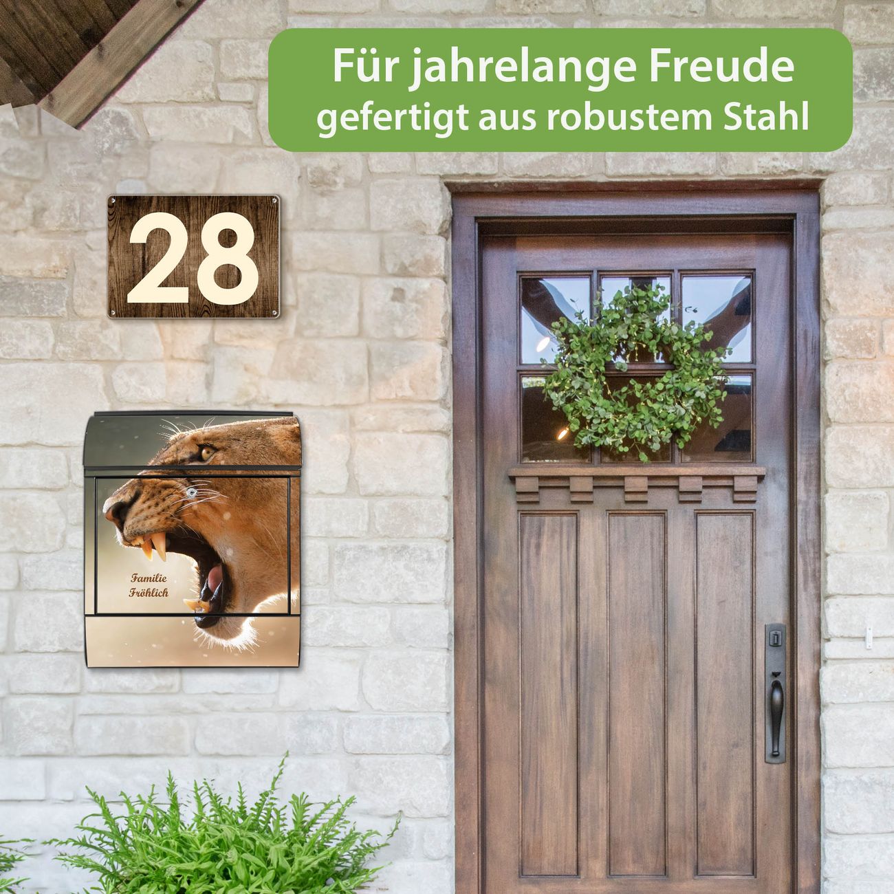 DESIGN: Der Postkasten mit Motiv Motiv Löwin hat ein sehr ansprechendes und ausgefallenes Design, damit entlocken Sie Ihren Nachbarn und dem Postboten ein Lächeln. Heben Sie Sich von der tristen grauen Masse ab, ohne auf Funktionalität zu verzichten. DETAILS: Der Postkasten besteht aus pulverbeschichtetem Stahl. Er ist 38x46x12,5cm groß. Das Motiv besteht aus einer wetter- und UV-resistenten Folie, die mit einem Schutzlaminat überzogen ist, sodass der Briefkasten zusätzlich vor Kratzern geschützt ist. Der Briefkasten wird mit Montagematerial, zusätzlich zwei Schlüssel sowie einer Bohrschablone geliefert. NUTZEN: Sie können diesen Briefkasten sowohl als Wandbriefkasten montieren oder einen passenden Ständer kaufen und als Standbriefkasten einbetonieren. Die Größe bietet genügend Platz für Sendungen aller Art, der Einwurf fasst auch größere A4 Sendungen. BANJADO: Ihr Briefkasten wird in Sachsen in einer kleinen Manufaktur von Hand veredelt. Die Motivfolie ist lösungsmittelfrei und schutzlaminiert für einen langen Halt. Wir legen großen Wert auf die Verbindung von Funktionalität und Design. Sie erhalten Handarbeit aus Sachsen.