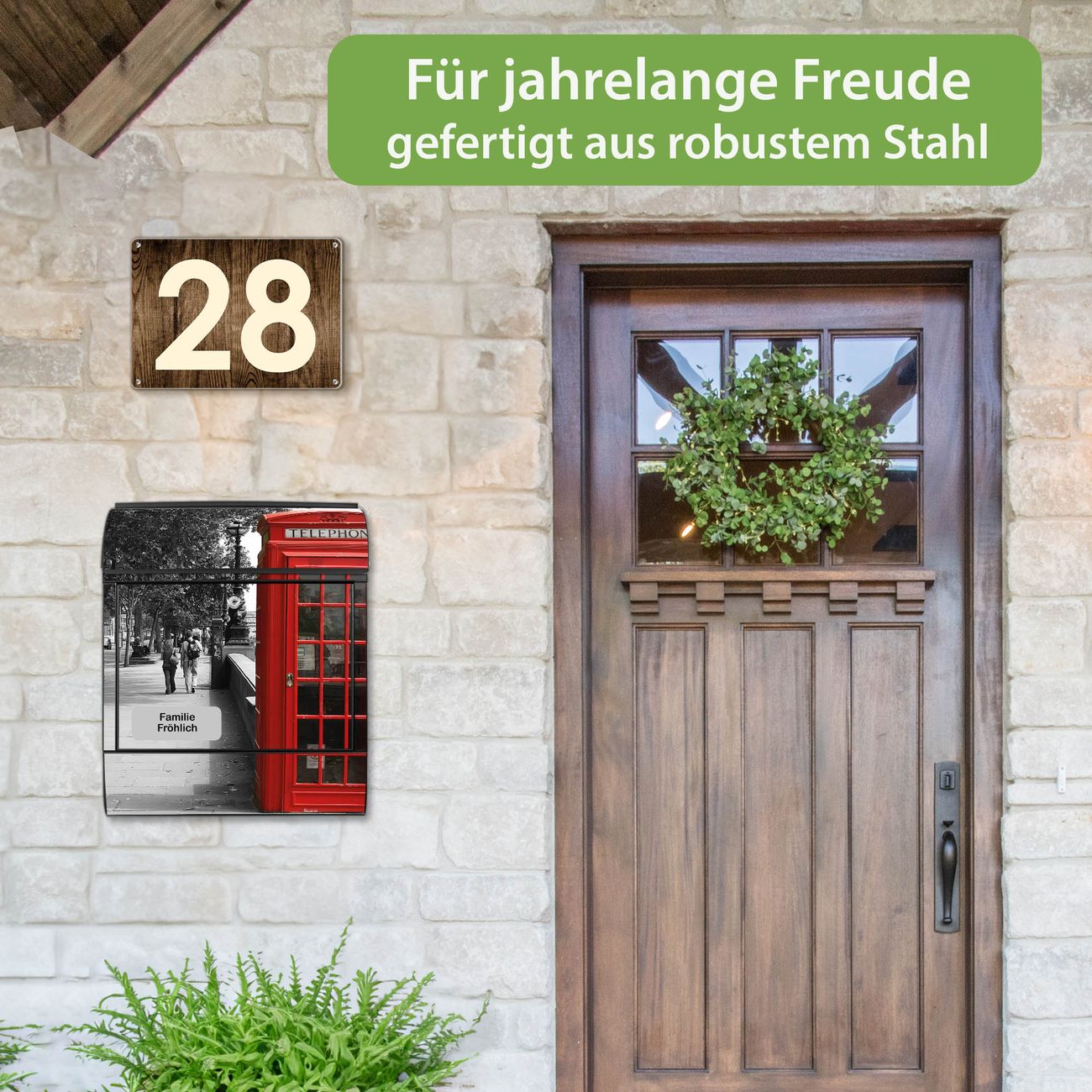 DESIGN: Der Postkasten mit Motiv Motiv London Red Telephone hat ein sehr ansprechendes und ausgefallenes Design, damit entlocken Sie Ihren Nachbarn und dem Postboten ein Lächeln. Heben Sie Sich von der tristen grauen Masse ab, ohne auf Funktionalität zu verzichten. DETAILS: Der Postkasten besteht aus pulverbeschichtetem Stahl. Er ist 38x46x12,5cm groß. Das Motiv besteht aus einer wetter- und UV-resistenten Folie, die mit einem Schutzlaminat überzogen ist, sodass der Briefkasten zusätzlich vor Kratzern geschützt ist. Der Briefkasten wird mit Montagematerial, zusätzlich zwei Schlüssel sowie einer Bohrschablone geliefert. NUTZEN: Sie können diesen Briefkasten sowohl als Wandbriefkasten montieren oder einen passenden Ständer kaufen und als Standbriefkasten einbetonieren. Die Größe bietet genügend Platz für Sendungen aller Art, der Einwurf fasst auch größere A4 Sendungen. BANJADO: Ihr Briefkasten wird in Sachsen in einer kleinen Manufaktur von Hand veredelt. Die Motivfolie ist lösungsmittelfrei und schutzlaminiert für einen langen Halt. Wir legen großen Wert auf die Verbindung von Funktionalität und Design. Sie erhalten Handarbeit aus Sachsen.