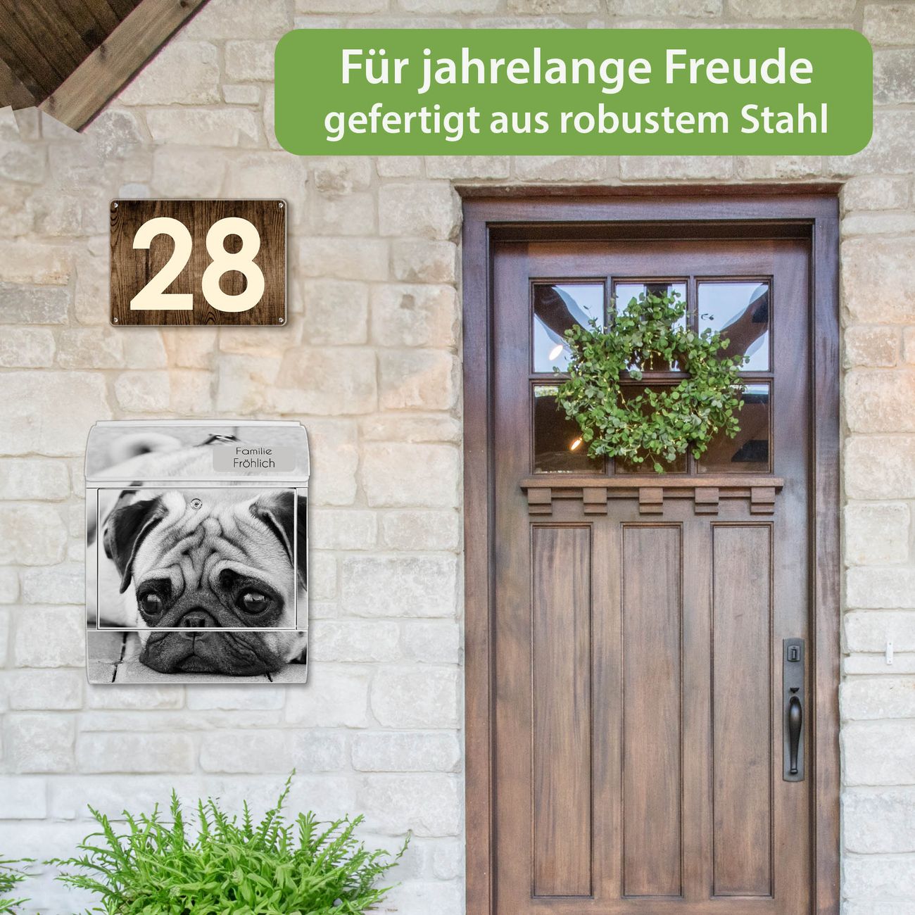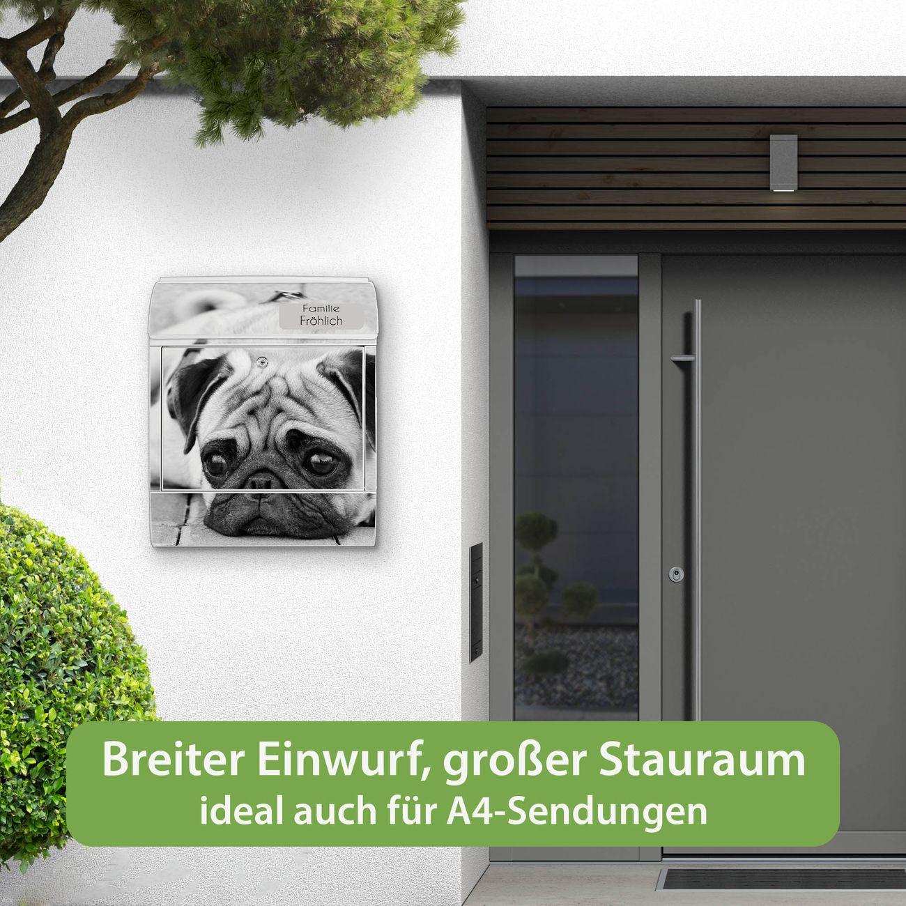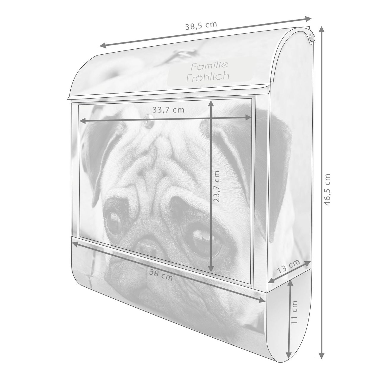 DESIGN: Der Postkasten mit Motiv Motiv Lotty hat ein sehr ansprechendes und ausgefallenes Design, damit entlocken Sie Ihren Nachbarn und dem Postboten ein Lächeln. Heben Sie Sich von der tristen grauen Masse ab, ohne auf Funktionalität zu verzichten. DETAILS: Der Postkasten besteht aus pulverbeschichtetem Stahl. Er ist 38x46x12,5cm groß. Das Motiv besteht aus einer wetter- und UV-resistenten Folie, die mit einem Schutzlaminat überzogen ist, sodass der Briefkasten zusätzlich vor Kratzern geschützt ist. Der Briefkasten wird mit Montagematerial, zusätzlich zwei Schlüssel sowie einer Bohrschablone geliefert. NUTZEN: Sie können diesen Briefkasten sowohl als Wandbriefkasten montieren oder einen passenden Ständer kaufen und als Standbriefkasten einbetonieren. Die Größe bietet genügend Platz für Sendungen aller Art, der Einwurf fasst auch größere A4 Sendungen. BANJADO: Ihr Briefkasten wird in Sachsen in einer kleinen Manufaktur von Hand veredelt. Die Motivfolie ist lösungsmittelfrei und schutzlaminiert für einen langen Halt. Wir legen großen Wert auf die Verbindung von Funktionalität und Design. Sie erhalten Handarbeit aus Sachsen.