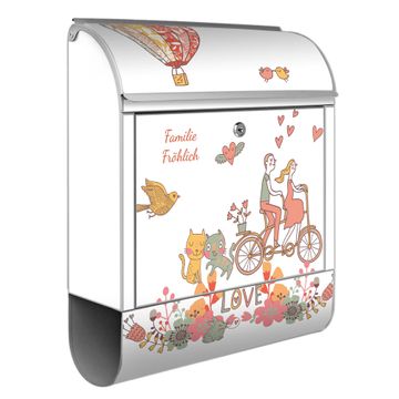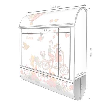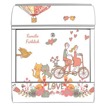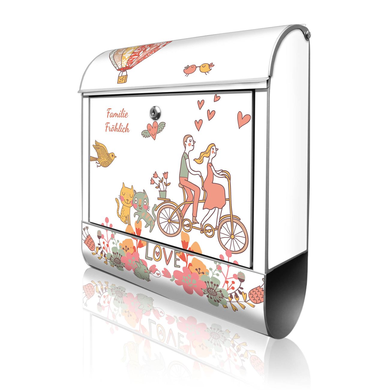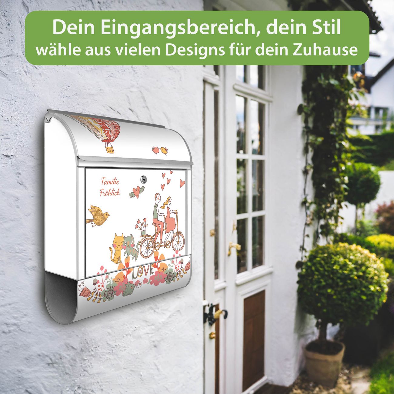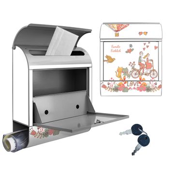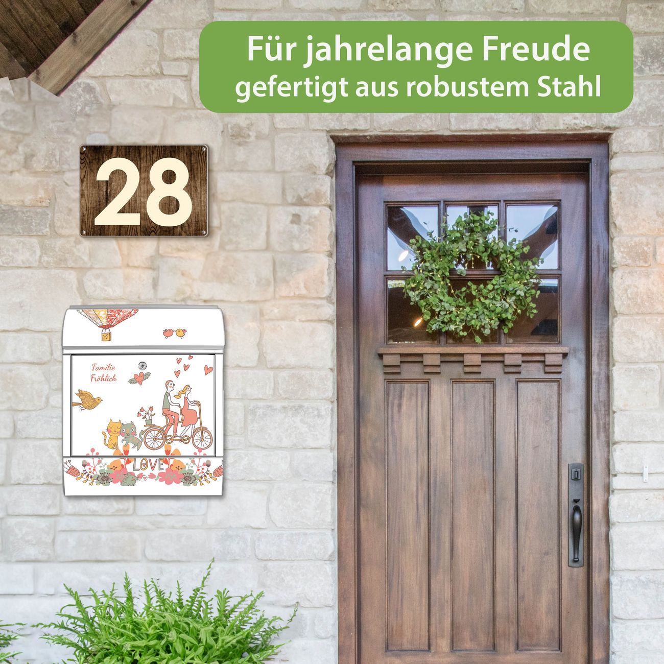 DESIGN: Der Postkasten mit Motiv Motiv Love hat ein sehr ansprechendes und ausgefallenes Design, damit entlocken Sie Ihren Nachbarn und dem Postboten ein Lächeln. Heben Sie Sich von der tristen grauen Masse ab, ohne auf Funktionalität zu verzichten. DETAILS: Der Postkasten besteht aus pulverbeschichtetem Stahl. Er ist 38x46x12,5cm groß. Das Motiv besteht aus einer wetter- und UV-resistenten Folie, die mit einem Schutzlaminat überzogen ist, sodass der Briefkasten zusätzlich vor Kratzern geschützt ist. Der Briefkasten wird mit Montagematerial, zusätzlich zwei Schlüssel sowie einer Bohrschablone geliefert. NUTZEN: Sie können diesen Briefkasten sowohl als Wandbriefkasten montieren oder einen passenden Ständer kaufen und als Standbriefkasten einbetonieren. Die Größe bietet genügend Platz für Sendungen aller Art, der Einwurf fasst auch größere A4 Sendungen. BANJADO: Ihr Briefkasten wird in Sachsen in einer kleinen Manufaktur von Hand veredelt. Die Motivfolie ist lösungsmittelfrei und schutzlaminiert für einen langen Halt. Wir legen großen Wert auf die Verbindung von Funktionalität und Design. Sie erhalten Handarbeit aus Sachsen.