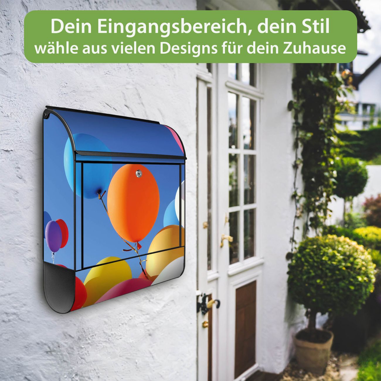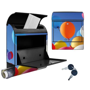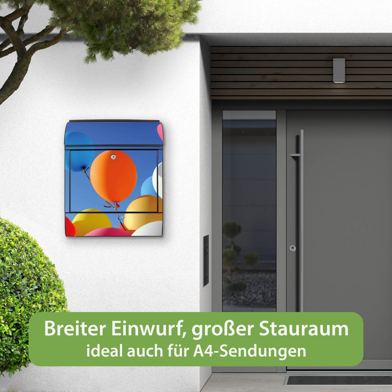DESIGN: Der Postkasten mit Motiv Motiv Luftballons hat ein sehr ansprechendes und ausgefallenes Design, damit entlocken Sie Ihren Nachbarn und dem Postboten ein Lächeln. Heben Sie Sich von der tristen grauen Masse ab, ohne auf Funktionalität zu verzichten. DETAILS: Der Postkasten besteht aus pulverbeschichtetem Stahl. Er ist 38x46x12,5cm groß. Das Motiv besteht aus einer wetter- und UV-resistenten Folie, die mit einem Schutzlaminat überzogen ist, sodass der Briefkasten zusätzlich vor Kratzern geschützt ist. Der Briefkasten wird mit Montagematerial, zusätzlich zwei Schlüssel sowie einer Bohrschablone geliefert. NUTZEN: Sie können diesen Briefkasten sowohl als Wandbriefkasten montieren oder einen passenden Ständer kaufen und als Standbriefkasten einbetonieren. Die Größe bietet genügend Platz für Sendungen aller Art, der Einwurf fasst auch größere A4 Sendungen. BANJADO: Ihr Briefkasten wird in Sachsen in einer kleinen Manufaktur von Hand veredelt. Die Motivfolie ist lösungsmittelfrei und schutzlaminiert für einen langen Halt. Wir legen großen Wert auf die Verbindung von Funktionalität und Design. Sie erhalten Handarbeit aus Sachsen.