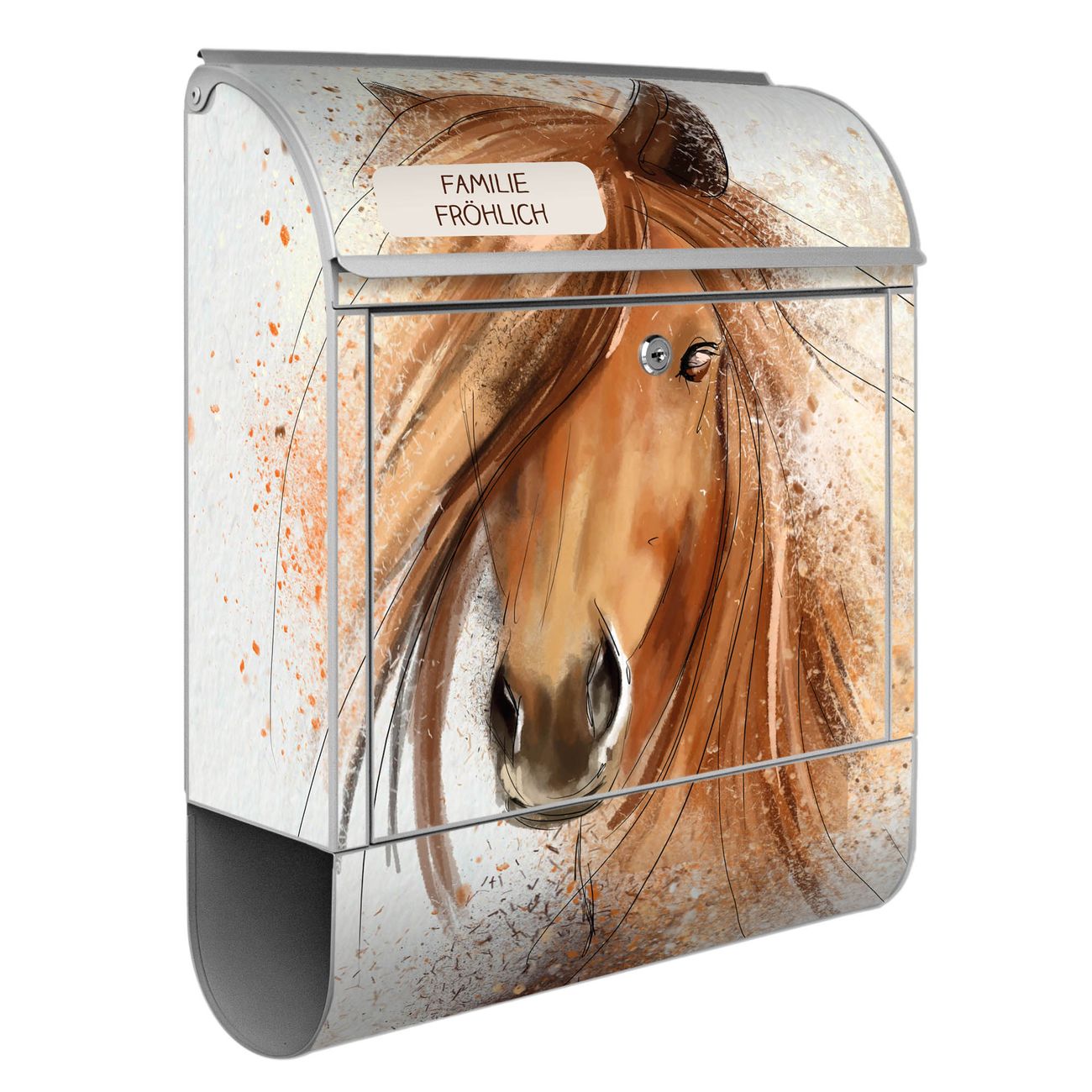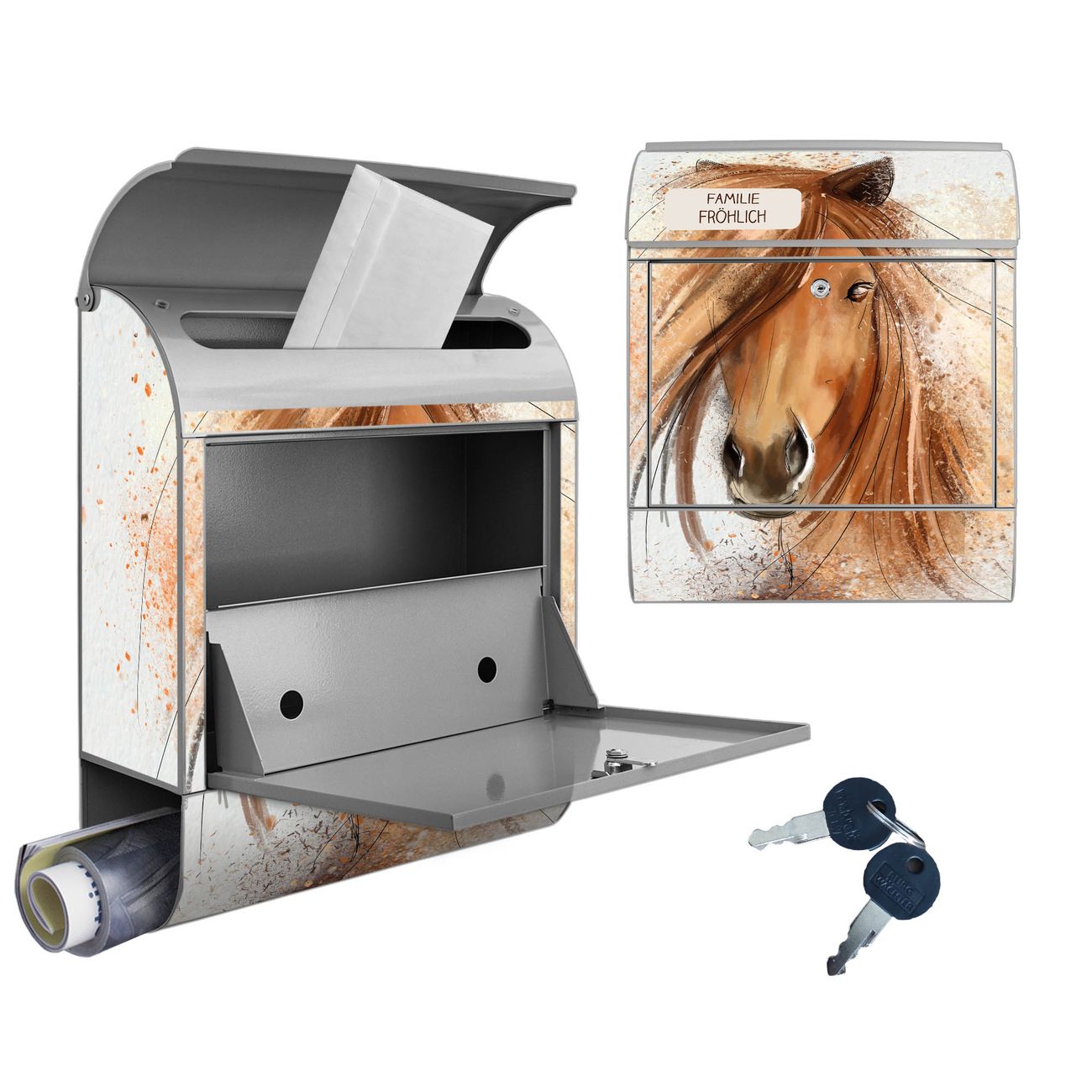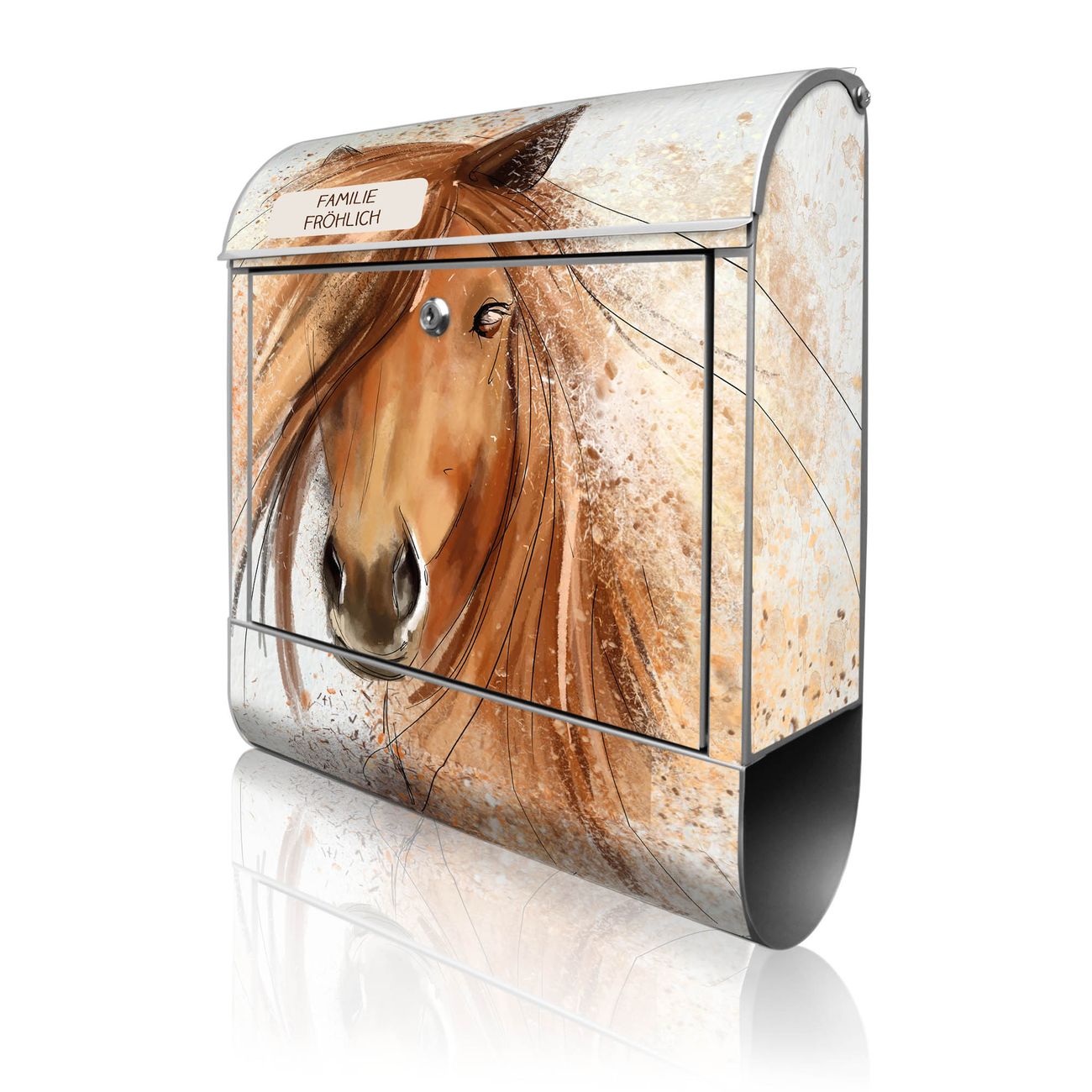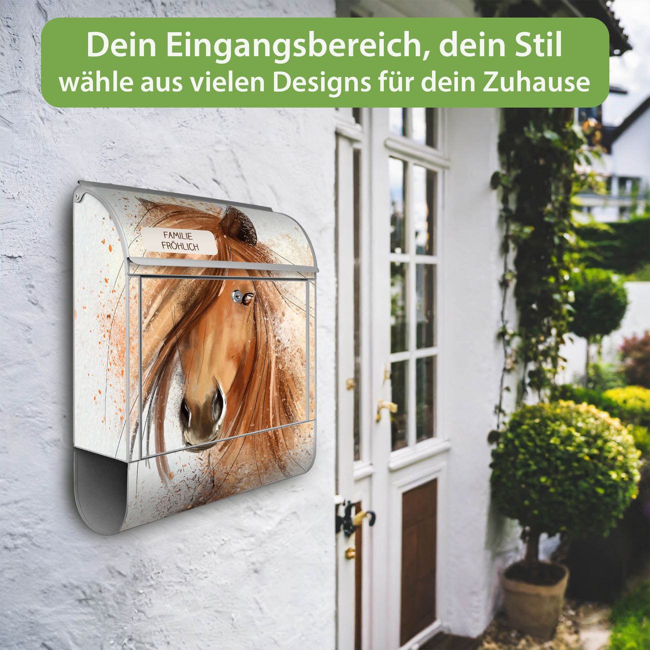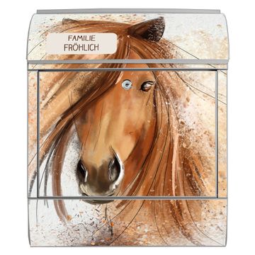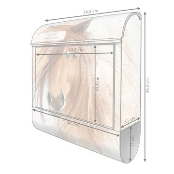 DESIGN: Der Postkasten mit Motiv Motiv Magic Horse hat ein sehr ansprechendes und ausgefallenes Design, damit entlocken Sie Ihren Nachbarn und dem Postboten ein Lächeln. Heben Sie Sich von der tristen grauen Masse ab, ohne auf Funktionalität zu verzichten. DETAILS: Der Postkasten besteht aus pulverbeschichtetem Stahl. Er ist 38x46x12,5cm groß. Das Motiv besteht aus einer wetter- und UV-resistenten Folie, die mit einem Schutzlaminat überzogen ist, sodass der Briefkasten zusätzlich vor Kratzern geschützt ist. Der Briefkasten wird mit Montagematerial, zusätzlich zwei Schlüssel sowie einer Bohrschablone geliefert. NUTZEN: Sie können diesen Briefkasten sowohl als Wandbriefkasten montieren oder einen passenden Ständer kaufen und als Standbriefkasten einbetonieren. Die Größe bietet genügend Platz für Sendungen aller Art, der Einwurf fasst auch größere A4 Sendungen. BANJADO: Ihr Briefkasten wird in Sachsen in einer kleinen Manufaktur von Hand veredelt. Die Motivfolie ist lösungsmittelfrei und schutzlaminiert für einen langen Halt. Wir legen großen Wert auf die Verbindung von Funktionalität und Design. Sie erhalten Handarbeit aus Sachsen.