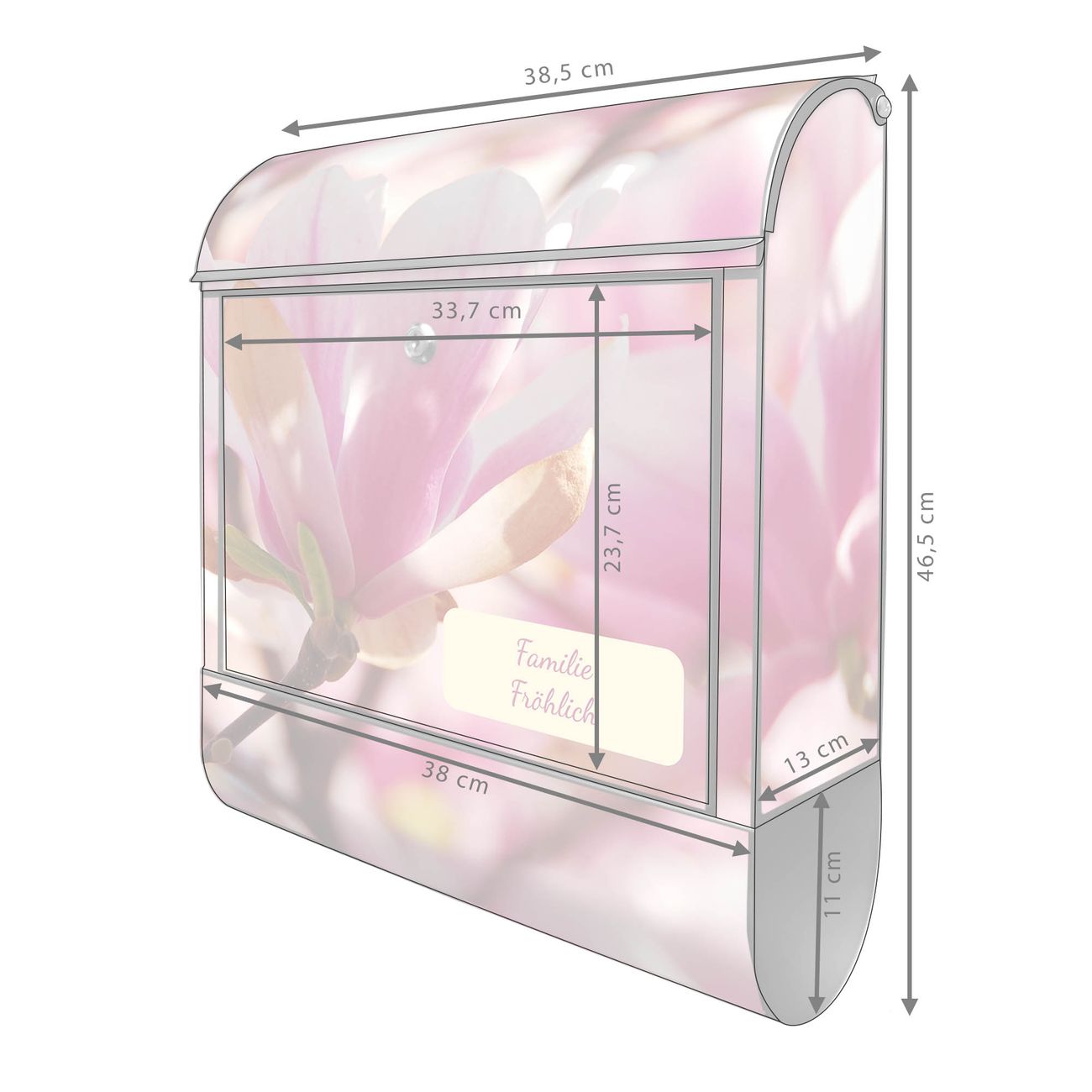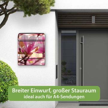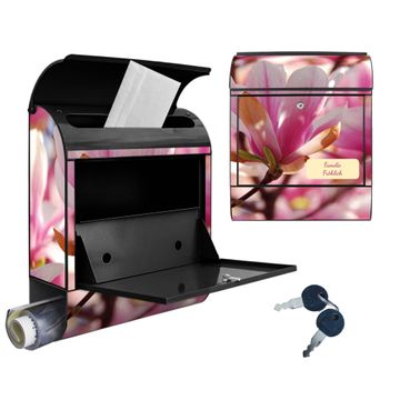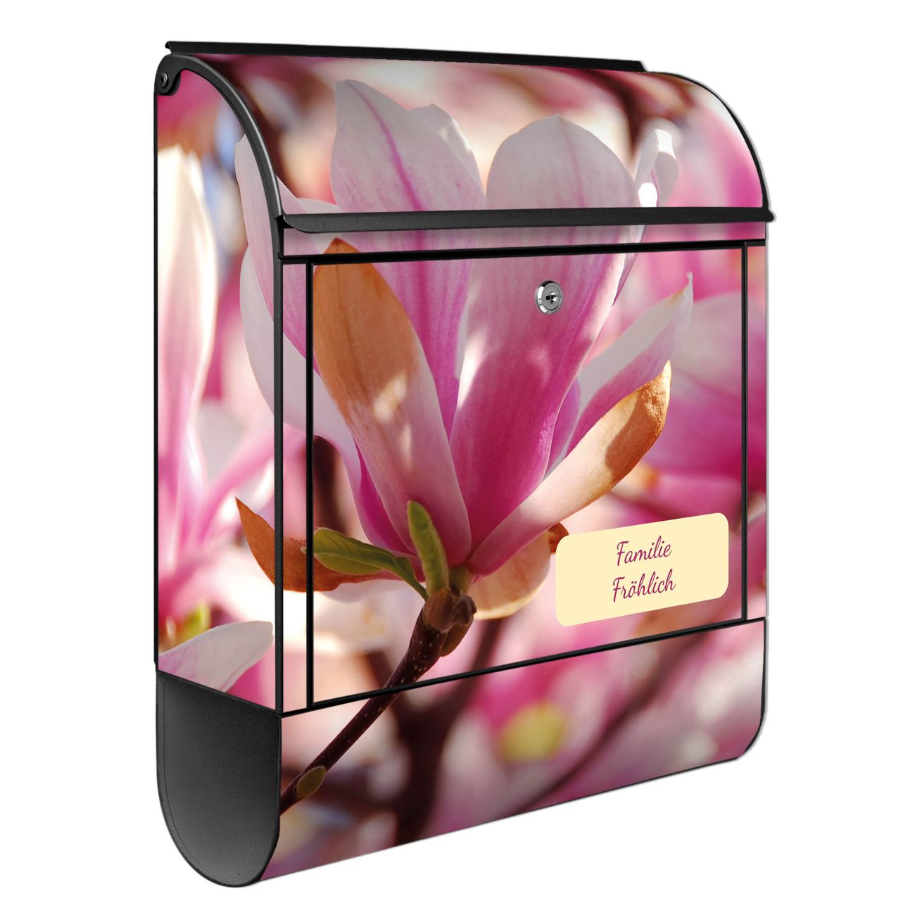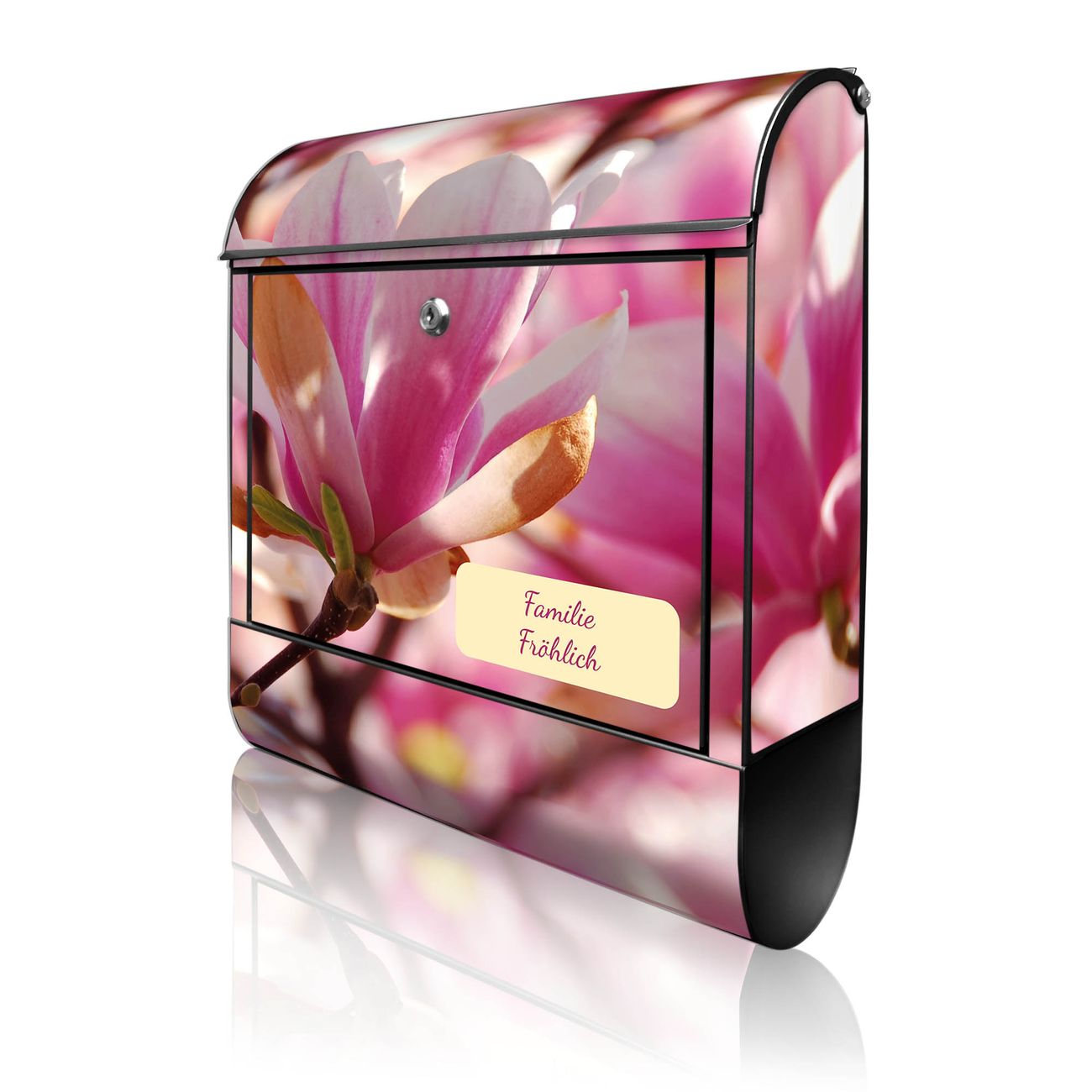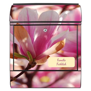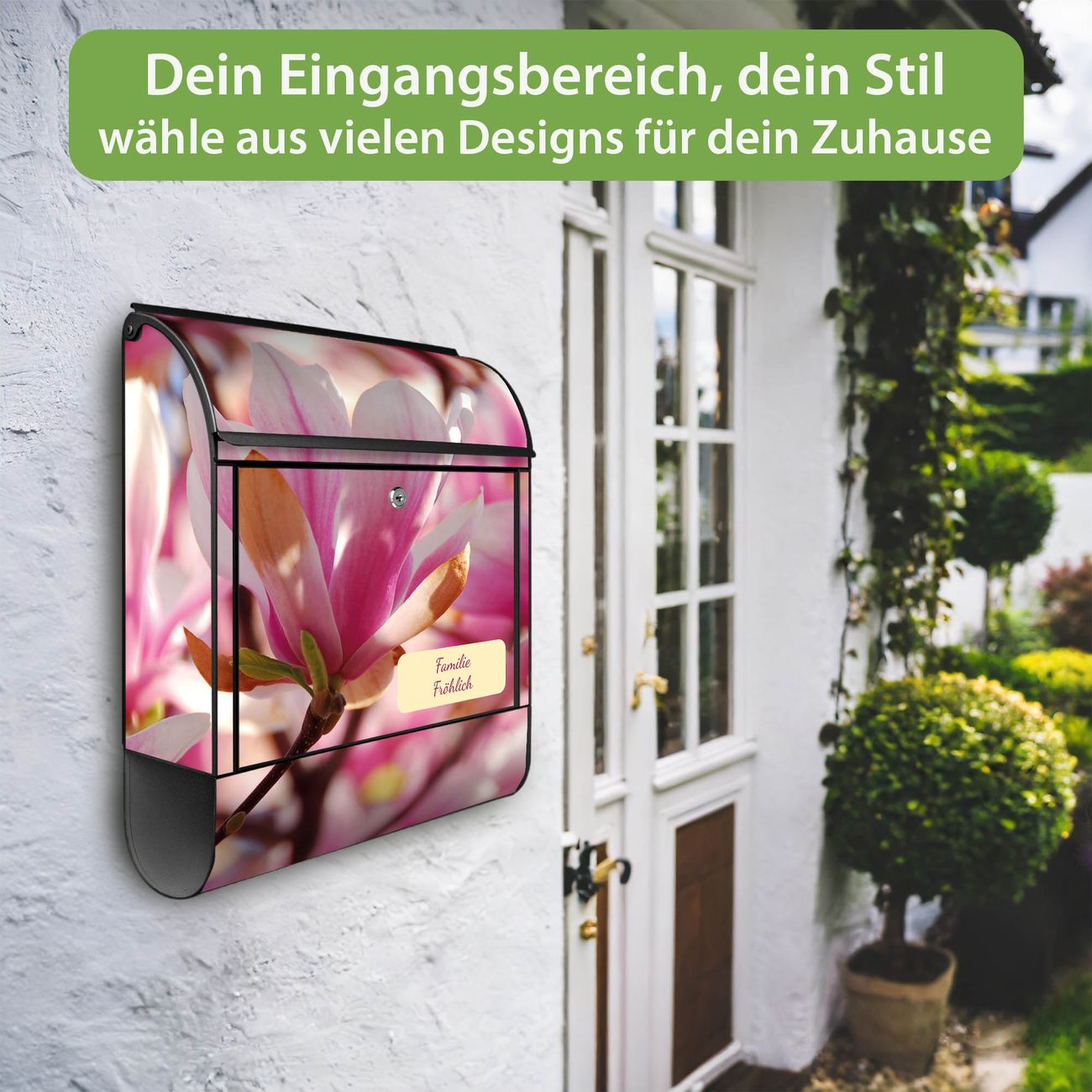 DESIGN: Der Postkasten mit Motiv Motiv Magnolia hat ein sehr ansprechendes und ausgefallenes Design, damit entlocken Sie Ihren Nachbarn und dem Postboten ein Lächeln. Heben Sie Sich von der tristen grauen Masse ab, ohne auf Funktionalität zu verzichten. DETAILS: Der Postkasten besteht aus pulverbeschichtetem Stahl. Er ist 38x46x12,5cm groß. Das Motiv besteht aus einer wetter- und UV-resistenten Folie, die mit einem Schutzlaminat überzogen ist, sodass der Briefkasten zusätzlich vor Kratzern geschützt ist. Der Briefkasten wird mit Montagematerial, zusätzlich zwei Schlüssel sowie einer Bohrschablone geliefert. NUTZEN: Sie können diesen Briefkasten sowohl als Wandbriefkasten montieren oder einen passenden Ständer kaufen und als Standbriefkasten einbetonieren. Die Größe bietet genügend Platz für Sendungen aller Art, der Einwurf fasst auch größere A4 Sendungen. BANJADO: Ihr Briefkasten wird in Sachsen in einer kleinen Manufaktur von Hand veredelt. Die Motivfolie ist lösungsmittelfrei und schutzlaminiert für einen langen Halt. Wir legen großen Wert auf die Verbindung von Funktionalität und Design. Sie erhalten Handarbeit aus Sachsen.