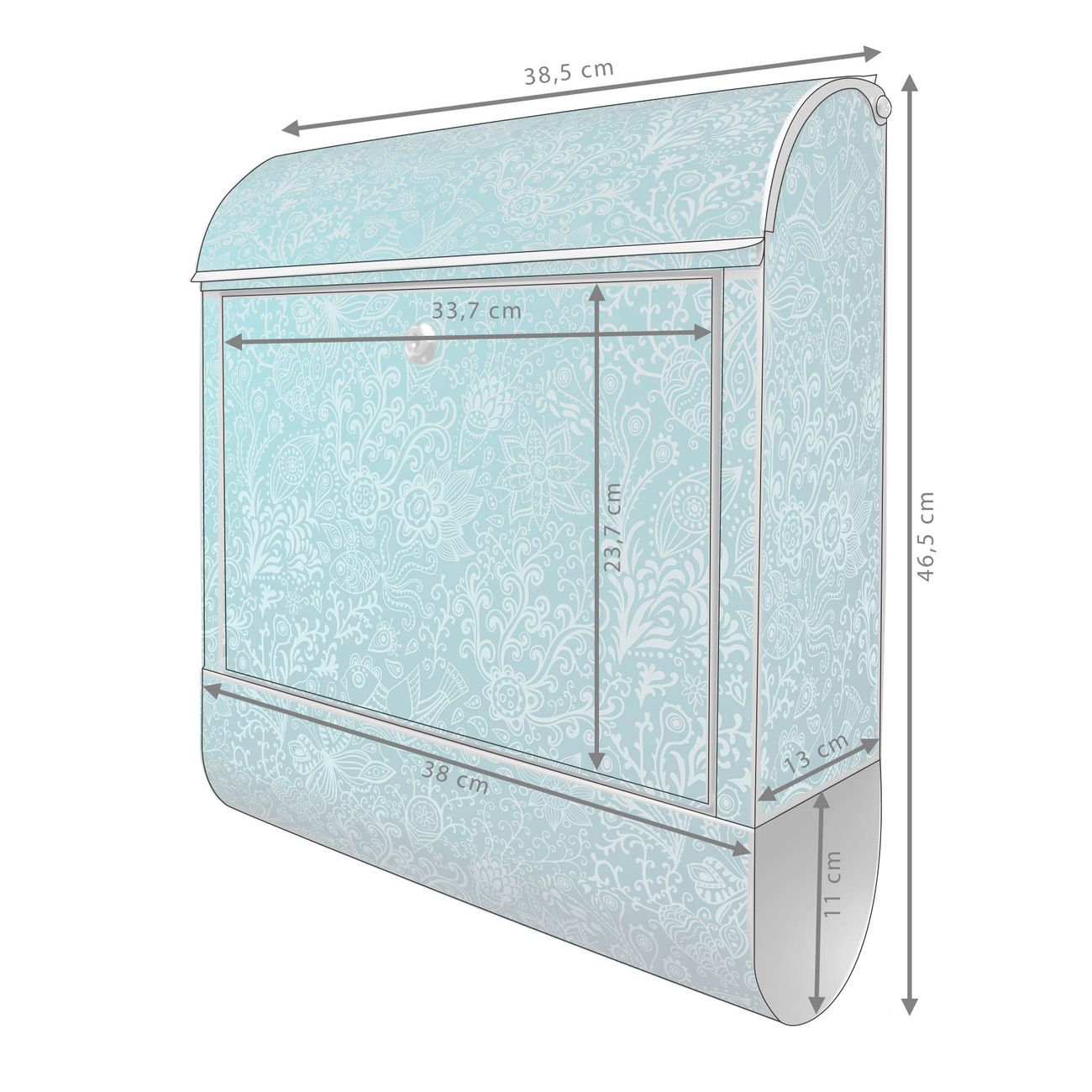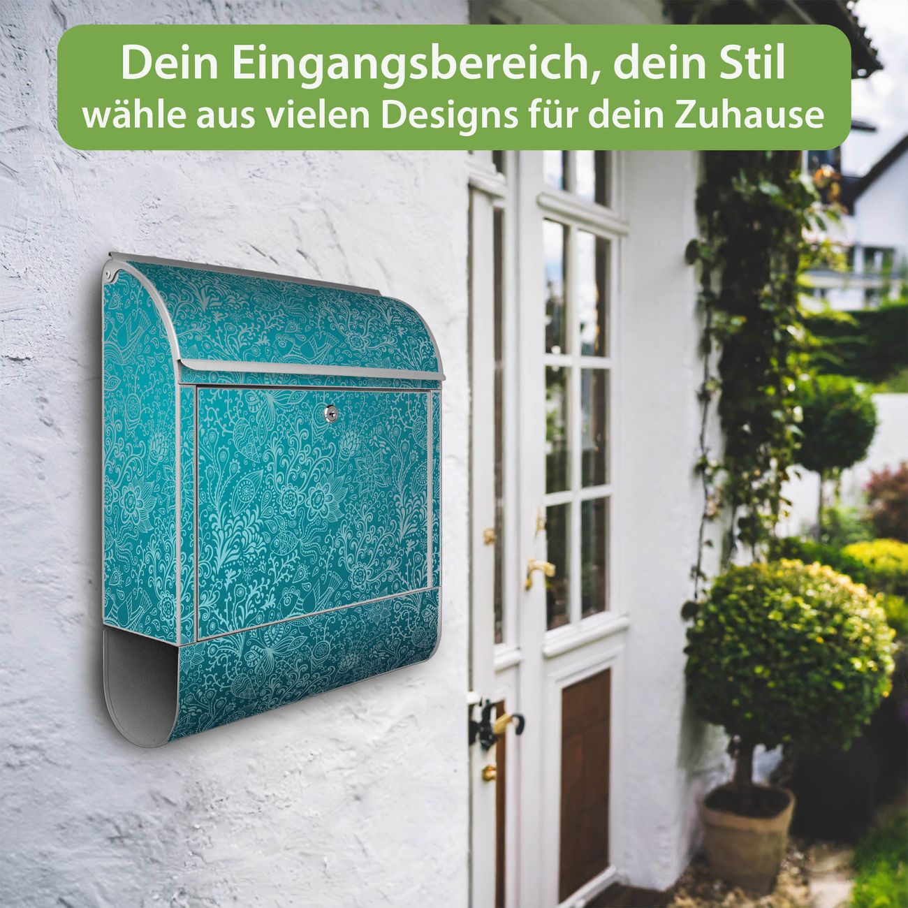 DESIGN: Der Postkasten mit Motiv Motiv Mandala Landschaft hat ein sehr ansprechendes und ausgefallenes Design, damit entlocken Sie Ihren Nachbarn und dem Postboten ein Lächeln. Heben Sie Sich von der tristen grauen Masse ab, ohne auf Funktionalität zu verzichten. DETAILS: Der Postkasten besteht aus pulverbeschichtetem Stahl. Er ist 38x46x12,5cm groß. Das Motiv besteht aus einer wetter- und UV-resistenten Folie, die mit einem Schutzlaminat überzogen ist, sodass der Briefkasten zusätzlich vor Kratzern geschützt ist. Der Briefkasten wird mit Montagematerial, zusätzlich zwei Schlüssel sowie einer Bohrschablone geliefert. NUTZEN: Sie können diesen Briefkasten sowohl als Wandbriefkasten montieren oder einen passenden Ständer kaufen und als Standbriefkasten einbetonieren. Die Größe bietet genügend Platz für Sendungen aller Art, der Einwurf fasst auch größere A4 Sendungen. BANJADO: Ihr Briefkasten wird in Sachsen in einer kleinen Manufaktur von Hand veredelt. Die Motivfolie ist lösungsmittelfrei und schutzlaminiert für einen langen Halt. Wir legen großen Wert auf die Verbindung von Funktionalität und Design. Sie erhalten Handarbeit aus Sachsen.
