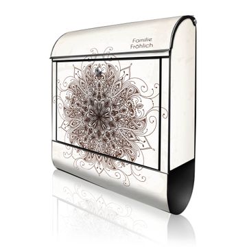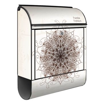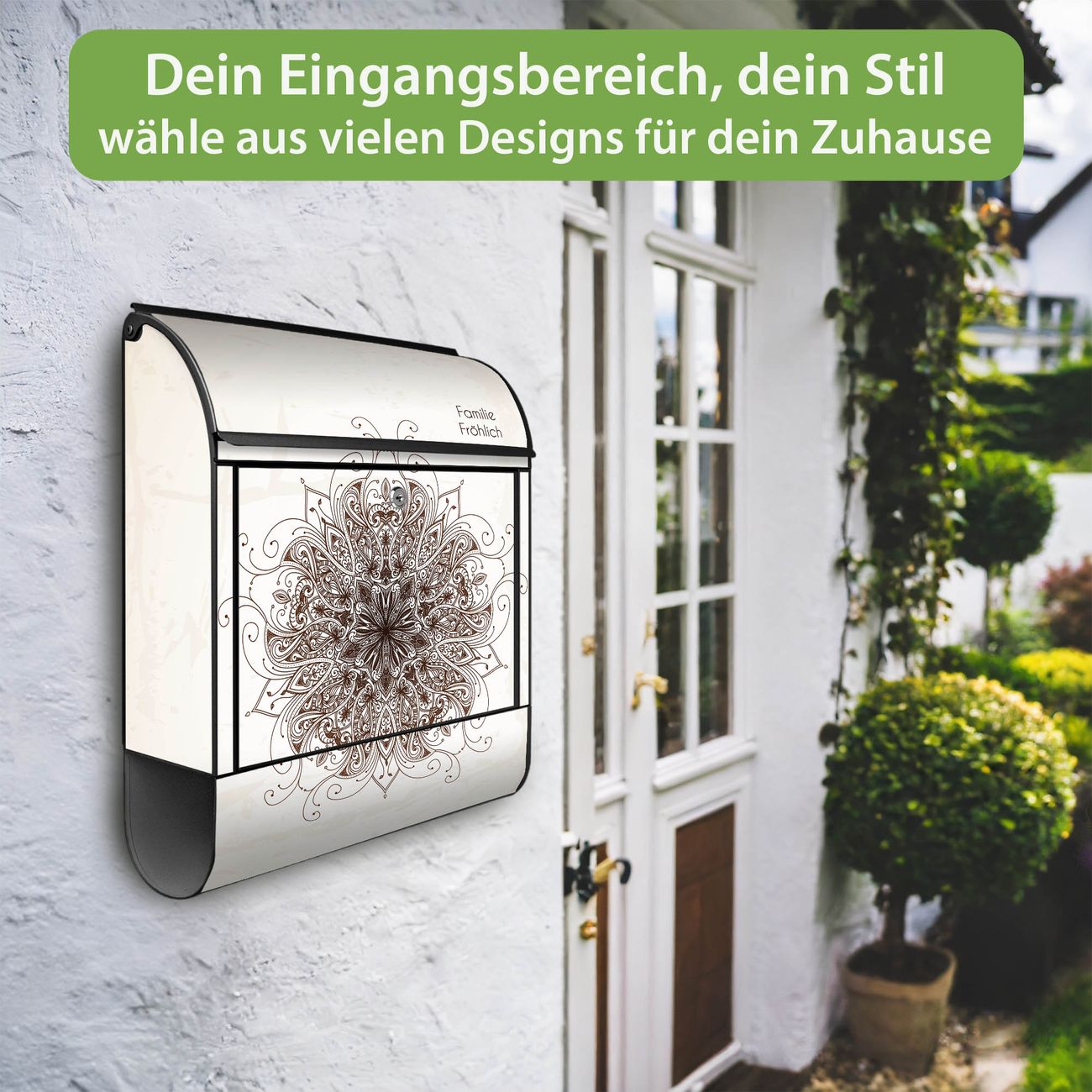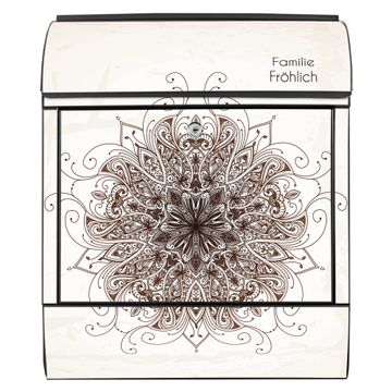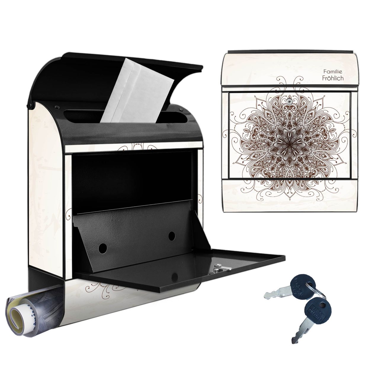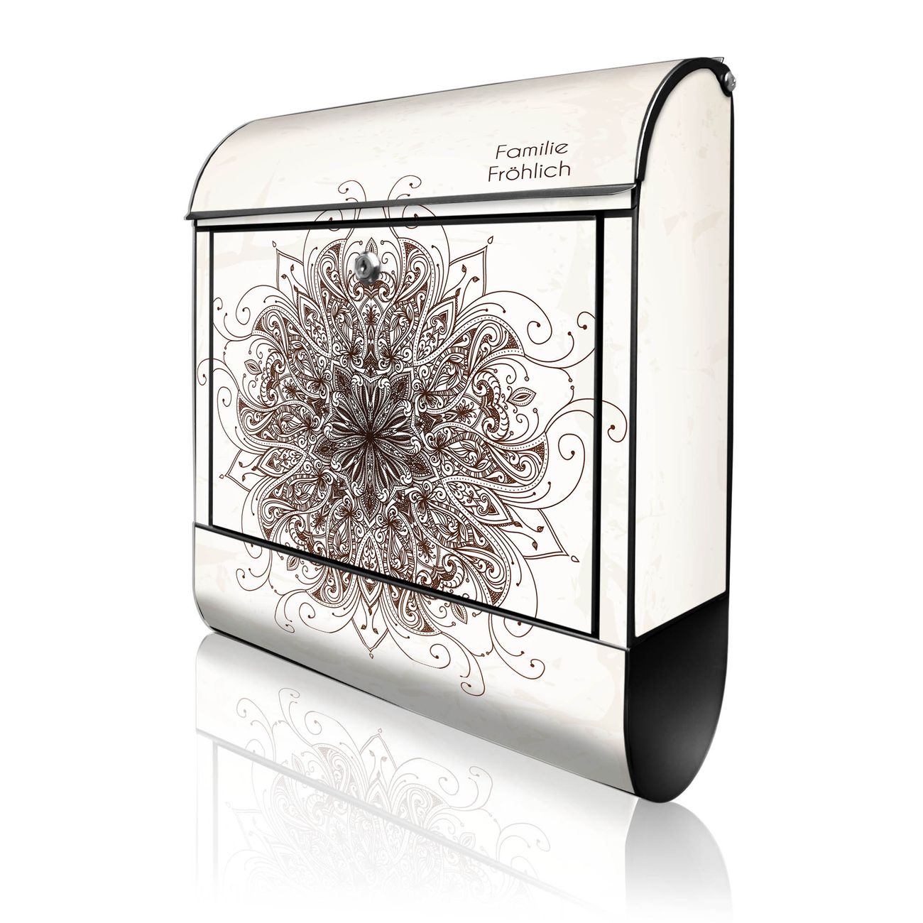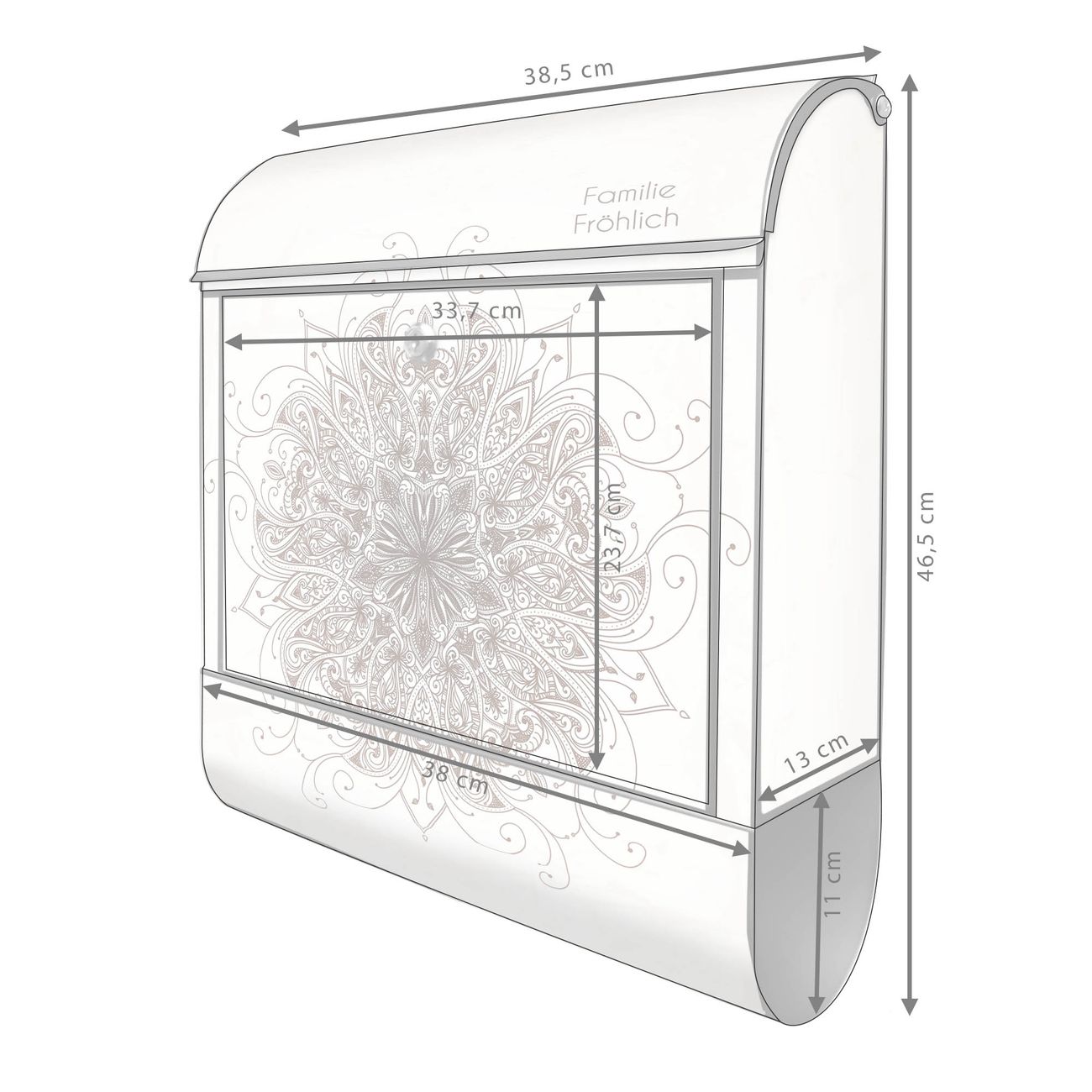 DESIGN: Der Postkasten mit Motiv Motiv Mehendi hat ein sehr ansprechendes und ausgefallenes Design, damit entlocken Sie Ihren Nachbarn und dem Postboten ein Lächeln. Heben Sie Sich von der tristen grauen Masse ab, ohne auf Funktionalität zu verzichten. DETAILS: Der Postkasten besteht aus pulverbeschichtetem Stahl. Er ist 38x46x12,5cm groß. Das Motiv besteht aus einer wetter- und UV-resistenten Folie, die mit einem Schutzlaminat überzogen ist, sodass der Briefkasten zusätzlich vor Kratzern geschützt ist. Der Briefkasten wird mit Montagematerial, zusätzlich zwei Schlüssel sowie einer Bohrschablone geliefert. NUTZEN: Sie können diesen Briefkasten sowohl als Wandbriefkasten montieren oder einen passenden Ständer kaufen und als Standbriefkasten einbetonieren. Die Größe bietet genügend Platz für Sendungen aller Art, der Einwurf fasst auch größere A4 Sendungen. BANJADO: Ihr Briefkasten wird in Sachsen in einer kleinen Manufaktur von Hand veredelt. Die Motivfolie ist lösungsmittelfrei und schutzlaminiert für einen langen Halt. Wir legen großen Wert auf die Verbindung von Funktionalität und Design. Sie erhalten Handarbeit aus Sachsen.