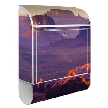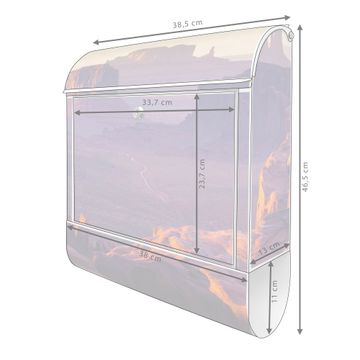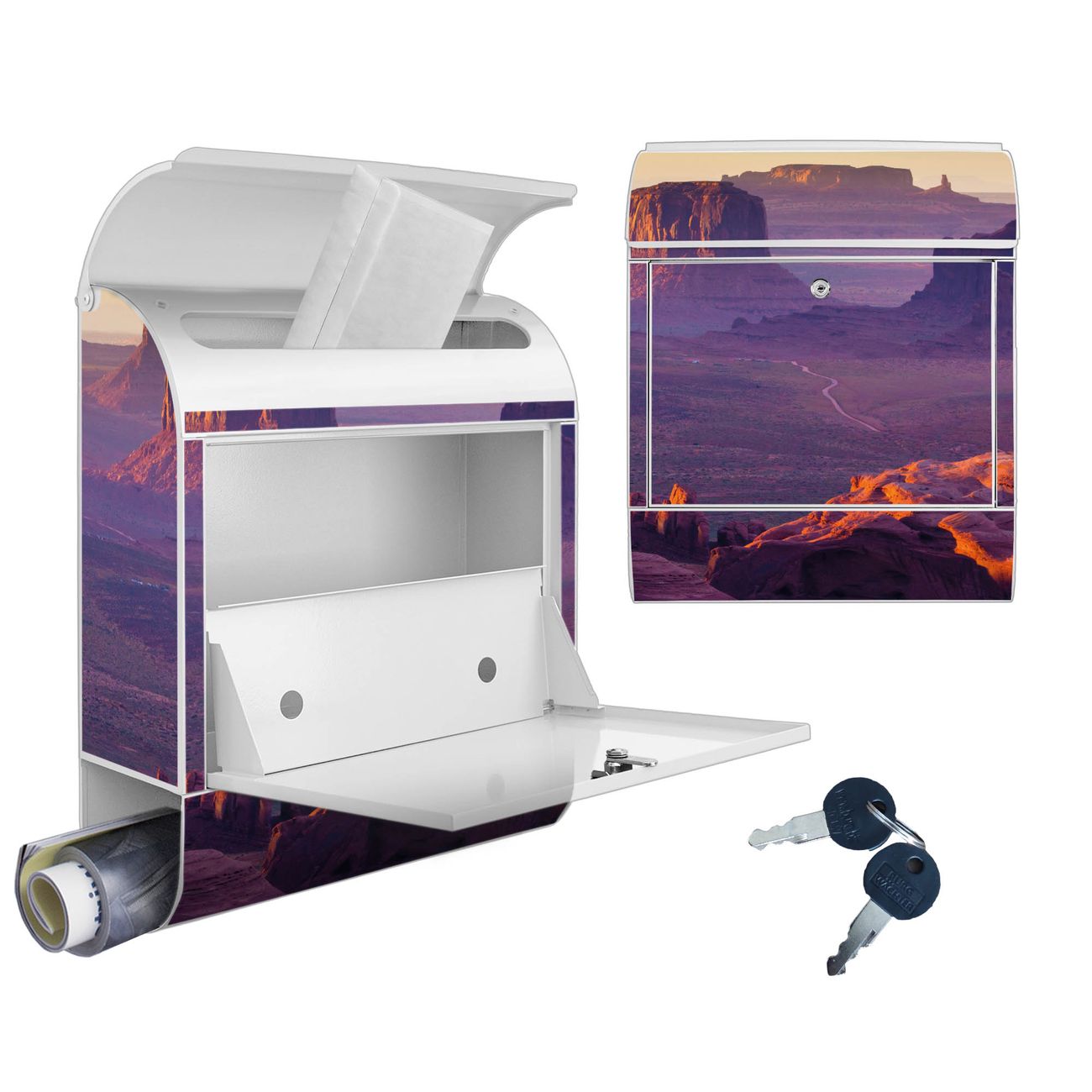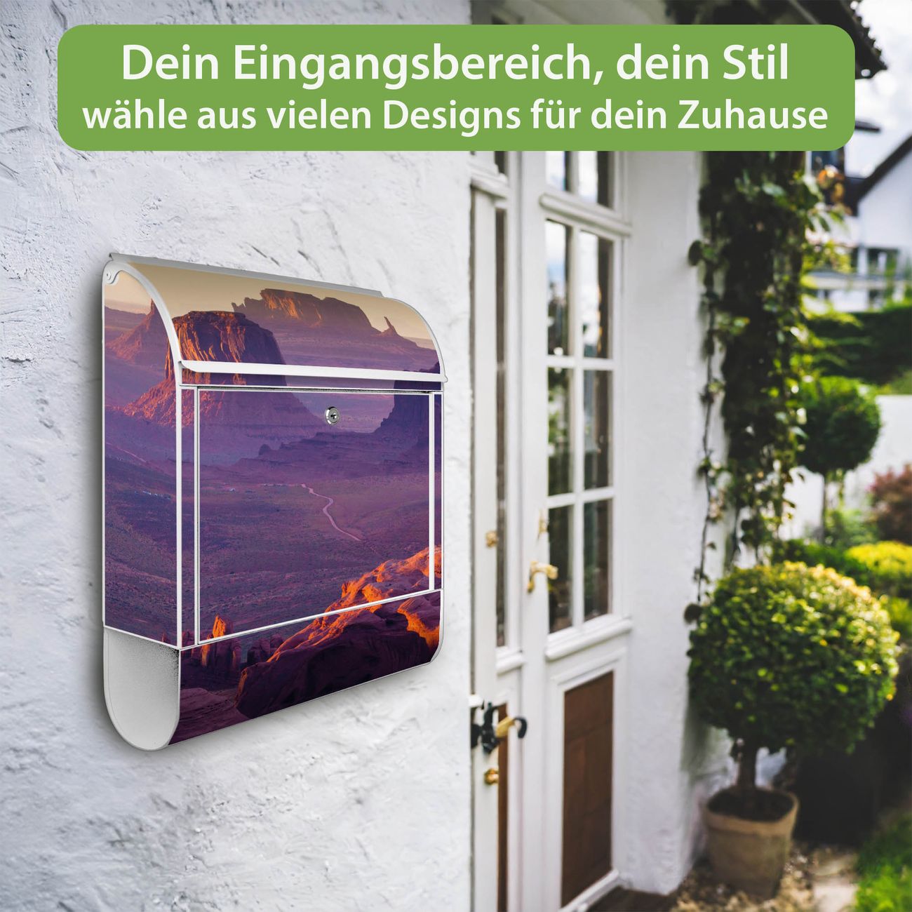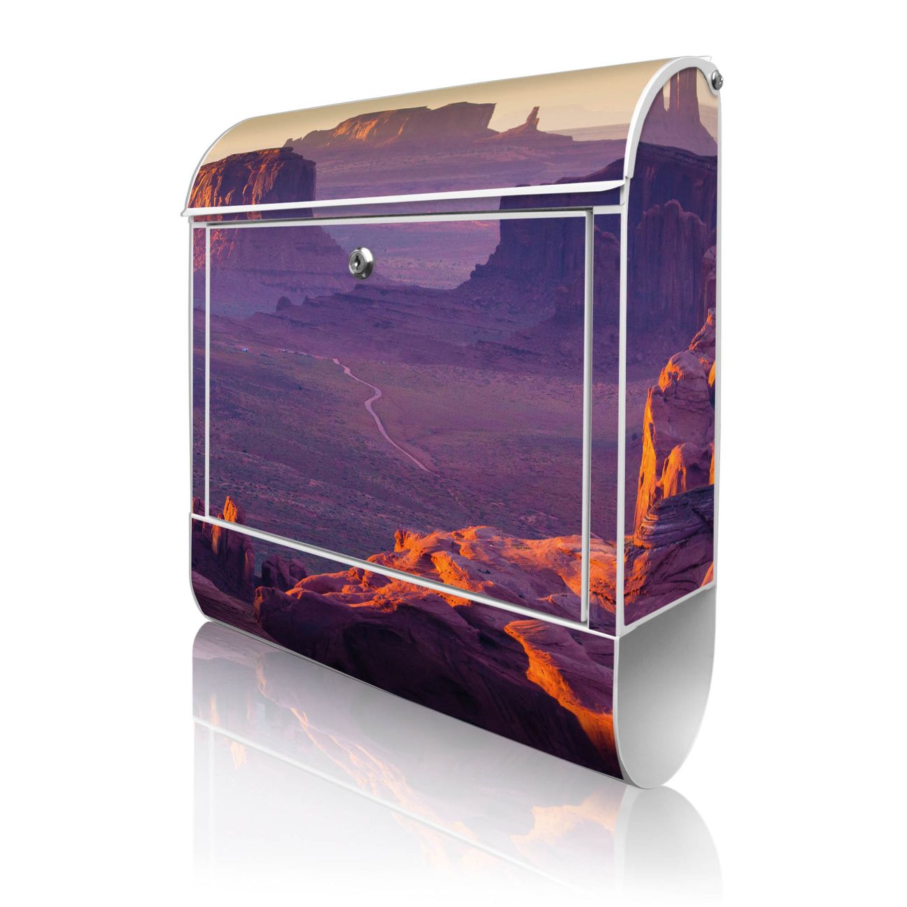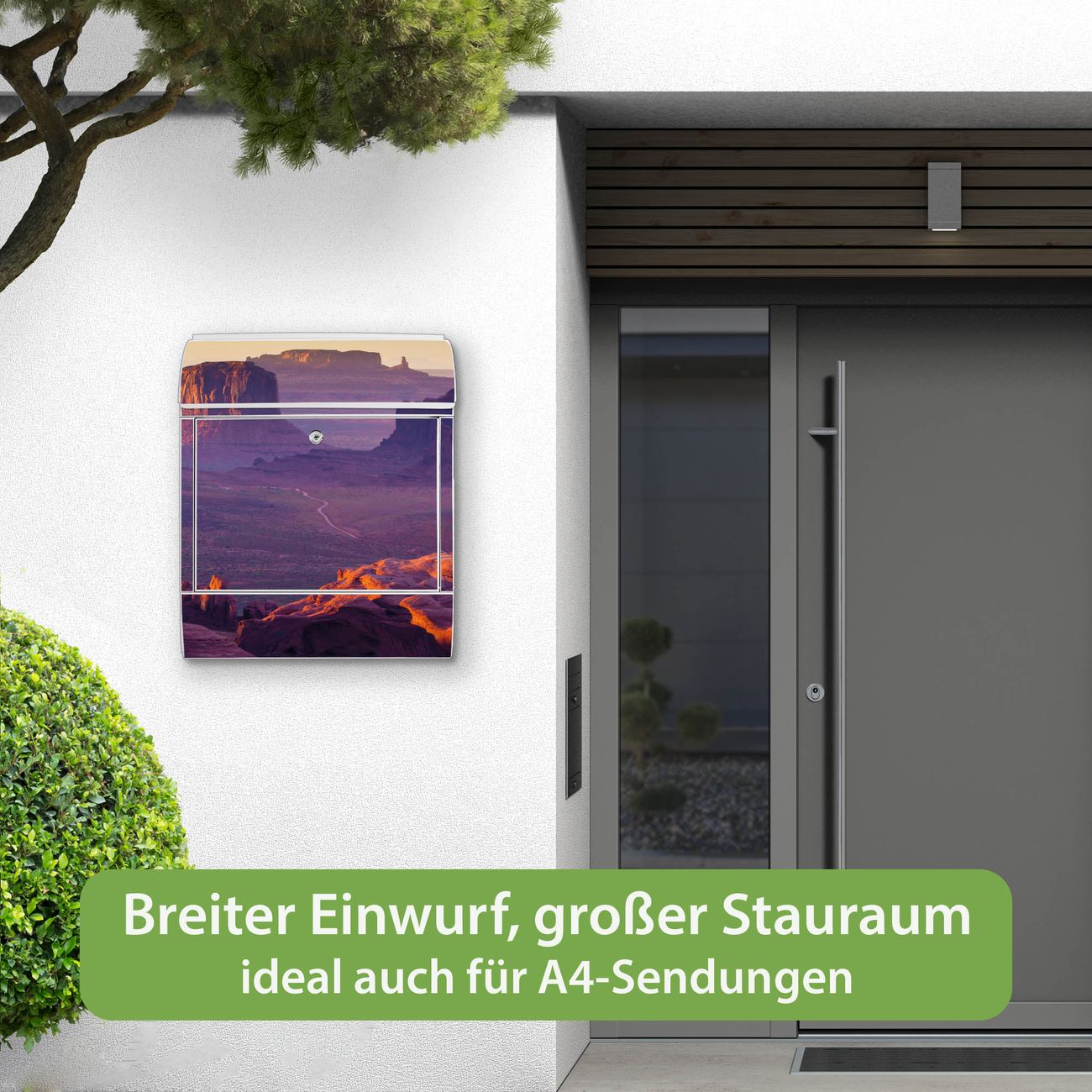DESIGN: Der Postkasten mit Motiv Motiv Monument Valley hat ein sehr ansprechendes und ausgefallenes Design, damit entlocken Sie Ihren Nachbarn und dem Postboten ein Lächeln. Heben Sie Sich von der tristen grauen Masse ab, ohne auf Funktionalität zu verzichten. DETAILS: Der Postkasten besteht aus pulverbeschichtetem Stahl. Er ist 38x46x12,5cm groß. Das Motiv besteht aus einer wetter- und UV-resistenten Folie, die mit einem Schutzlaminat überzogen ist, sodass der Briefkasten zusätzlich vor Kratzern geschützt ist. Der Briefkasten wird mit Montagematerial, zusätzlich zwei Schlüssel sowie einer Bohrschablone geliefert. NUTZEN: Sie können diesen Briefkasten sowohl als Wandbriefkasten montieren oder einen passenden Ständer kaufen und als Standbriefkasten einbetonieren. Die Größe bietet genügend Platz für Sendungen aller Art, der Einwurf fasst auch größere A4 Sendungen. BANJADO: Ihr Briefkasten wird in Sachsen in einer kleinen Manufaktur von Hand veredelt. Die Motivfolie ist lösungsmittelfrei und schutzlaminiert für einen langen Halt. Wir legen großen Wert auf die Verbindung von Funktionalität und Design. Sie erhalten Handarbeit aus Sachsen.