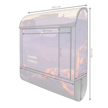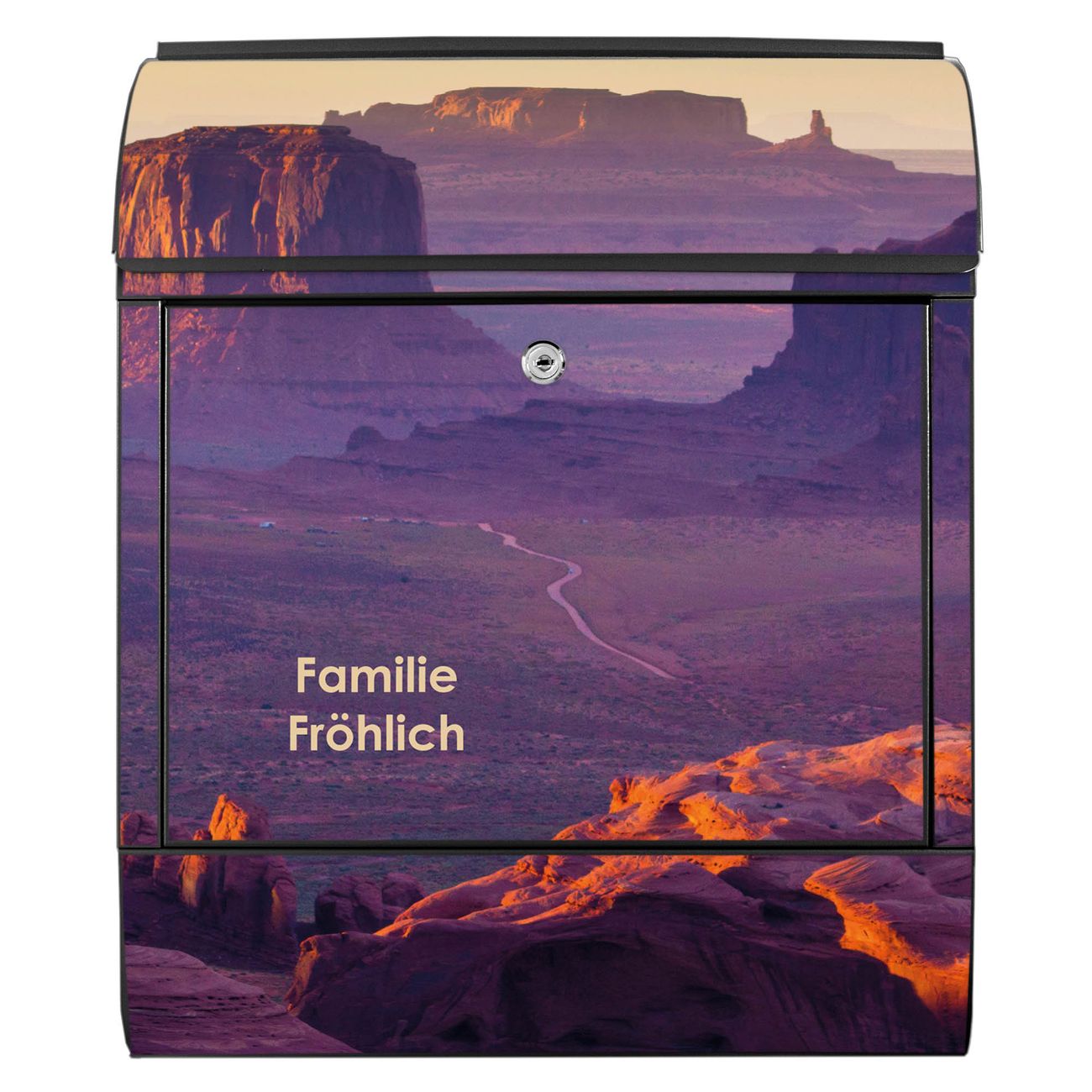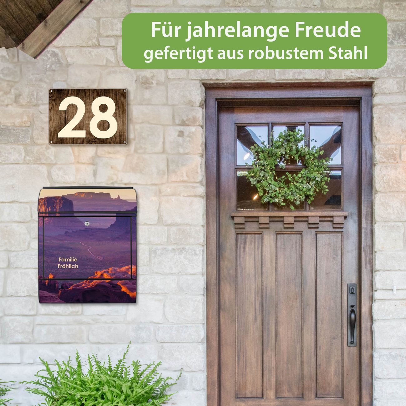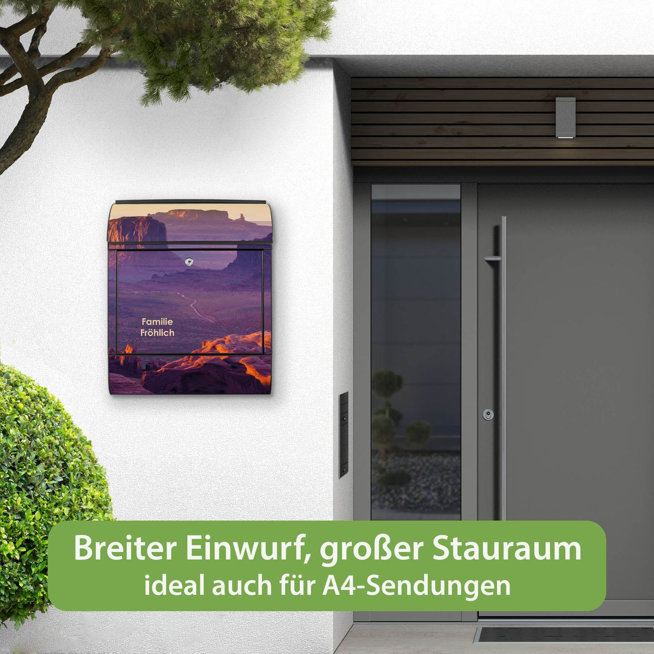 DESIGN: Der Postkasten mit Motiv Motiv Monument Valley hat ein sehr ansprechendes und ausgefallenes Design, damit entlocken Sie Ihren Nachbarn und dem Postboten ein Lächeln. Heben Sie Sich von der tristen grauen Masse ab, ohne auf Funktionalität zu verzichten. DETAILS: Der Postkasten besteht aus pulverbeschichtetem Stahl. Er ist 38x46x12,5cm groß. Das Motiv besteht aus einer wetter- und UV-resistenten Folie, die mit einem Schutzlaminat überzogen ist, sodass der Briefkasten zusätzlich vor Kratzern geschützt ist. Der Briefkasten wird mit Montagematerial, zusätzlich zwei Schlüssel sowie einer Bohrschablone geliefert. NUTZEN: Sie können diesen Briefkasten sowohl als Wandbriefkasten montieren oder einen passenden Ständer kaufen und als Standbriefkasten einbetonieren. Die Größe bietet genügend Platz für Sendungen aller Art, der Einwurf fasst auch größere A4 Sendungen. BANJADO: Ihr Briefkasten wird in Sachsen in einer kleinen Manufaktur von Hand veredelt. Die Motivfolie ist lösungsmittelfrei und schutzlaminiert für einen langen Halt. Wir legen großen Wert auf die Verbindung von Funktionalität und Design. Sie erhalten Handarbeit aus Sachsen.