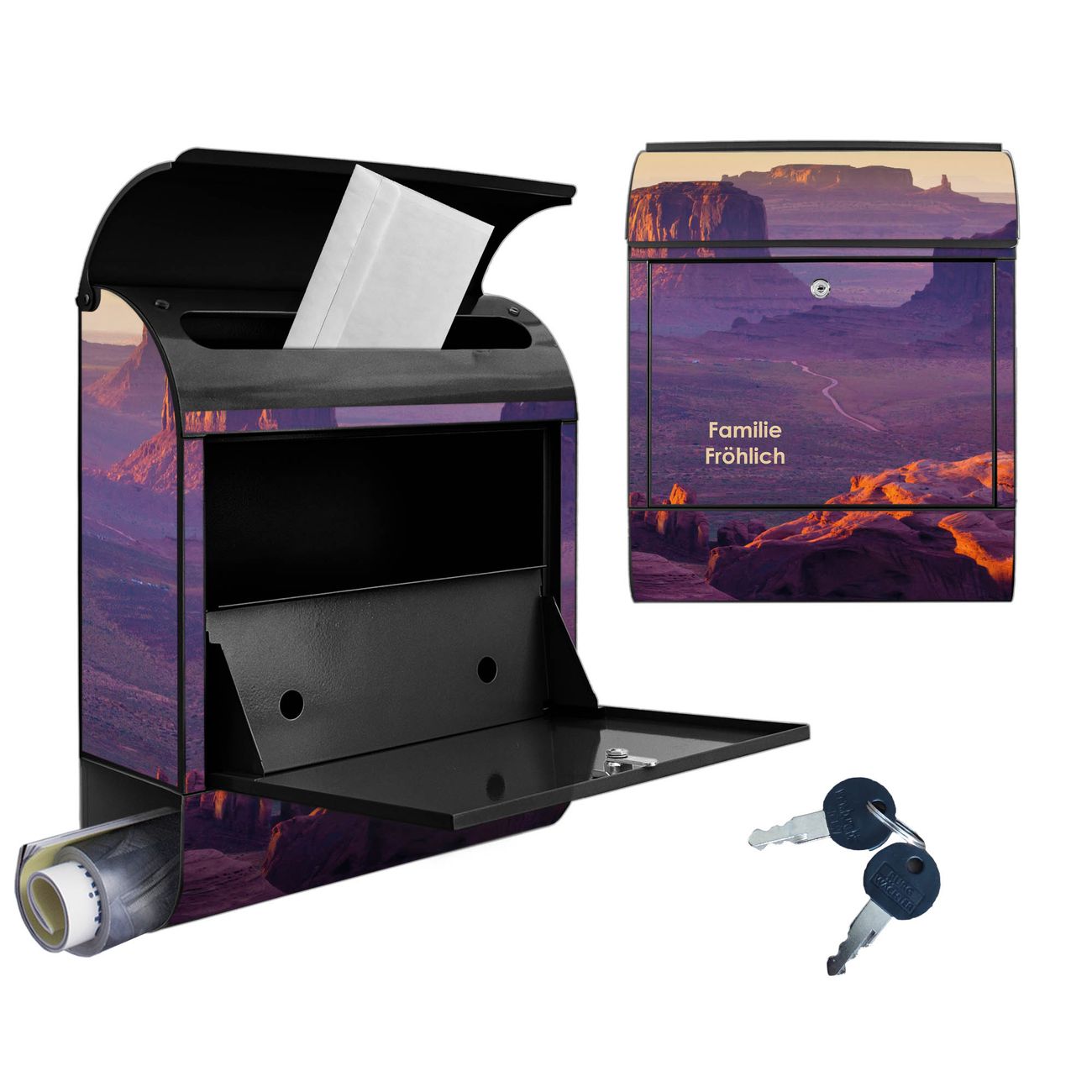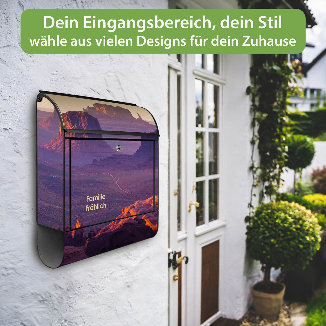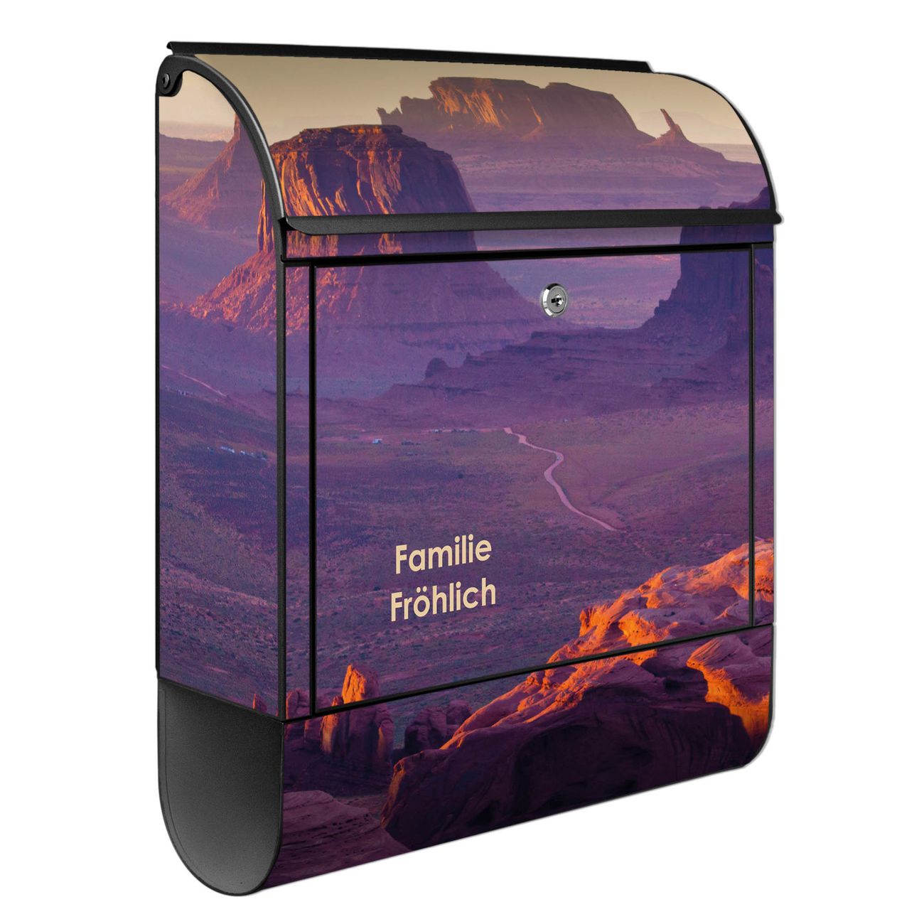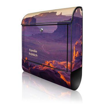DESIGN: Der Postkasten mit Motiv Motiv Monument Valley hat ein sehr ansprechendes und ausgefallenes Design, damit entlocken Sie Ihren Nachbarn und dem Postboten ein Lächeln. Heben Sie Sich von der tristen grauen Masse ab, ohne auf Funktionalität zu verzichten. DETAILS: Der Postkasten besteht aus pulverbeschichtetem Stahl. Er ist 38x46x12,5cm groß. Das Motiv besteht aus einer wetter- und UV-resistenten Folie, die mit einem Schutzlaminat überzogen ist, sodass der Briefkasten zusätzlich vor Kratzern geschützt ist. Der Briefkasten wird mit Montagematerial, zusätzlich zwei Schlüssel sowie einer Bohrschablone geliefert. NUTZEN: Sie können diesen Briefkasten sowohl als Wandbriefkasten montieren oder einen passenden Ständer kaufen und als Standbriefkasten einbetonieren. Die Größe bietet genügend Platz für Sendungen aller Art, der Einwurf fasst auch größere A4 Sendungen. BANJADO: Ihr Briefkasten wird in Sachsen in einer kleinen Manufaktur von Hand veredelt. Die Motivfolie ist lösungsmittelfrei und schutzlaminiert für einen langen Halt. Wir legen großen Wert auf die Verbindung von Funktionalität und Design. Sie erhalten Handarbeit aus Sachsen.