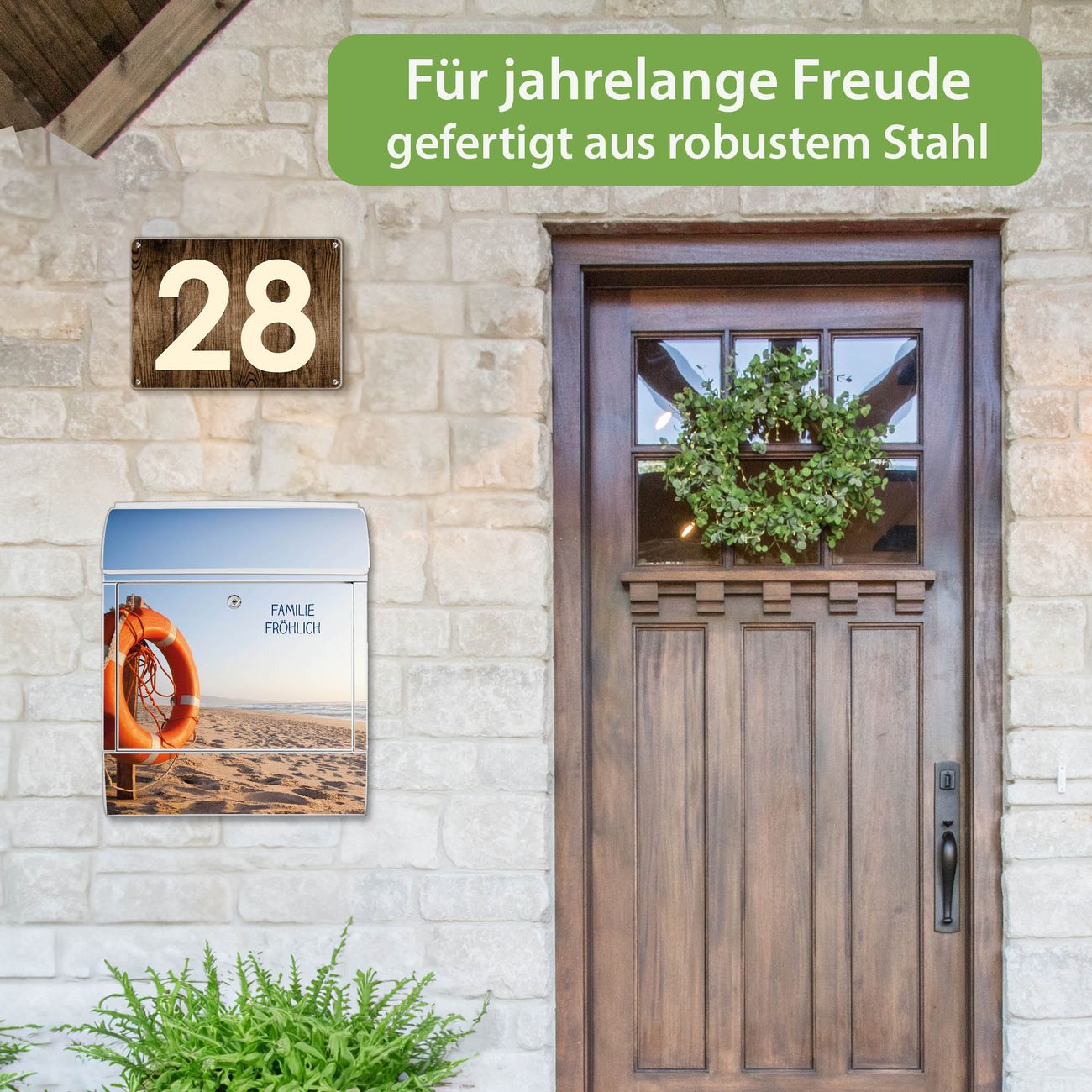 DESIGN: Der Postkasten mit Motiv Motiv Morgens Am Strand hat ein sehr ansprechendes und ausgefallenes Design, damit entlocken Sie Ihren Nachbarn und dem Postboten ein Lächeln. Heben Sie Sich von der tristen grauen Masse ab, ohne auf Funktionalität zu verzichten. DETAILS: Der Postkasten besteht aus pulverbeschichtetem Stahl. Er ist 38x46x12,5cm groß. Das Motiv besteht aus einer wetter- und UV-resistenten Folie, die mit einem Schutzlaminat überzogen ist, sodass der Briefkasten zusätzlich vor Kratzern geschützt ist. Der Briefkasten wird mit Montagematerial, zusätzlich zwei Schlüssel sowie einer Bohrschablone geliefert. NUTZEN: Sie können diesen Briefkasten sowohl als Wandbriefkasten montieren oder einen passenden Ständer kaufen und als Standbriefkasten einbetonieren. Die Größe bietet genügend Platz für Sendungen aller Art, der Einwurf fasst auch größere A4 Sendungen. BANJADO: Ihr Briefkasten wird in Sachsen in einer kleinen Manufaktur von Hand veredelt. Die Motivfolie ist lösungsmittelfrei und schutzlaminiert für einen langen Halt. Wir legen großen Wert auf die Verbindung von Funktionalität und Design. Sie erhalten Handarbeit aus Sachsen.