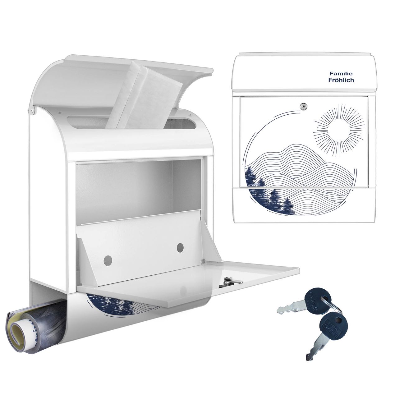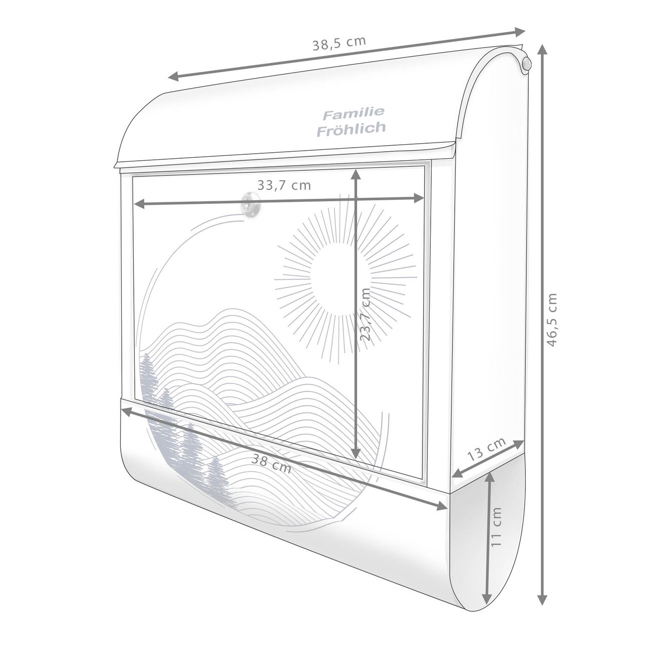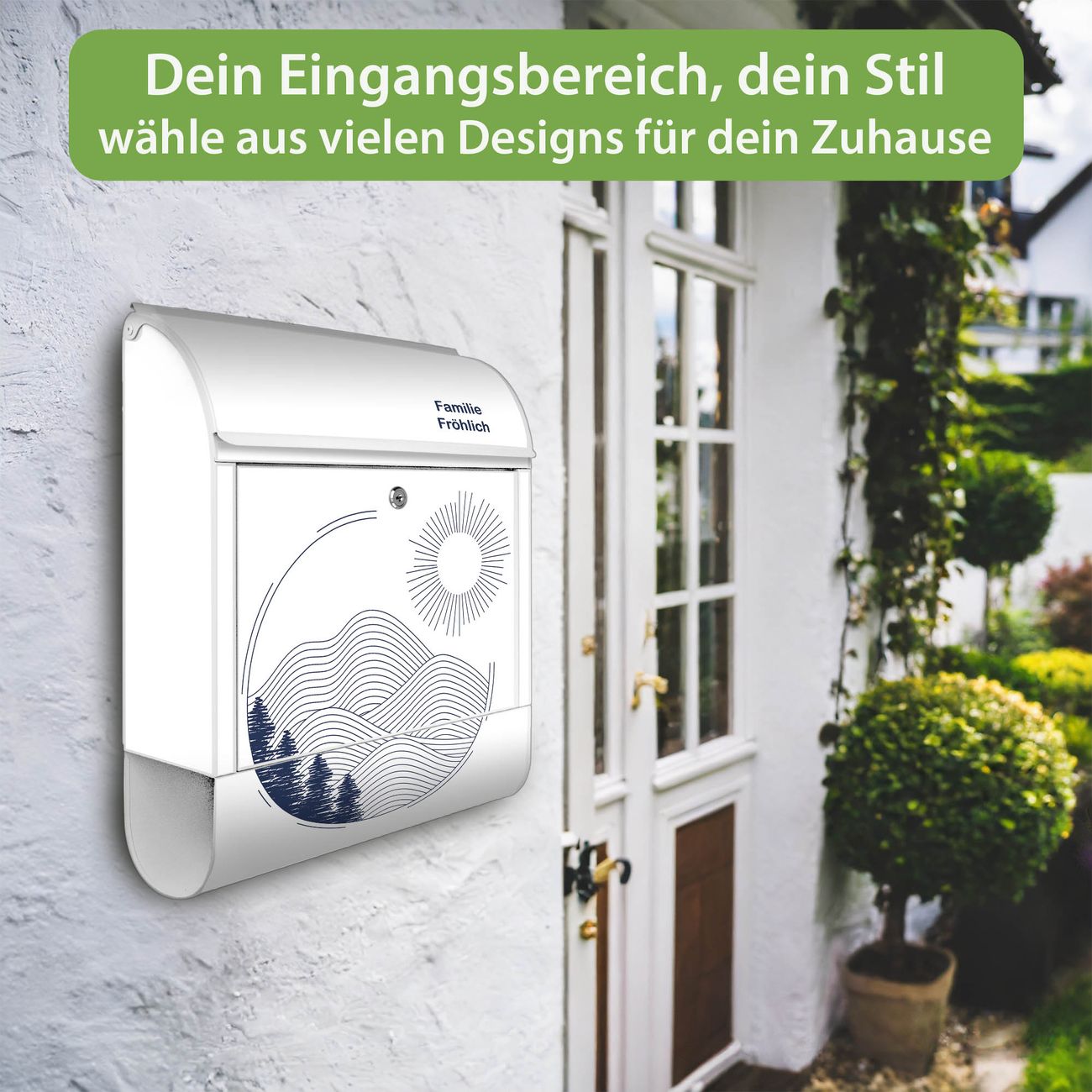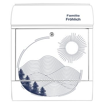 DESIGN: Der Postkasten mit Motiv Motiv Abstrakte Landschaft hat ein sehr ansprechendes und ausgefallenes Design, damit entlocken Sie Ihren Nachbarn und dem Postboten ein Lächeln. Heben Sie Sich von der tristen grauen Masse ab, ohne auf Funktionalität zu verzichten. DETAILS: Der Postkasten besteht aus pulverbeschichtetem Stahl. Er ist 38x46x12,5cm groß. Das Motiv besteht aus einer wetter- und UV-resistenten Folie, die mit einem Schutzlaminat überzogen ist, sodass der Briefkasten zusätzlich vor Kratzern geschützt ist. Der Briefkasten wird mit Montagematerial, zusätzlich zwei Schlüssel sowie einer Bohrschablone geliefert. NUTZEN: Sie können diesen Briefkasten sowohl als Wandbriefkasten montieren oder einen passenden Ständer kaufen und als Standbriefkasten einbetonieren. Die Größe bietet genügend Platz für Sendungen aller Art, der Einwurf fasst auch größere A4 Sendungen. BANJADO: Ihr Briefkasten wird in Sachsen in einer kleinen Manufaktur von Hand veredelt. Die Motivfolie ist lösungsmittelfrei und schutzlaminiert für einen langen Halt. Wir legen großen Wert auf die Verbindung von Funktionalität und Design. Sie erhalten Handarbeit aus Sachsen.