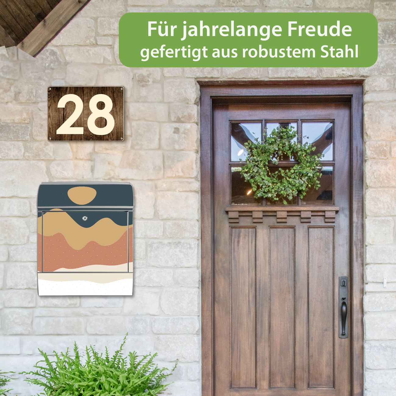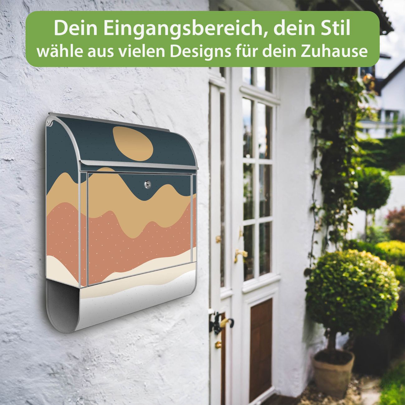 DESIGN: Der Postkasten mit Motiv Motiv Abstrakte Wüstenlandschaft hat ein sehr ansprechendes und ausgefallenes Design, damit entlocken Sie Ihren Nachbarn und dem Postboten ein Lächeln. Heben Sie Sich von der tristen grauen Masse ab, ohne auf Funktionalität zu verzichten. DETAILS: Der Postkasten besteht aus pulverbeschichtetem Stahl. Er ist 38x46x12,5cm groß. Das Motiv besteht aus einer wetter- und UV-resistenten Folie, die mit einem Schutzlaminat überzogen ist, sodass der Briefkasten zusätzlich vor Kratzern geschützt ist. Der Briefkasten wird mit Montagematerial, zusätzlich zwei Schlüssel sowie einer Bohrschablone geliefert. NUTZEN: Sie können diesen Briefkasten sowohl als Wandbriefkasten montieren oder einen passenden Ständer kaufen und als Standbriefkasten einbetonieren. Die Größe bietet genügend Platz für Sendungen aller Art, der Einwurf fasst auch größere A4 Sendungen. BANJADO: Ihr Briefkasten wird in Sachsen in einer kleinen Manufaktur von Hand veredelt. Die Motivfolie ist lösungsmittelfrei und schutzlaminiert für einen langen Halt. Wir legen großen Wert auf die Verbindung von Funktionalität und Design. Sie erhalten Handarbeit aus Sachsen.