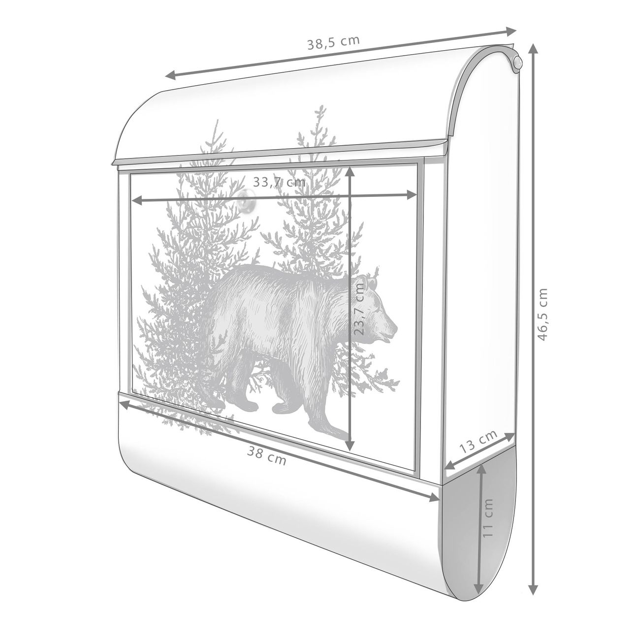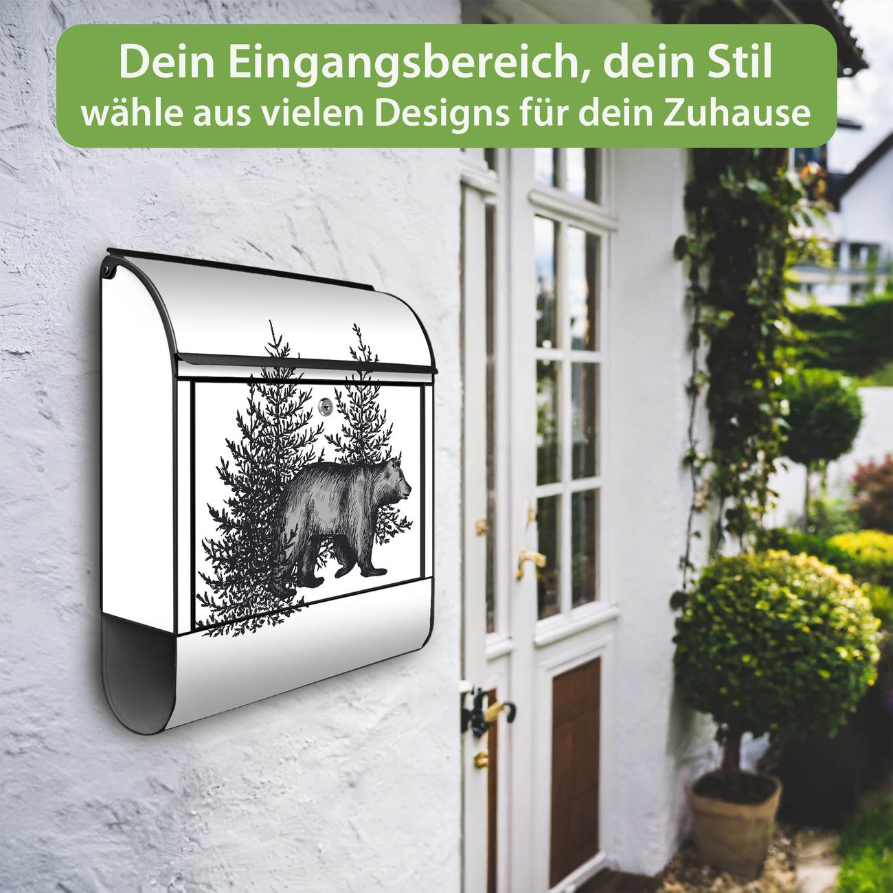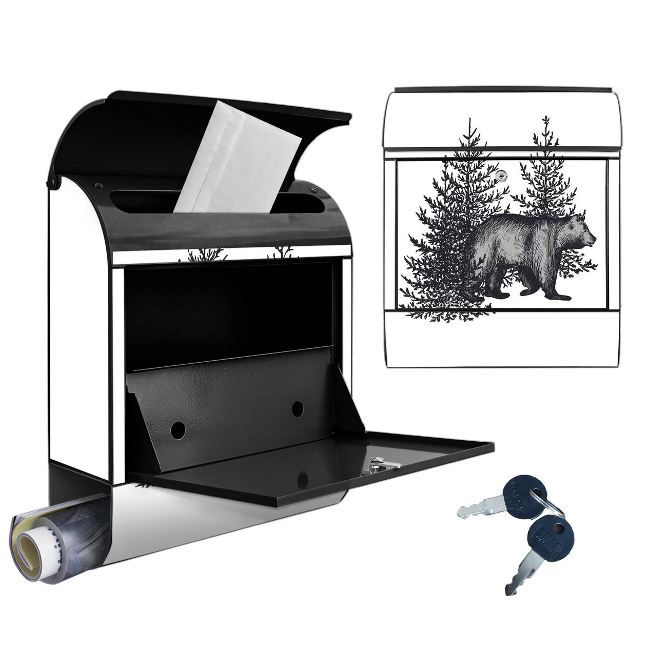 Großer Stahl Briefkasten Motiv Bär in Schwarz-Weiß