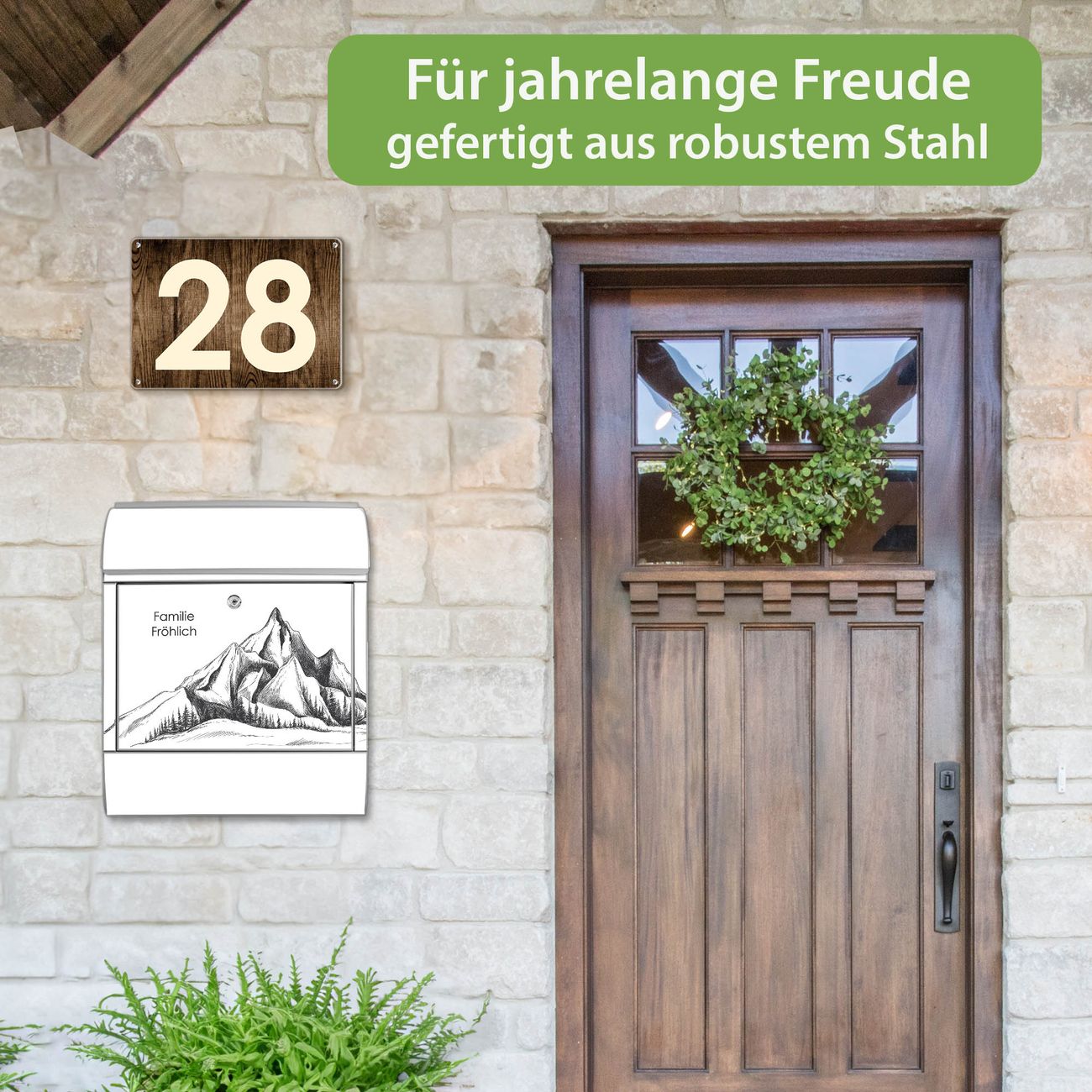 Der Vorschau-Text Familie Fröhlich wird durch Ihren persönlichen Wunschtext ersetzt. Die Schriftart und Farbe bleiben gleich wie in der Vorschau.