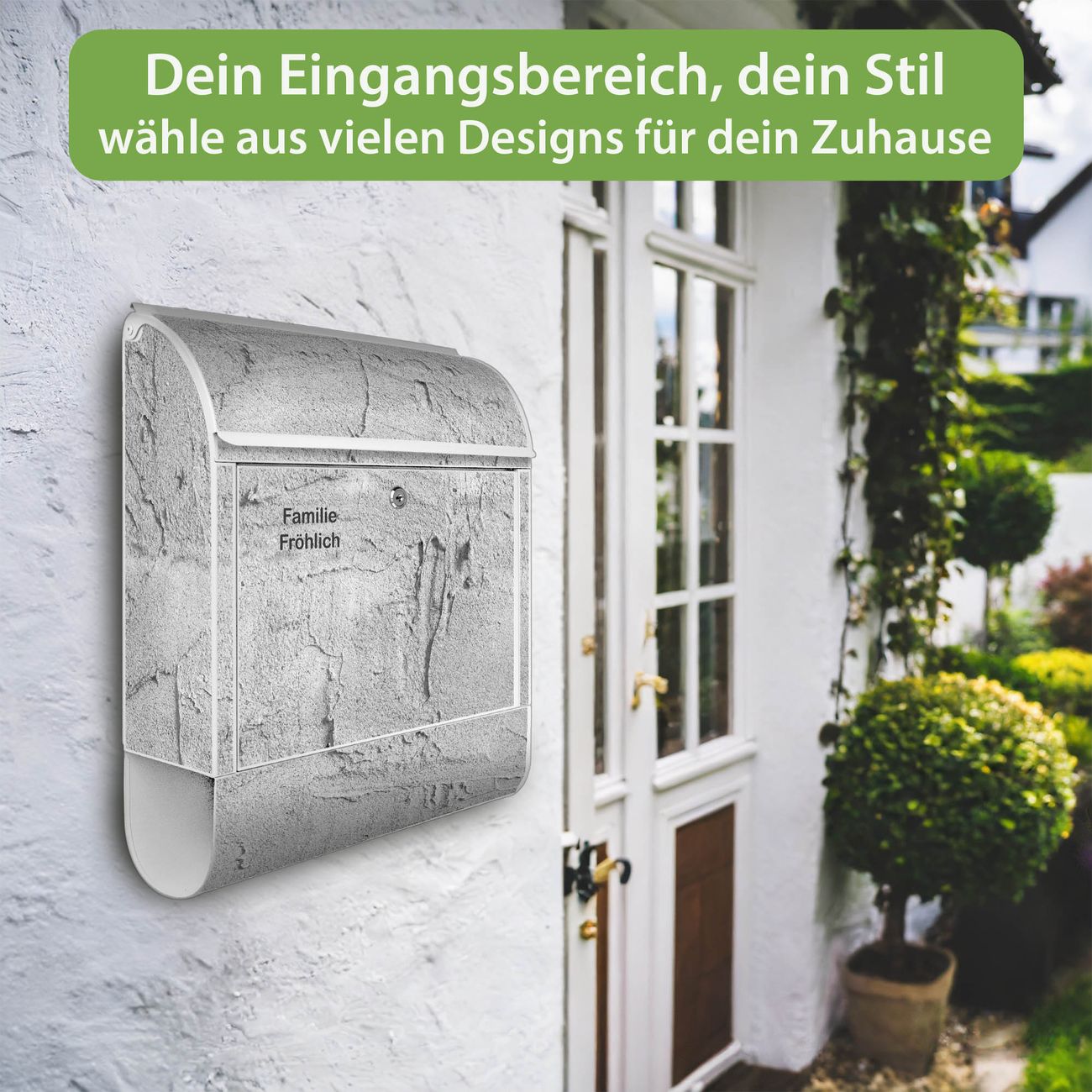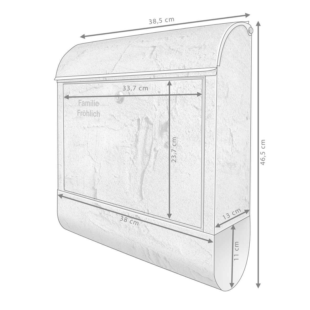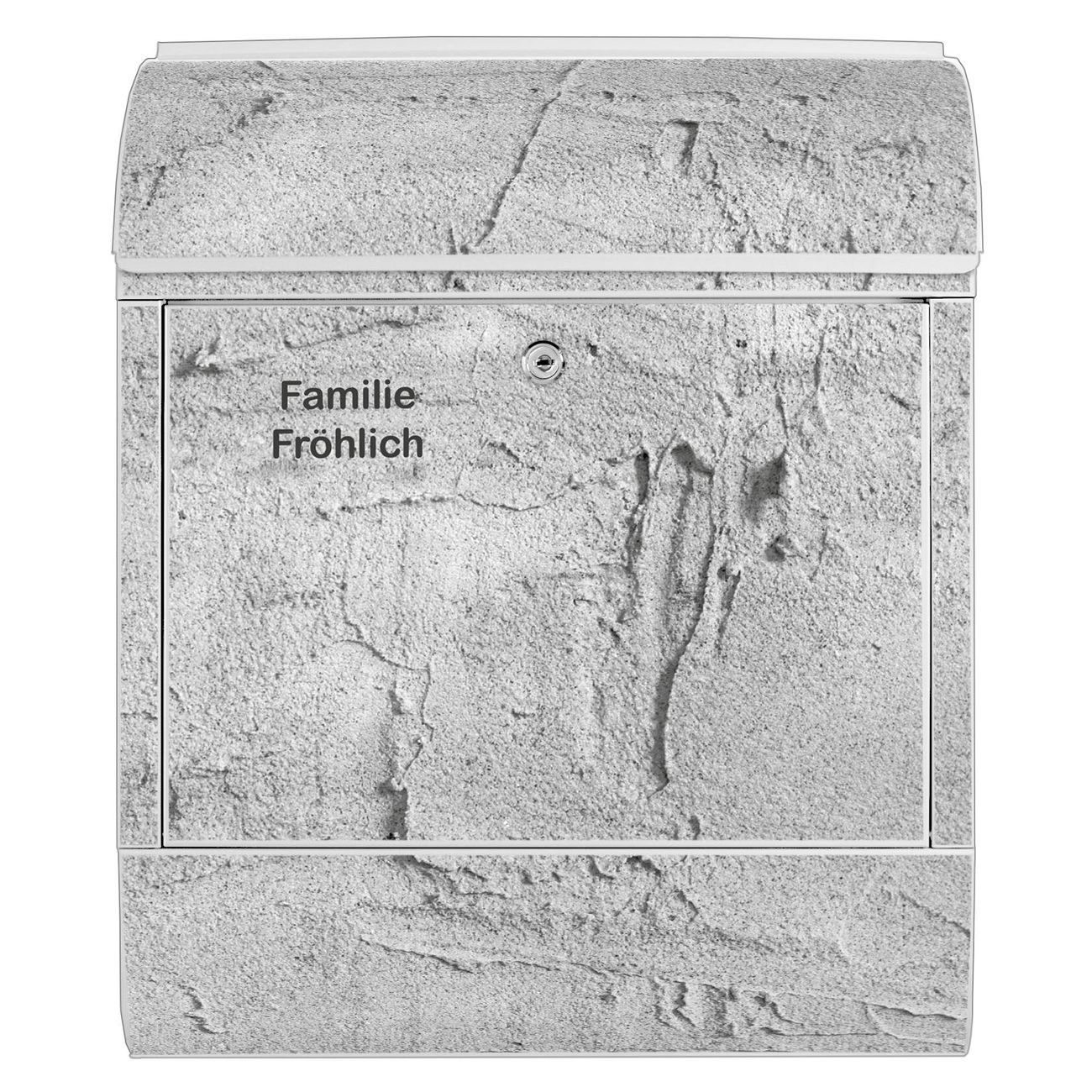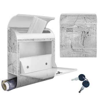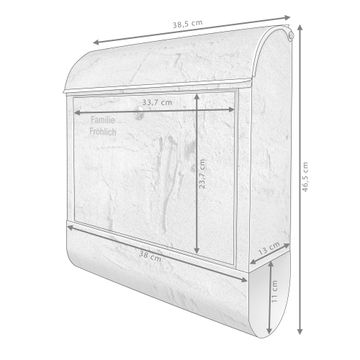 DESIGN: Der Postkasten mit Motiv Motiv Betonwand Struktur Grau hat ein sehr ansprechendes und ausgefallenes Design, damit entlocken Sie Ihren Nachbarn und dem Postboten ein Lächeln. Heben Sie Sich von der tristen grauen Masse ab, ohne auf Funktionalität zu verzichten. DETAILS: Der Postkasten besteht aus pulverbeschichtetem Stahl. Er ist 38x46x12,5cm groß. Das Motiv besteht aus einer wetter- und UV-resistenten Folie, die mit einem Schutzlaminat überzogen ist, sodass der Briefkasten zusätzlich vor Kratzern geschützt ist. Der Briefkasten wird mit Montagematerial, zusätzlich zwei Schlüssel sowie einer Bohrschablone geliefert. NUTZEN: Sie können diesen Briefkasten sowohl als Wandbriefkasten montieren oder einen passenden Ständer kaufen und als Standbriefkasten einbetonieren. Die Größe bietet genügend Platz für Sendungen aller Art, der Einwurf fasst auch größere A4 Sendungen. BANJADO: Ihr Briefkasten wird in Sachsen in einer kleinen Manufaktur von Hand veredelt. Die Motivfolie ist lösungsmittelfrei und schutzlaminiert für einen langen Halt. Wir legen großen Wert auf die Verbindung von Funktionalität und Design. Sie erhalten Handarbeit aus Sachsen.