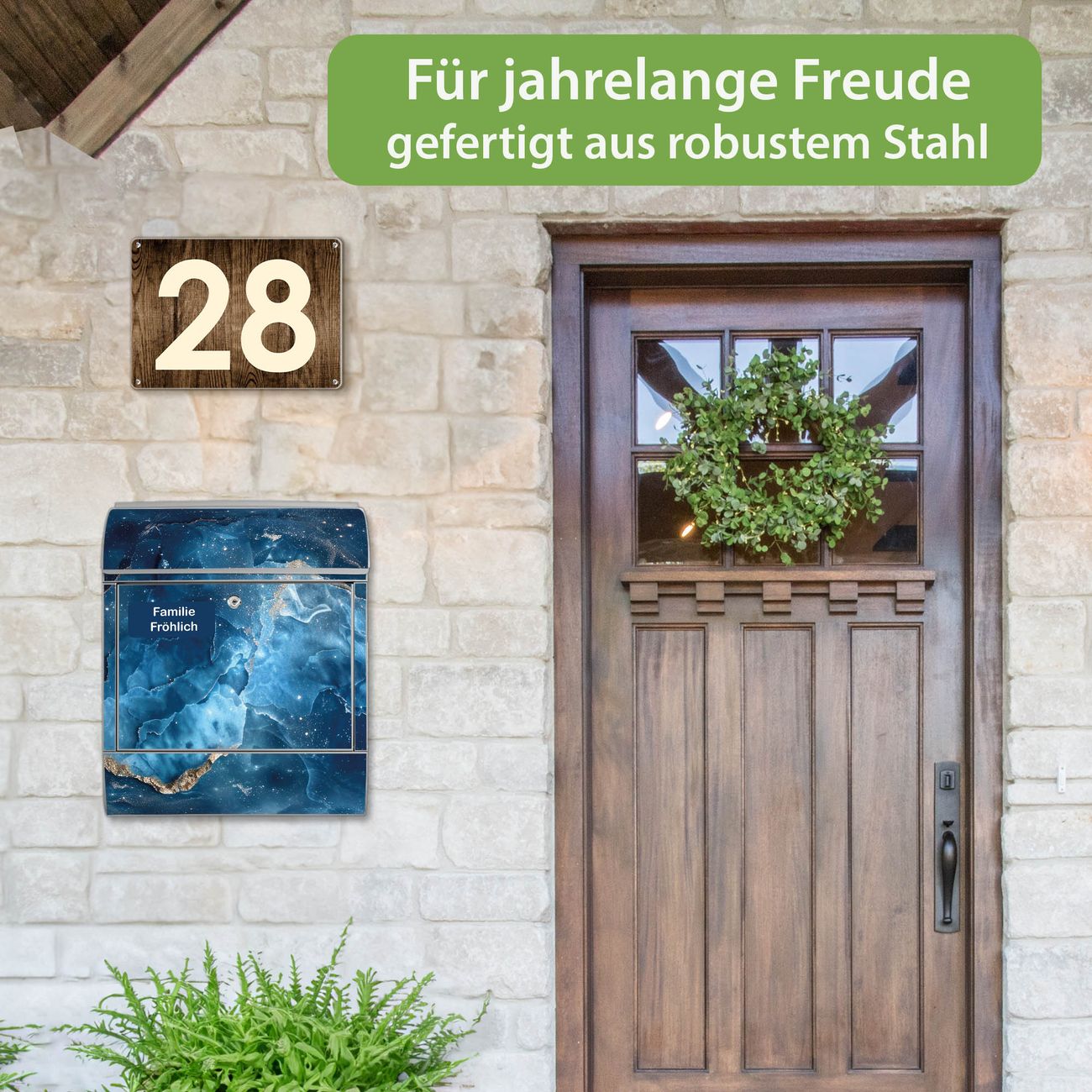 Der Vorschau-Text Familie Fröhlich wird durch Ihren persönlichen Wunschtext ersetzt. Die Schriftart und Farbe bleiben gleich wie in der Vorschau.