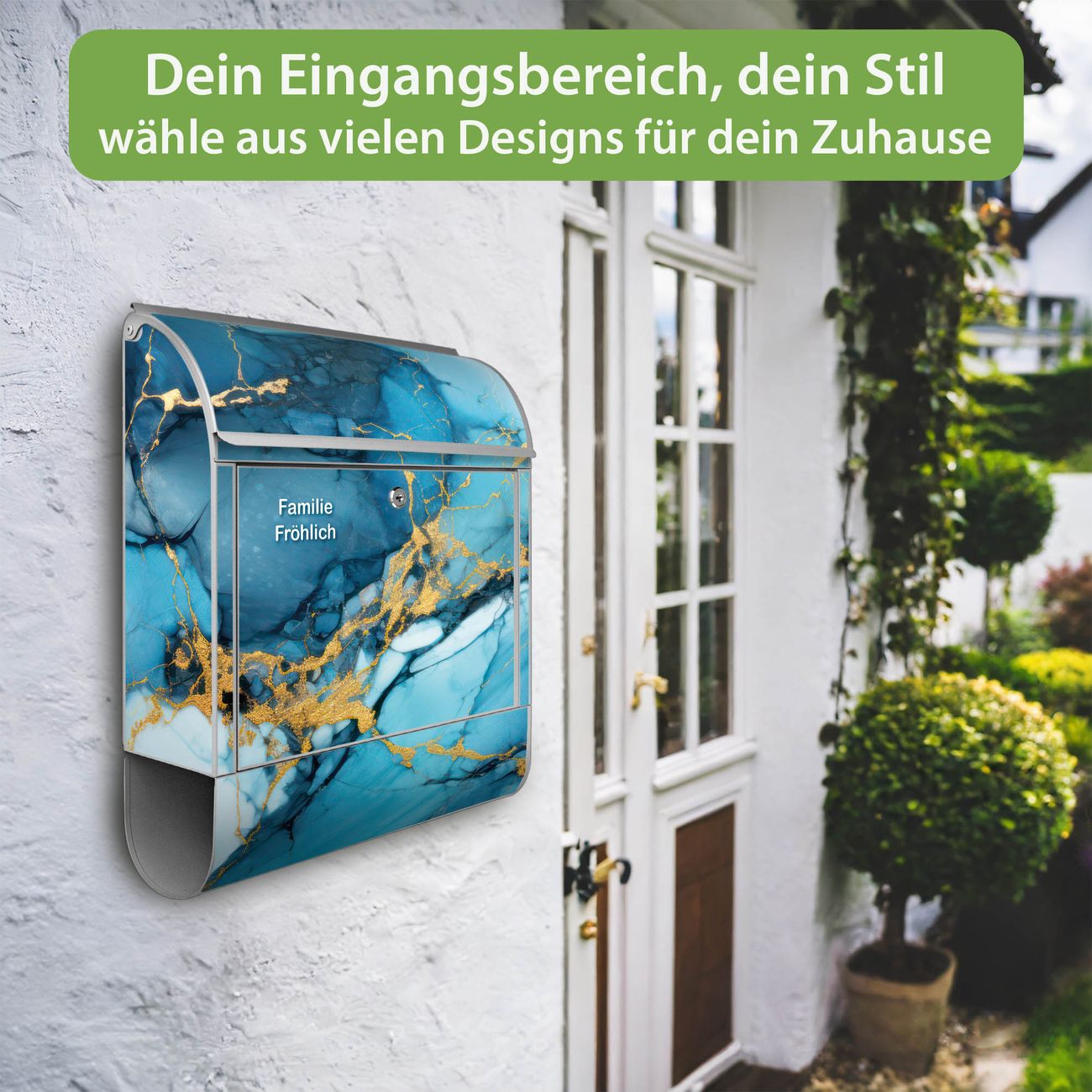 DESIGN: Der Postkasten mit Motiv Motiv Blauer Marmor mit Gold 2 hat ein sehr ansprechendes und ausgefallenes Design, damit entlocken Sie Ihren Nachbarn und dem Postboten ein Lächeln. Heben Sie Sich von der tristen grauen Masse ab, ohne auf Funktionalität zu verzichten. DETAILS: Der Postkasten besteht aus pulverbeschichtetem Stahl. Er ist 38x46x12,5cm groß. Das Motiv besteht aus einer wetter- und UV-resistenten Folie, die mit einem Schutzlaminat überzogen ist, sodass der Briefkasten zusätzlich vor Kratzern geschützt ist. Der Briefkasten wird mit Montagematerial, zusätzlich zwei Schlüssel sowie einer Bohrschablone geliefert. NUTZEN: Sie können diesen Briefkasten sowohl als Wandbriefkasten montieren oder einen passenden Ständer kaufen und als Standbriefkasten einbetonieren. Die Größe bietet genügend Platz für Sendungen aller Art, der Einwurf fasst auch größere A4 Sendungen. BANJADO: Ihr Briefkasten wird in Sachsen in einer kleinen Manufaktur von Hand veredelt. Die Motivfolie ist lösungsmittelfrei und schutzlaminiert für einen langen Halt. Wir legen großen Wert auf die Verbindung von Funktionalität und Design. Sie erhalten Handarbeit aus Sachsen.