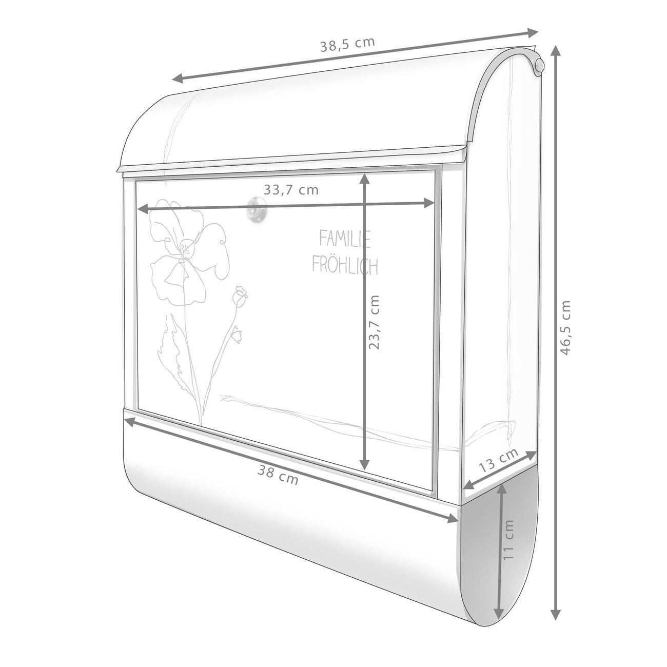 DESIGN: Der Postkasten mit Motiv Motiv Blumenrahmen Skizze hat ein sehr ansprechendes und ausgefallenes Design, damit entlocken Sie Ihren Nachbarn und dem Postboten ein Lächeln. Heben Sie Sich von der tristen grauen Masse ab, ohne auf Funktionalität zu verzichten. DETAILS: Der Postkasten besteht aus pulverbeschichtetem Stahl. Er ist 38x46x12,5cm groß. Das Motiv besteht aus einer wetter- und UV-resistenten Folie, die mit einem Schutzlaminat überzogen ist, sodass der Briefkasten zusätzlich vor Kratzern geschützt ist. Der Briefkasten wird mit Montagematerial, zusätzlich zwei Schlüssel sowie einer Bohrschablone geliefert. NUTZEN: Sie können diesen Briefkasten sowohl als Wandbriefkasten montieren oder einen passenden Ständer kaufen und als Standbriefkasten einbetonieren. Die Größe bietet genügend Platz für Sendungen aller Art, der Einwurf fasst auch größere A4 Sendungen. BANJADO: Ihr Briefkasten wird in Sachsen in einer kleinen Manufaktur von Hand veredelt. Die Motivfolie ist lösungsmittelfrei und schutzlaminiert für einen langen Halt. Wir legen großen Wert auf die Verbindung von Funktionalität und Design. Sie erhalten Handarbeit aus Sachsen.