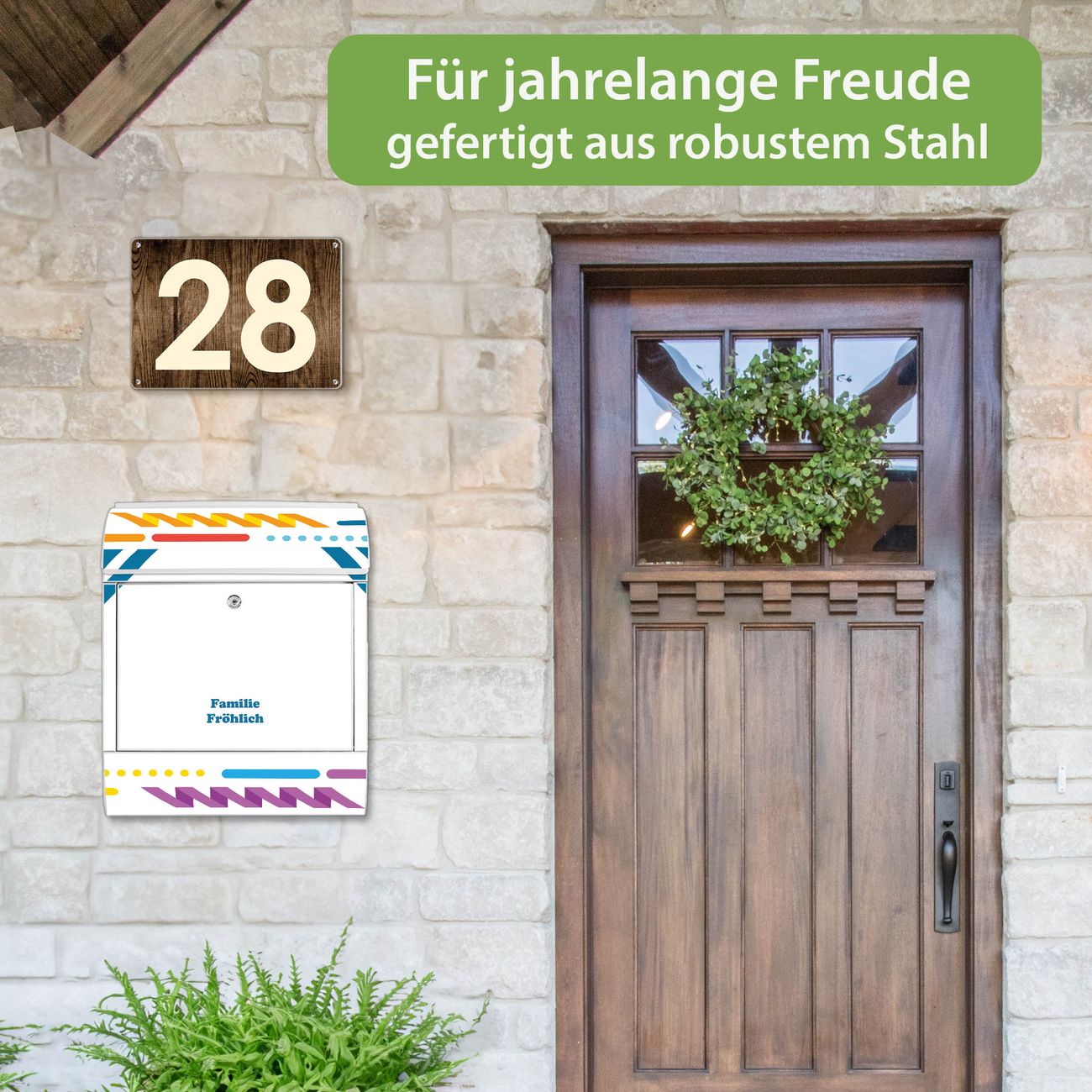 DESIGN: Der Postkasten mit Motiv Motiv Bunter Geometrischer Rahmen hat ein sehr ansprechendes und ausgefallenes Design, damit entlocken Sie Ihren Nachbarn und dem Postboten ein Lächeln. Heben Sie Sich von der tristen grauen Masse ab, ohne auf Funktionalität zu verzichten. DETAILS: Der Postkasten besteht aus pulverbeschichtetem Stahl. Er ist 38x46x12,5cm groß. Das Motiv besteht aus einer wetter- und UV-resistenten Folie, die mit einem Schutzlaminat überzogen ist, sodass der Briefkasten zusätzlich vor Kratzern geschützt ist. Der Briefkasten wird mit Montagematerial, zusätzlich zwei Schlüssel sowie einer Bohrschablone geliefert. NUTZEN: Sie können diesen Briefkasten sowohl als Wandbriefkasten montieren oder einen passenden Ständer kaufen und als Standbriefkasten einbetonieren. Die Größe bietet genügend Platz für Sendungen aller Art, der Einwurf fasst auch größere A4 Sendungen. BANJADO: Ihr Briefkasten wird in Sachsen in einer kleinen Manufaktur von Hand veredelt. Die Motivfolie ist lösungsmittelfrei und schutzlaminiert für einen langen Halt. Wir legen großen Wert auf die Verbindung von Funktionalität und Design. Sie erhalten Handarbeit aus Sachsen.